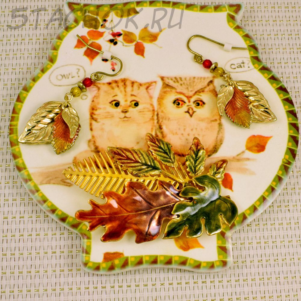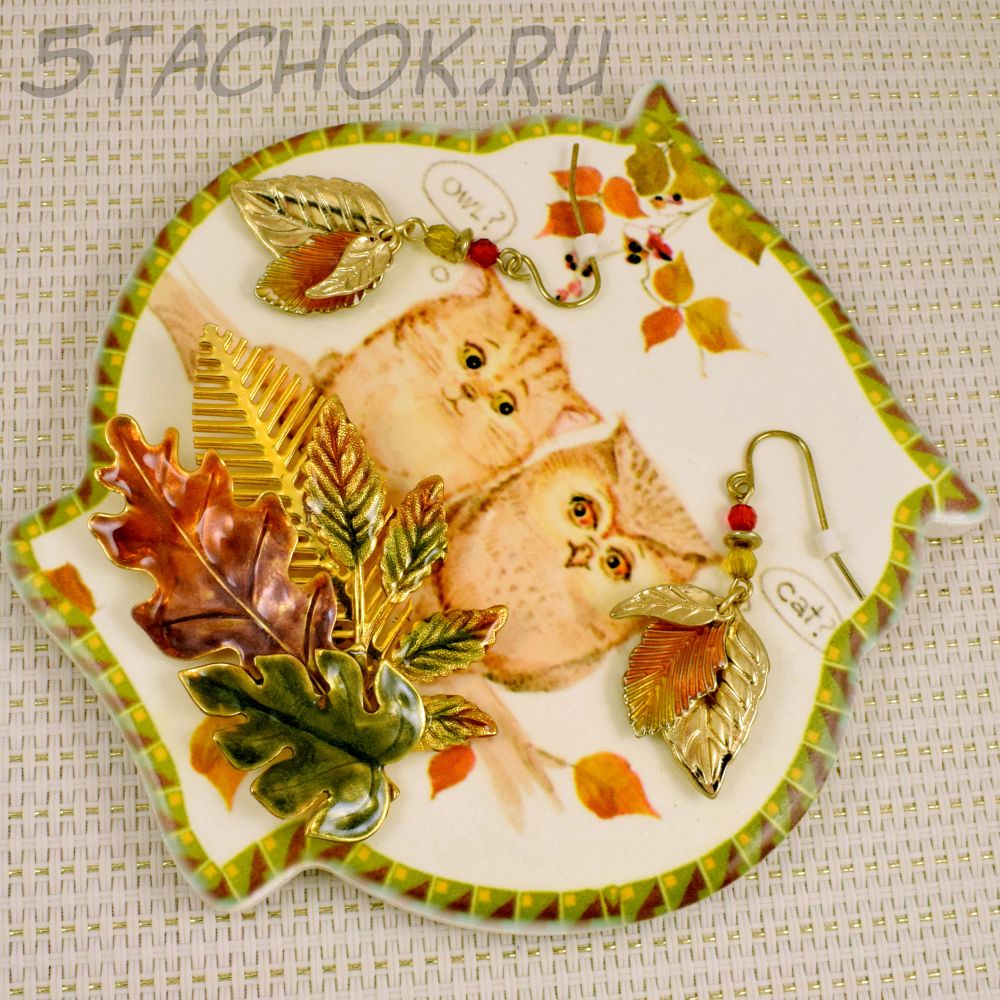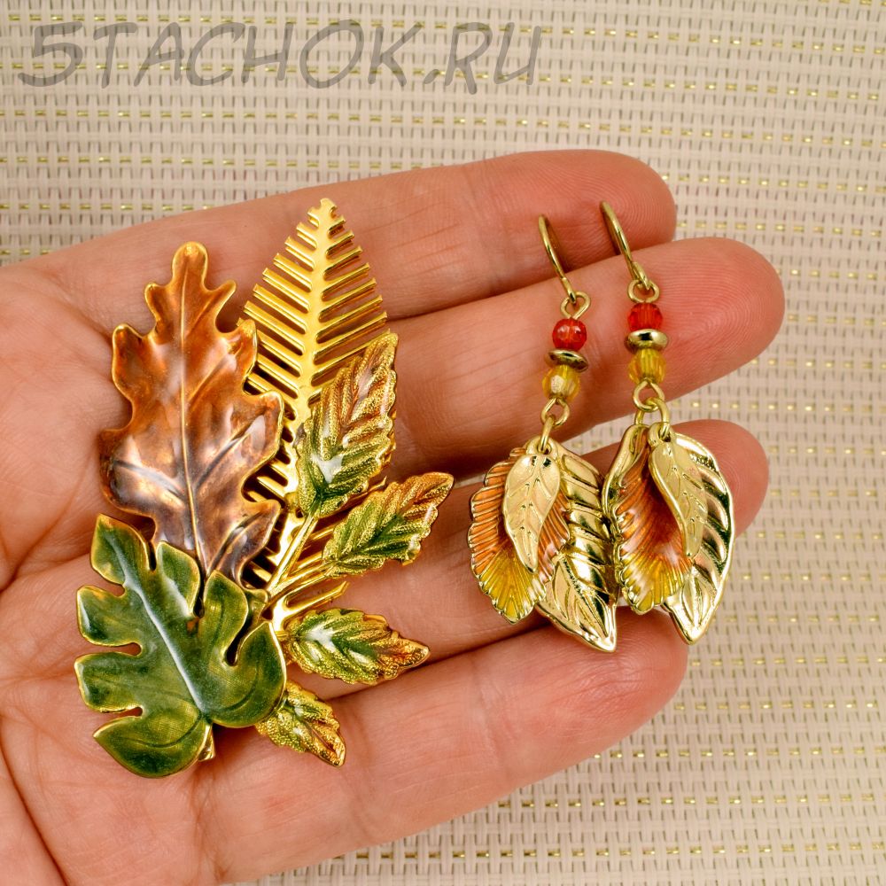 "Осенняя пора, очей очарование..." Выполнен под блестящую золотую чеканку с использованием перламутровой эмали оранжевого, охристого и зеленого цветов. У дужки серег - желтенькие и красненькие граненые стразики. У листиков прорисованы жилки и фактура листочков.