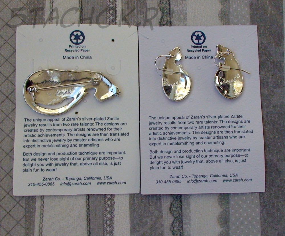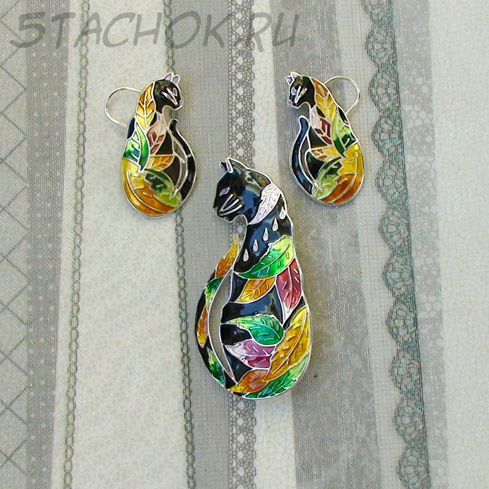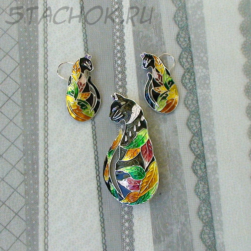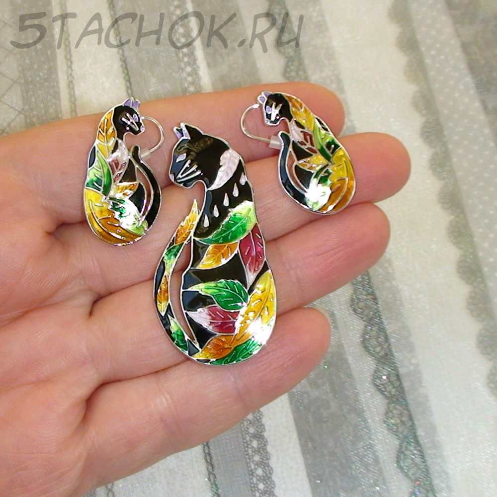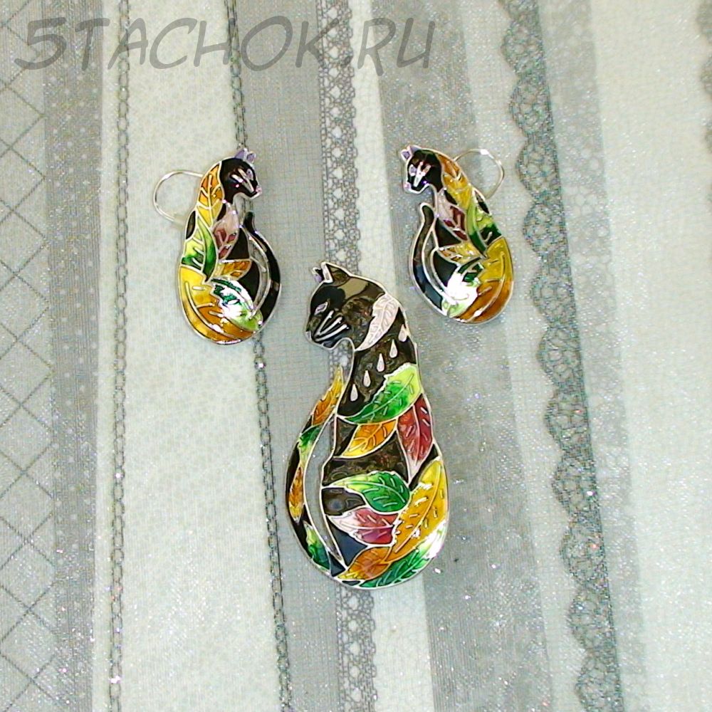Брошь и серьги "Осенняя кошка" серебро/эмаль