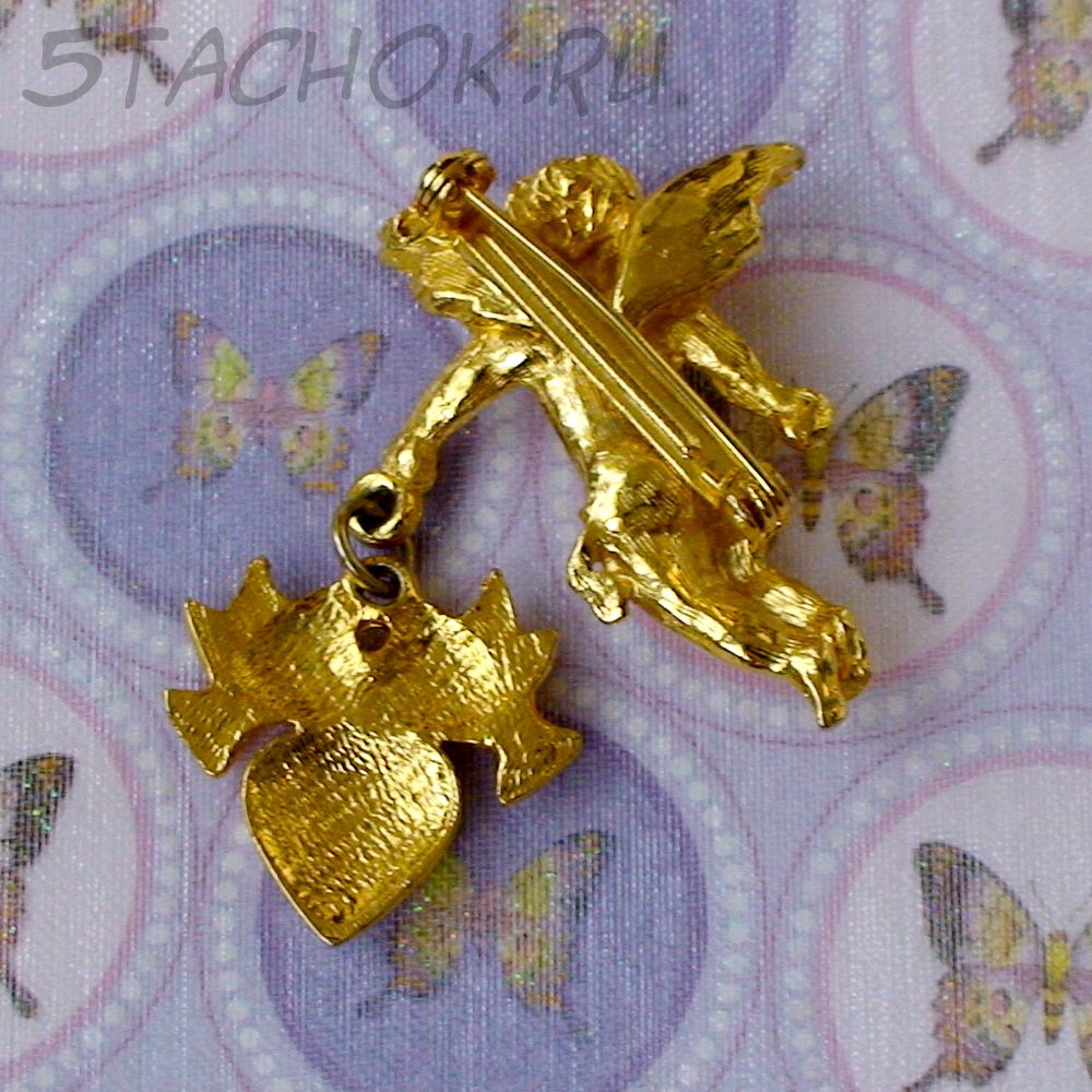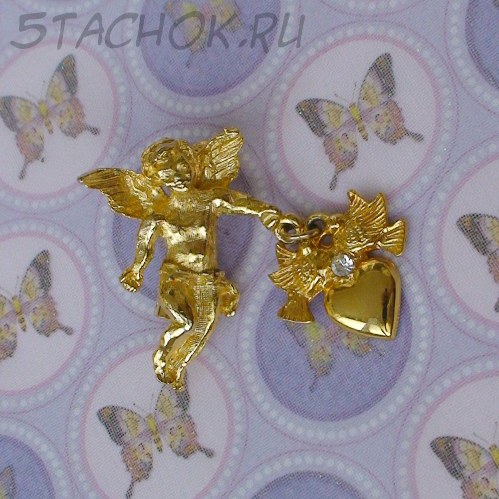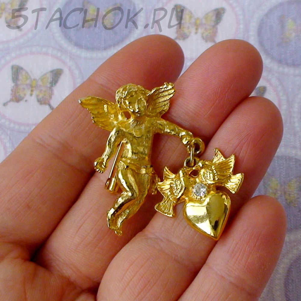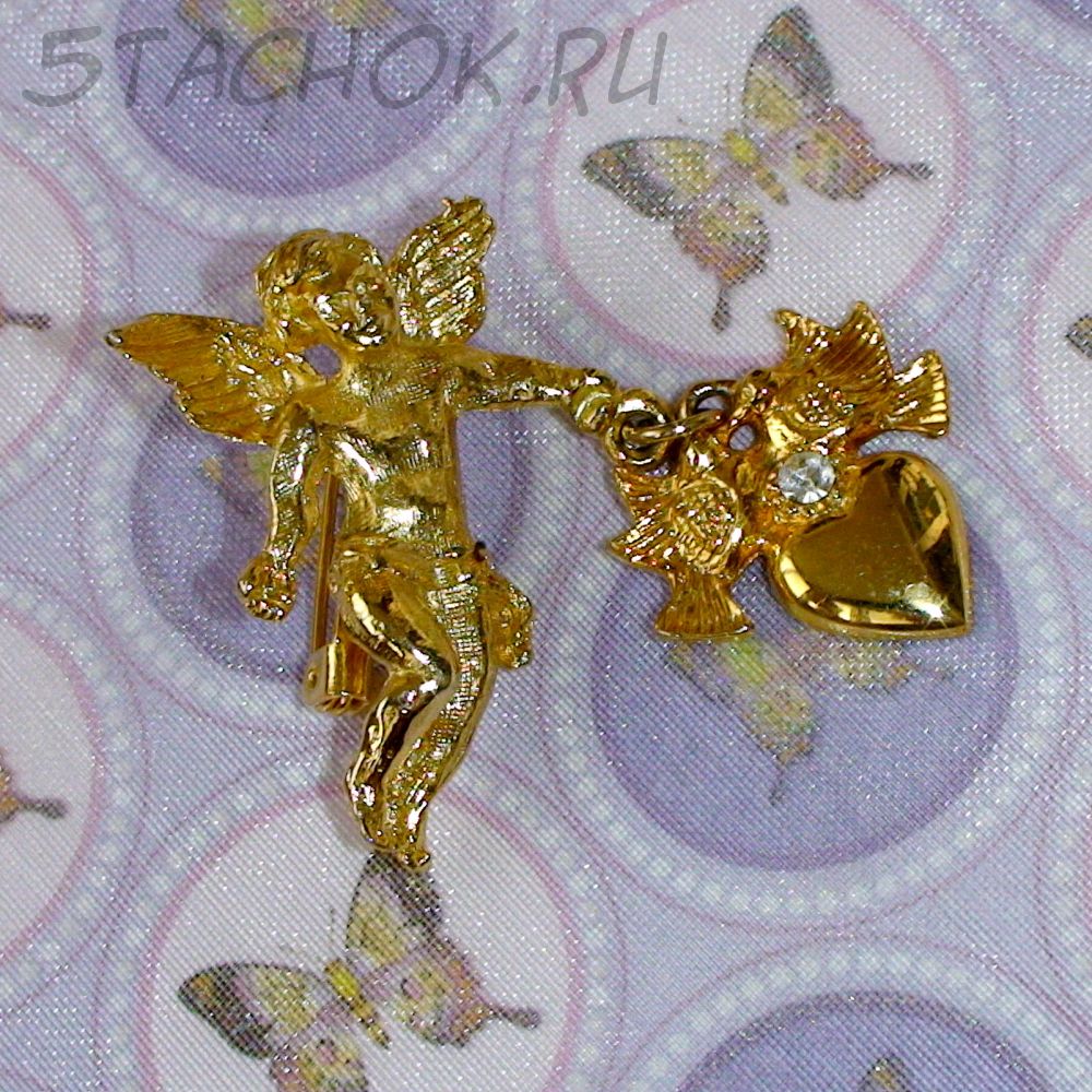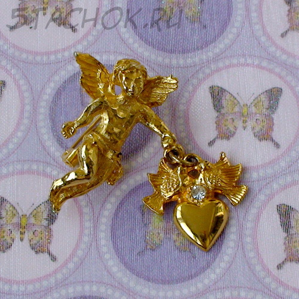 Брошь "Ангел с сердечком и с голубками" под золото, стразы