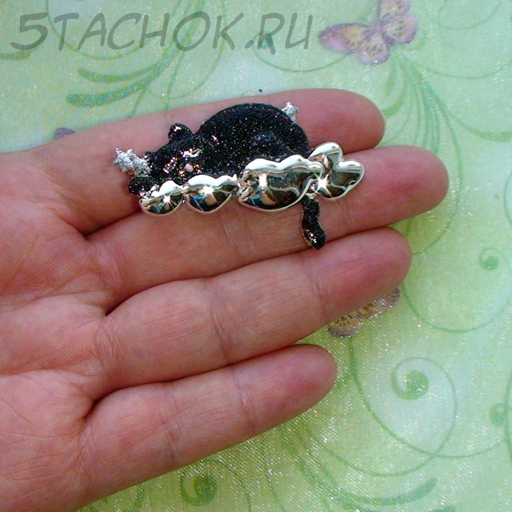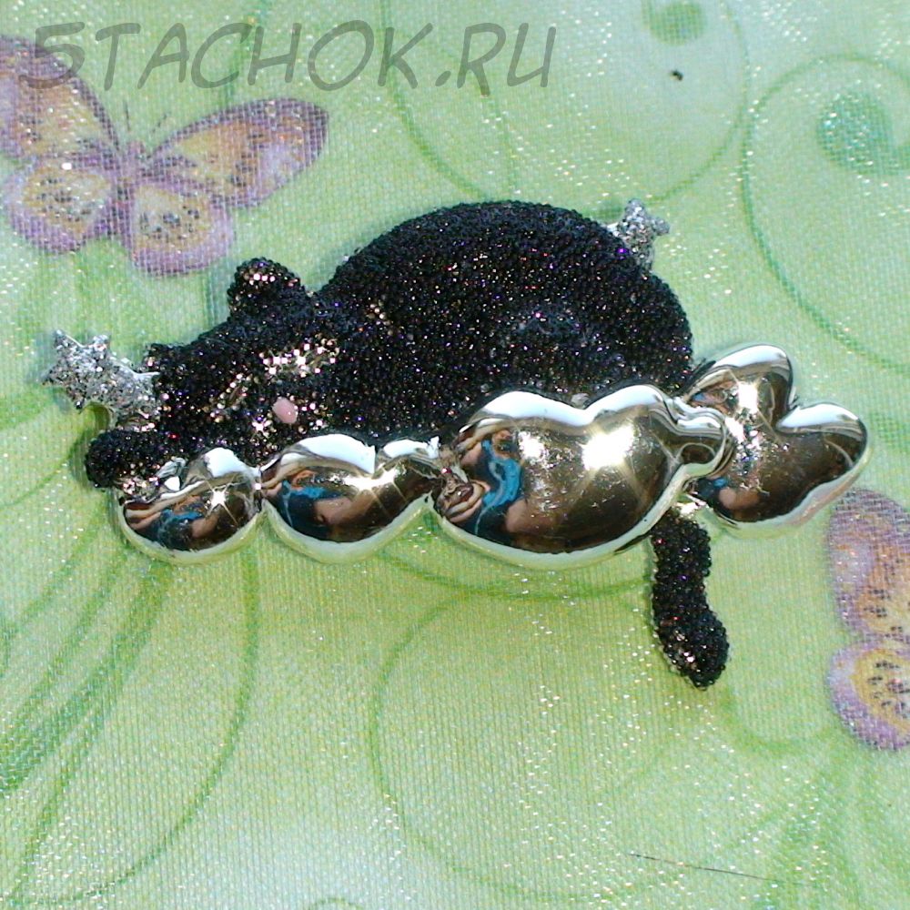 Брошь "Черный котик спит на облаке" под серебро/крошка