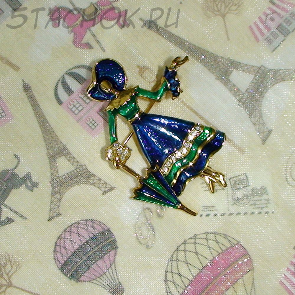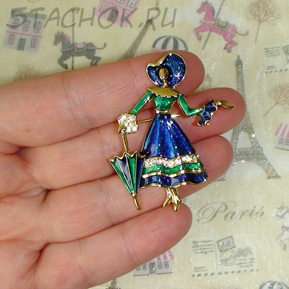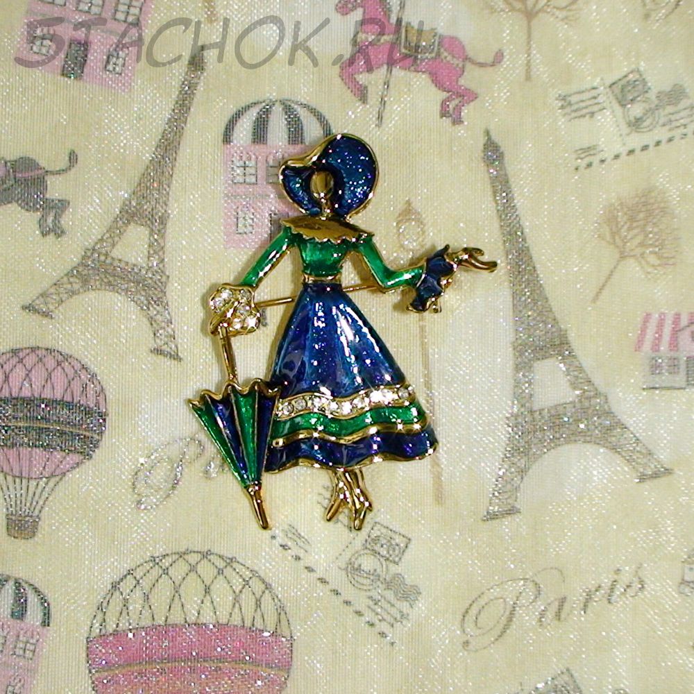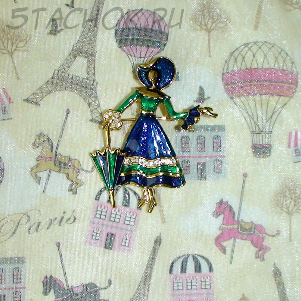 Брошь "Дама с зонтиком на прогулке" под золото/эмаль/стразы