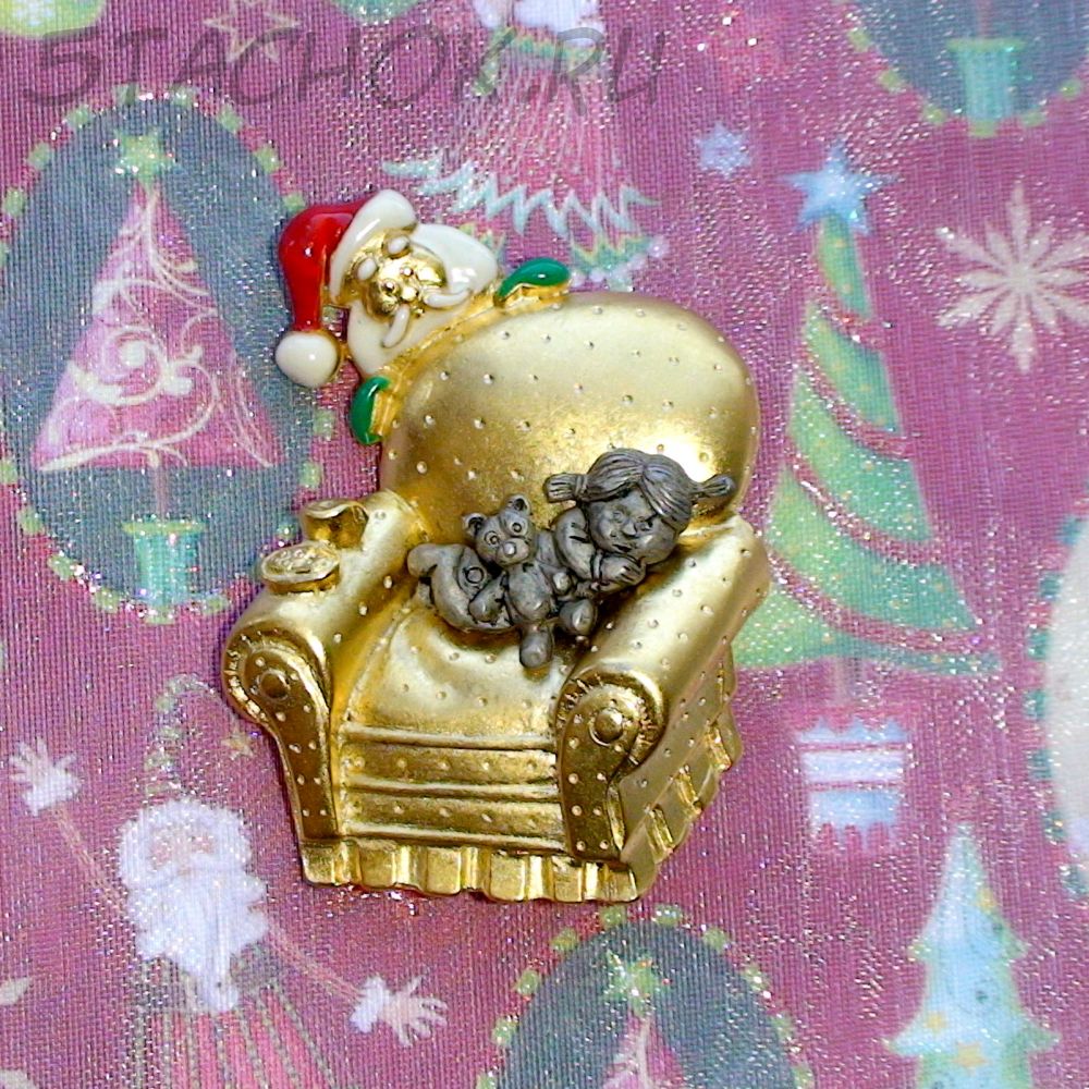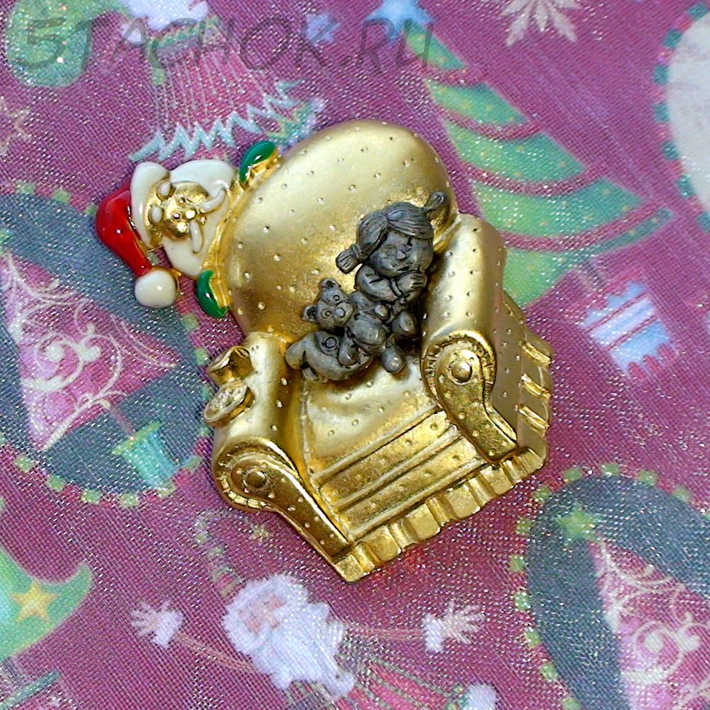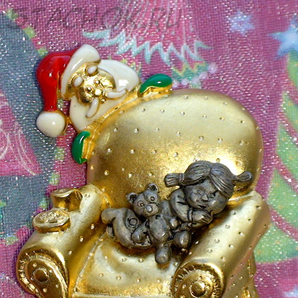 Выполнена под матовое золото с использованием блестящей эмали ярких цветов. Маленькая девочка с мишкой уснула в кресле, ожидая Санту с подарками. Но он все-таки пришел и принес для нее подарочки!