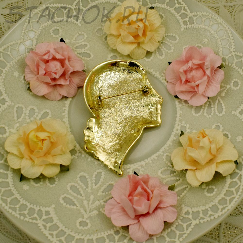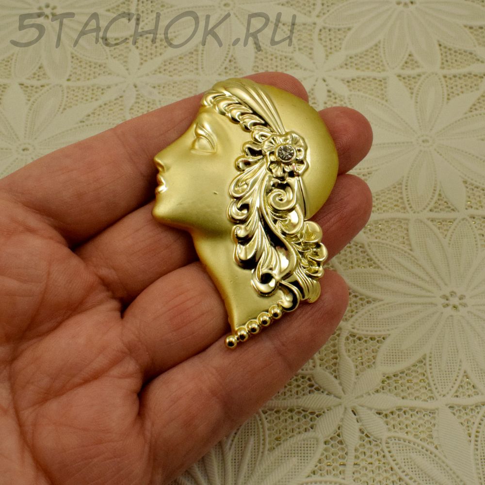 Прекрасная и редкая брошка в ретро-стиле. Выполнена в цвете матового и блестящего золота. Очень красивая девушка мечтательно смотрит ввысь. У нее прекрасный головной убор с камушком и бусы на шее. Можно подобрать вторую брошку - объект, на который обращен ее взгляд. Размер брошки 4,5*6см Коллекционная винтажная бижутерия 1970-е годы. Брошь в хорошем винтажном состоянии. Производство США Немаркирована.