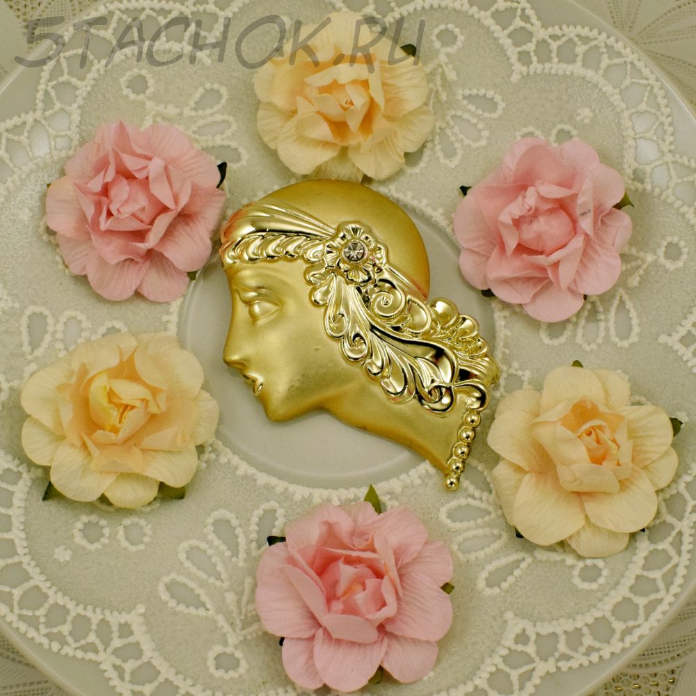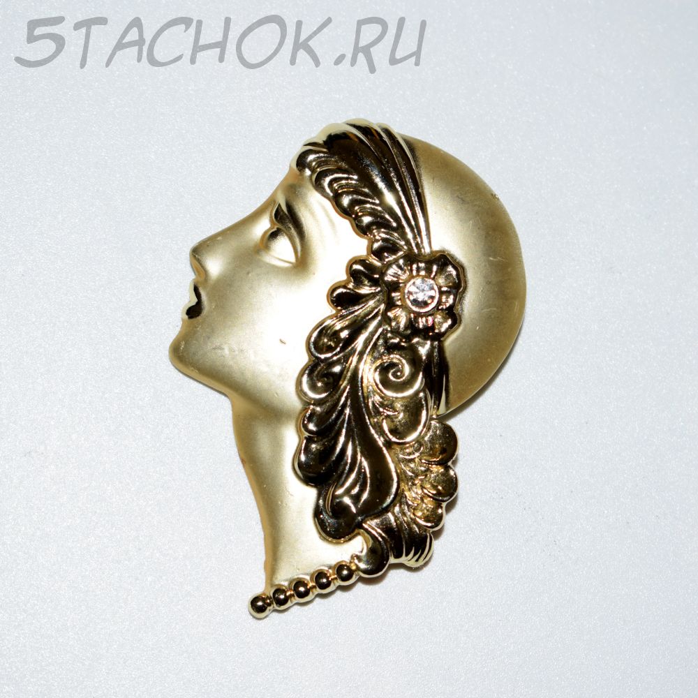 Прекрасная и редкая брошка в ретро-стиле. Выполнена в цвете матового и блестящего золота. Очень красивая девушка мечтательно смотрит ввысь. У нее прекрасный головной убор с камушком и бусы на шее. Можно подобрать вторую брошку - объект, на который обращен ее взгляд.
