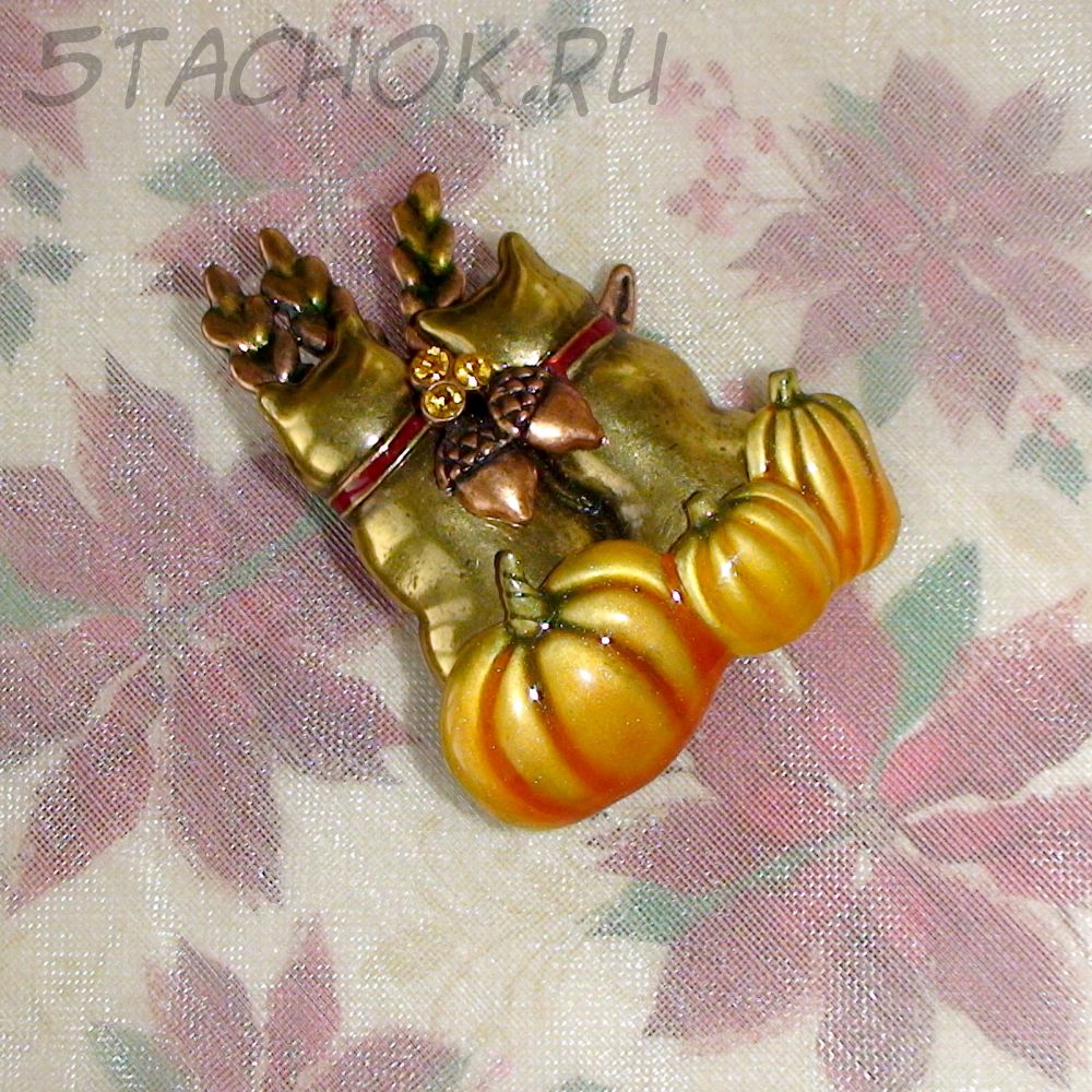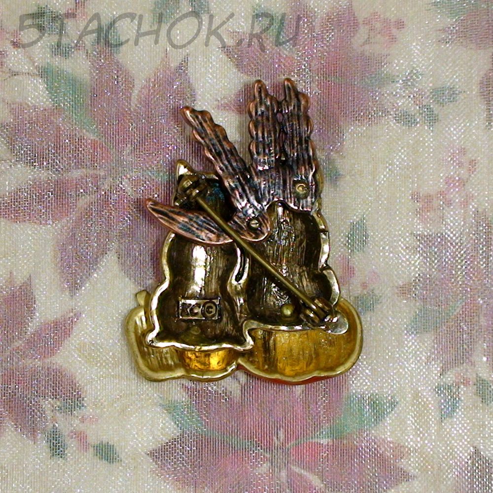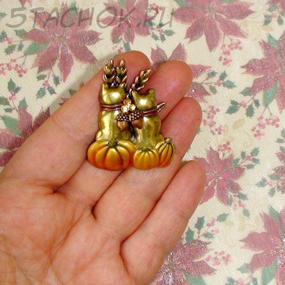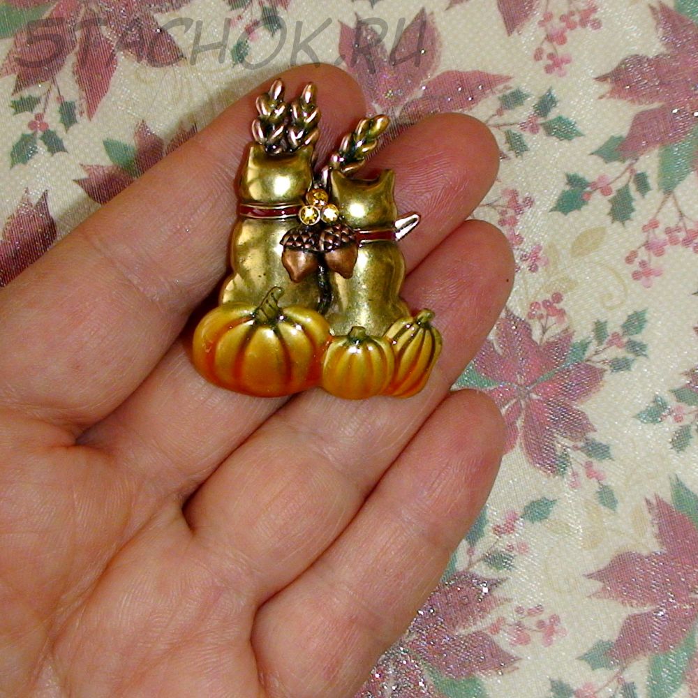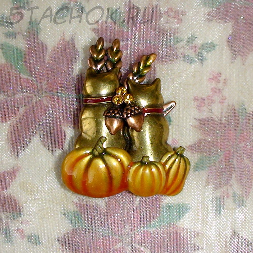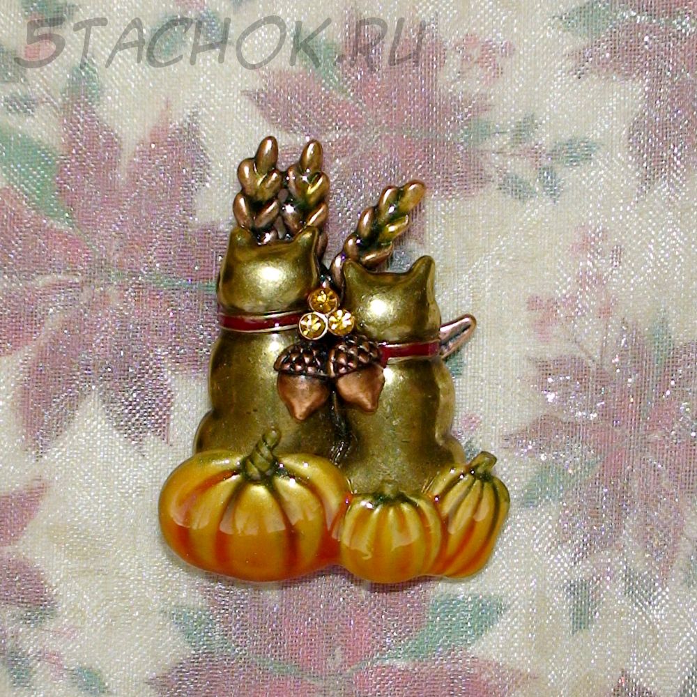 Брошь "Два котика и урожай" под бронзу, медь, эмаль, стразы
