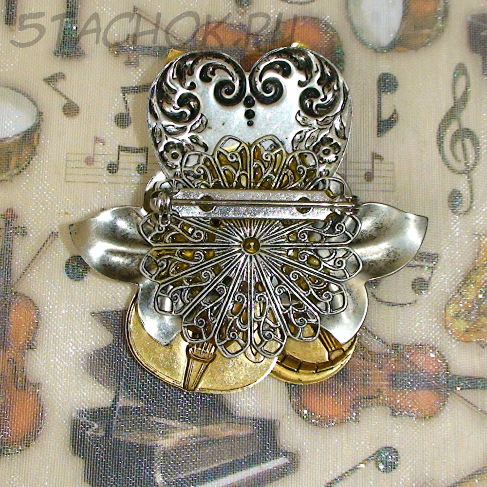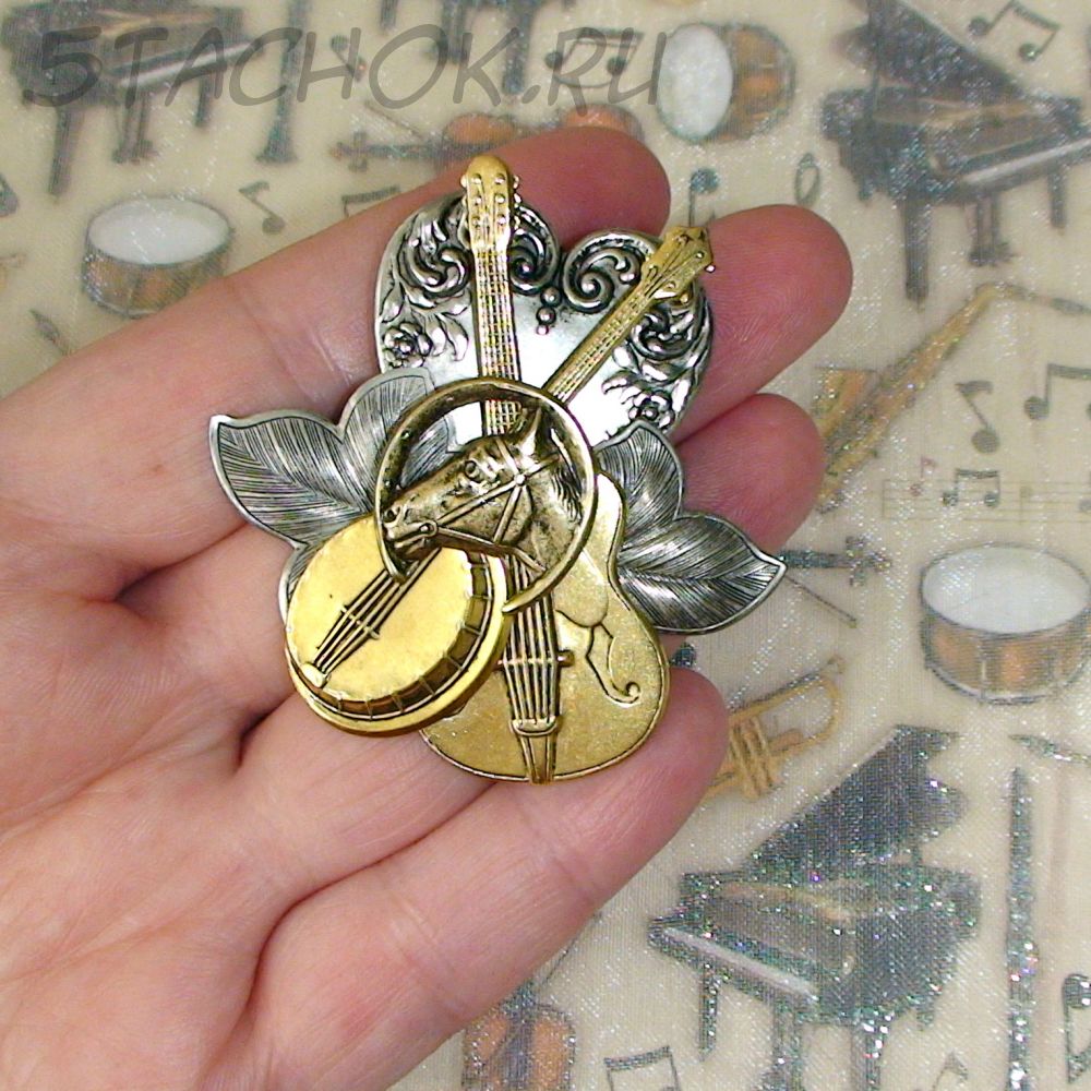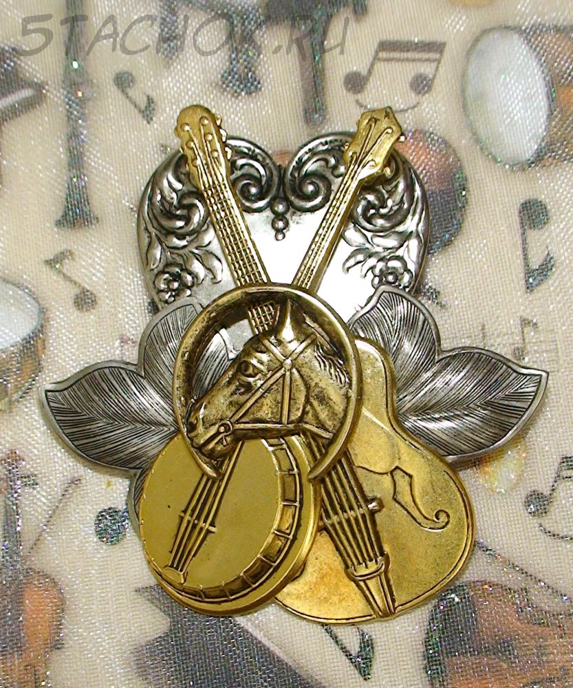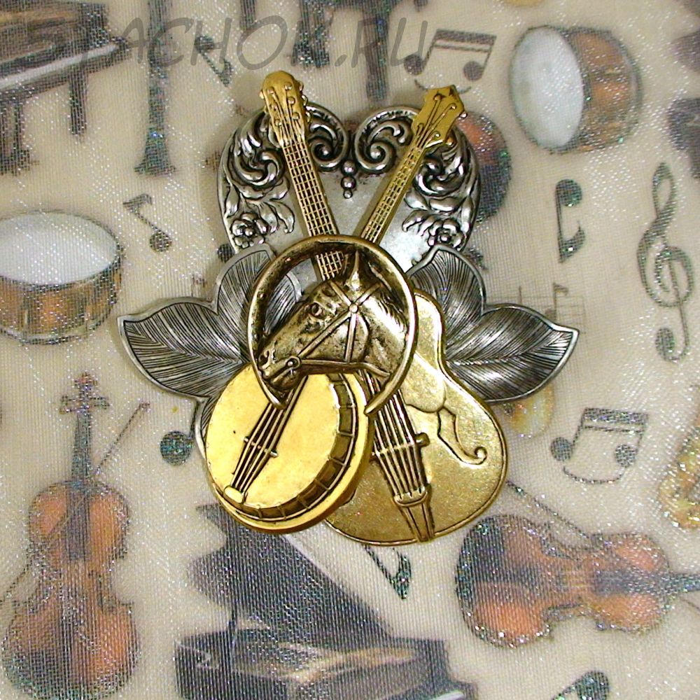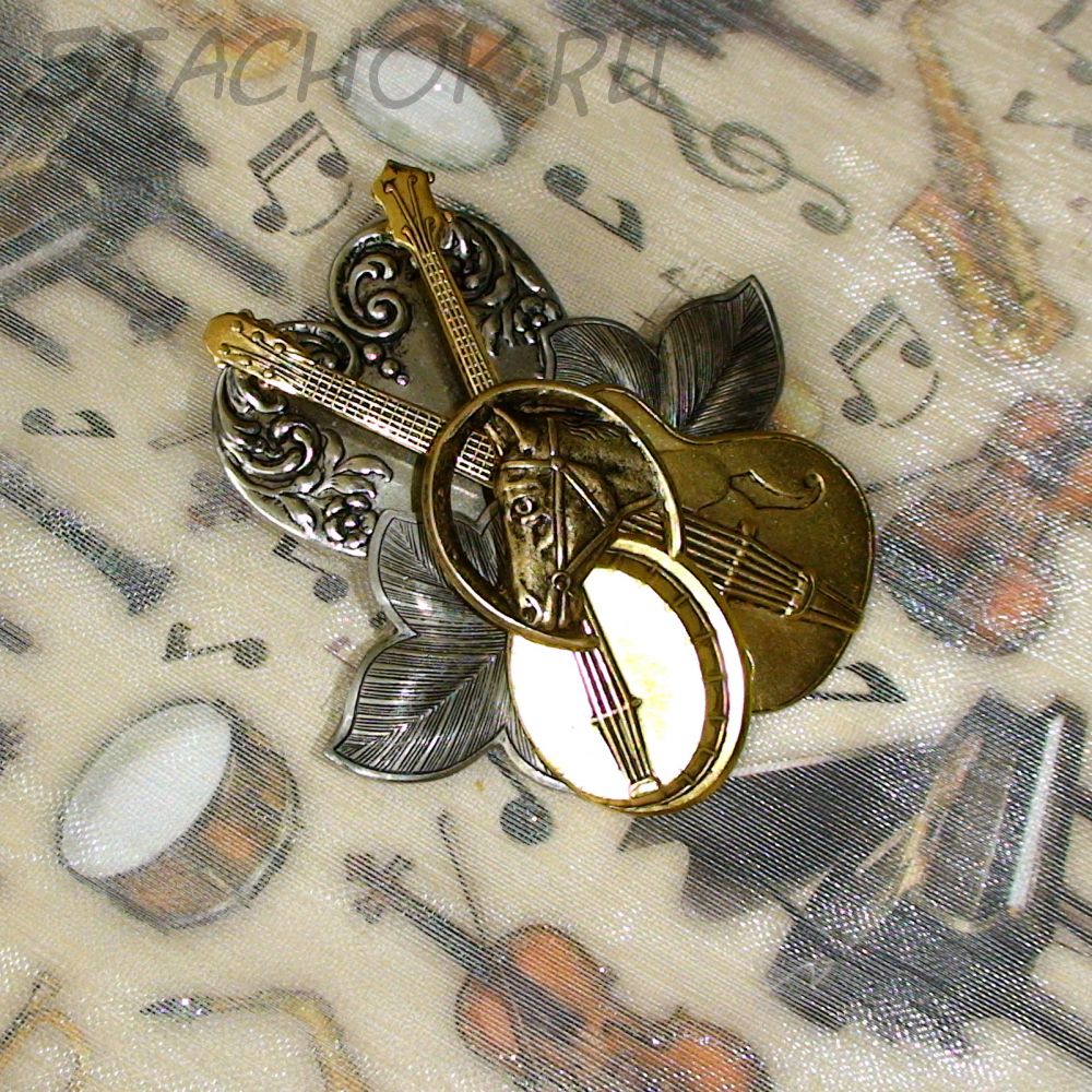 На брошке изображены музыкальные инструменты: джазовая гитара, банджо, лошадиная голова и подкова. Все вместе это символизирует народный музыкальный стиль Америки - кантри.