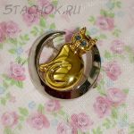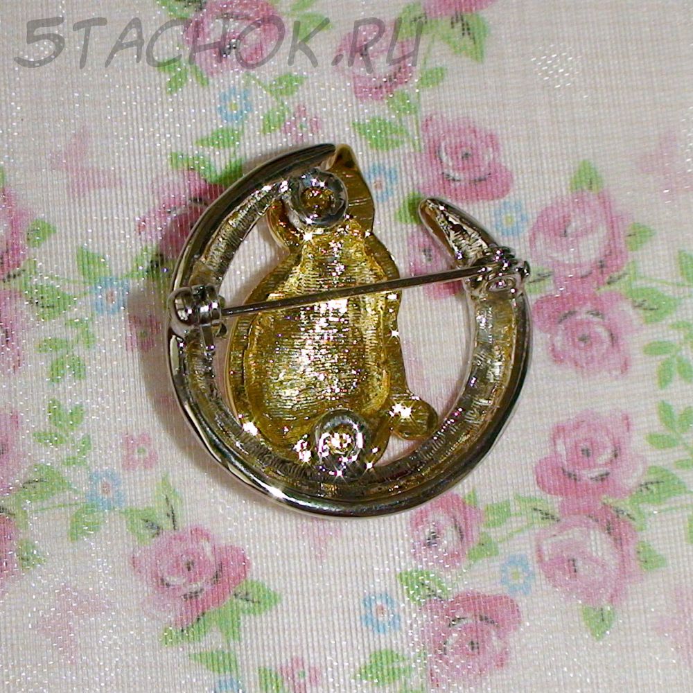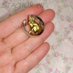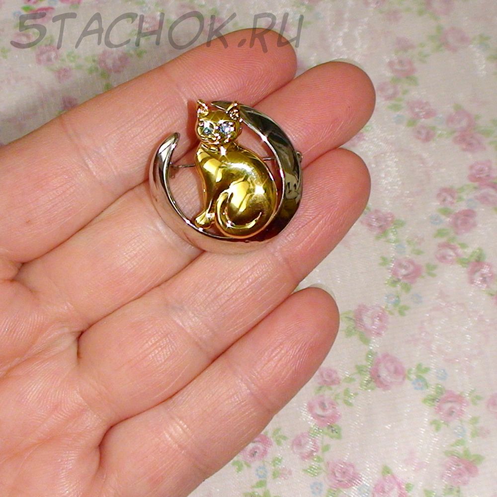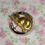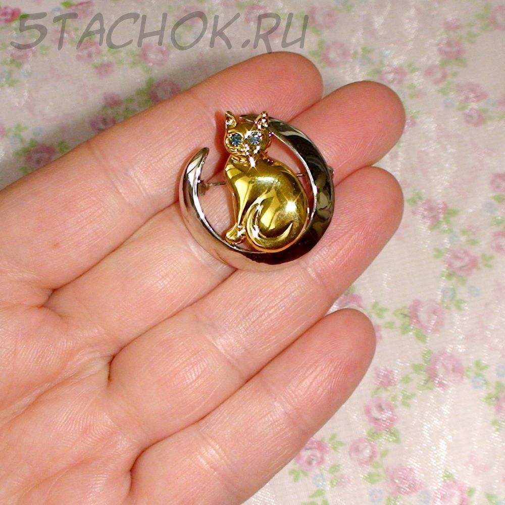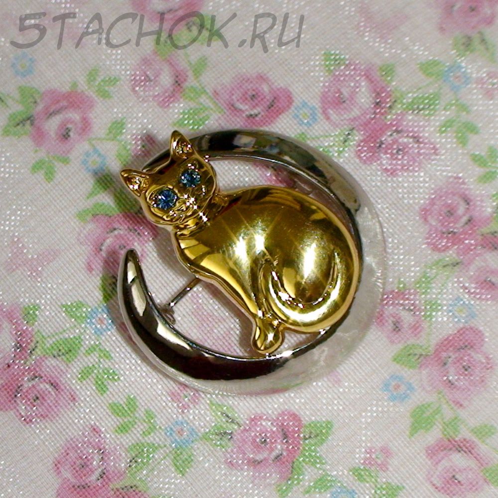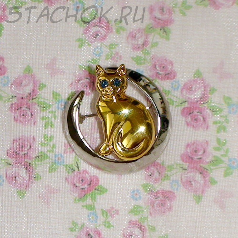 Брошь "Киска на полумесяце" под золото/серебро/сваровски