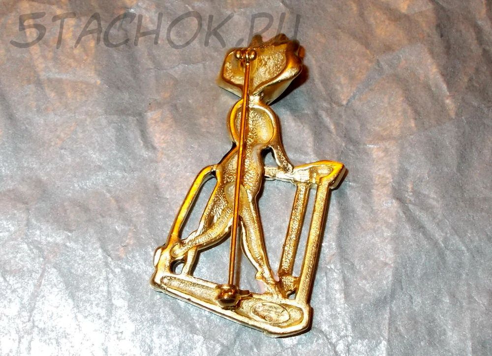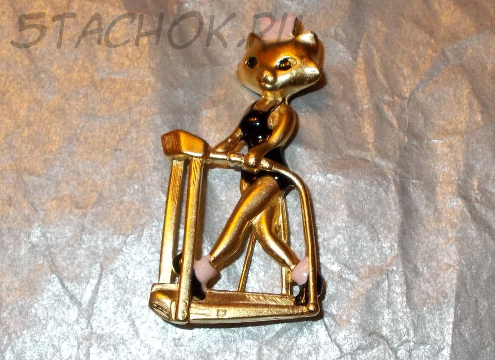 Очаровательная брошь, довольно редкая! Выполнена под матовое и блестящее золото. Глазки кисы из черной эмали. Киса занимается фитнесом в тренажерном зале.