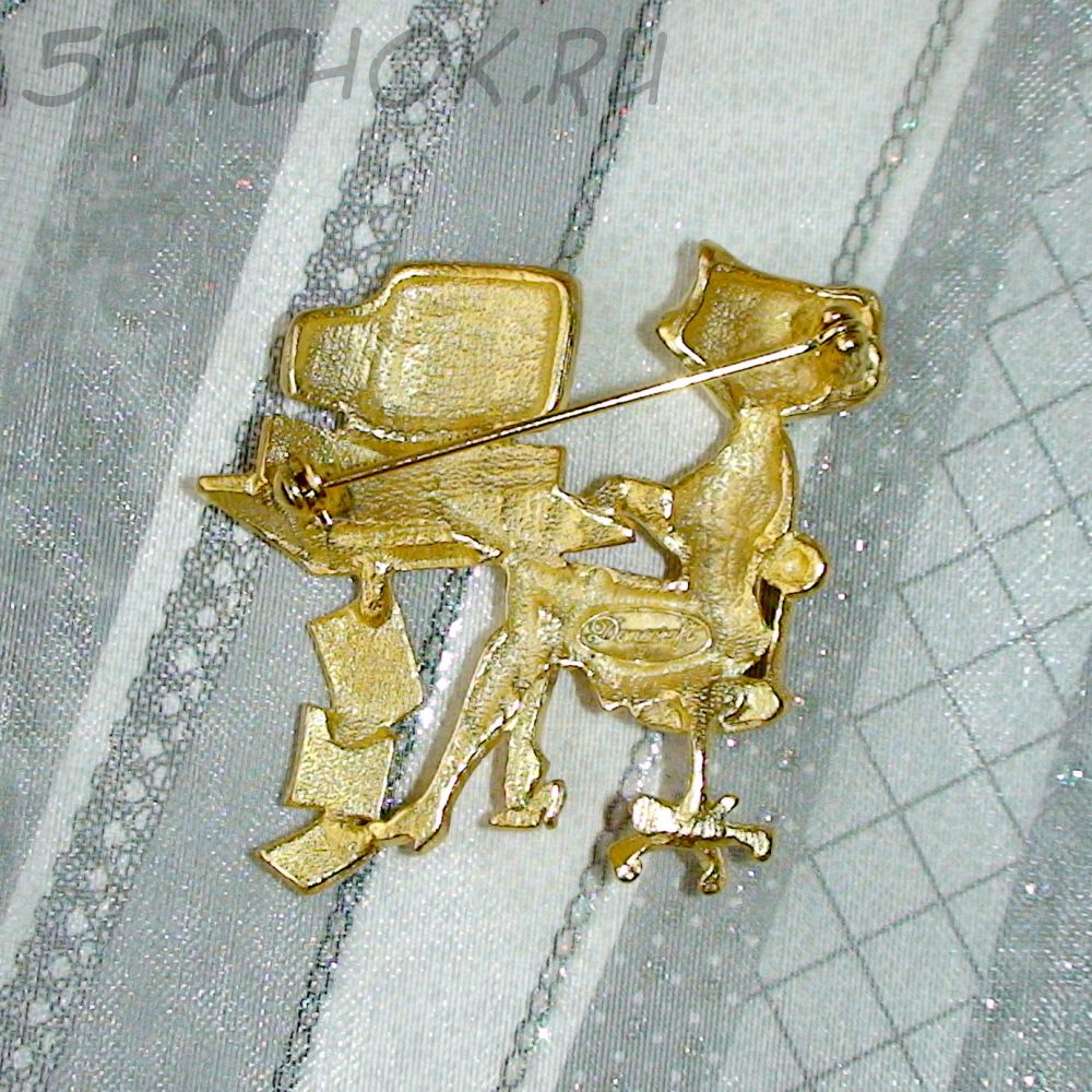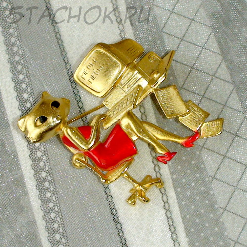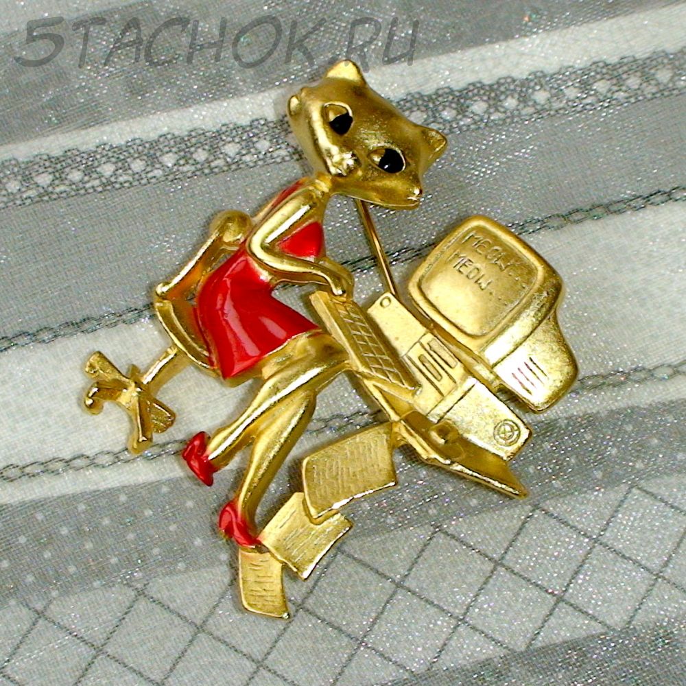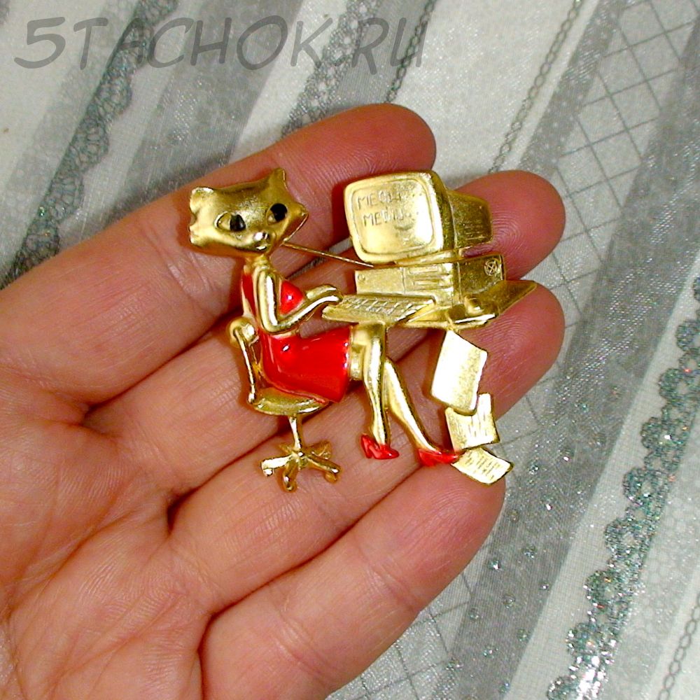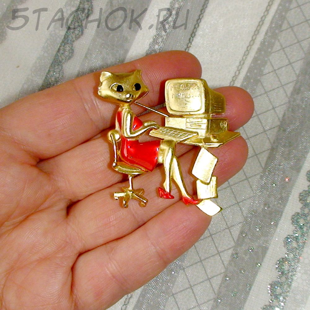 Брошь "Кошечка за компьютером" под золотом, эмаль