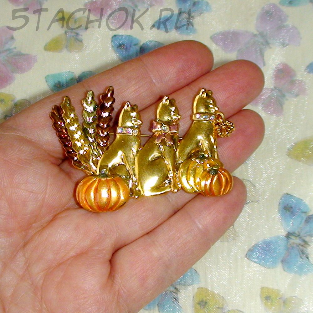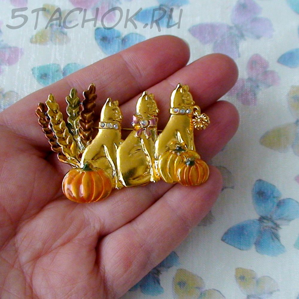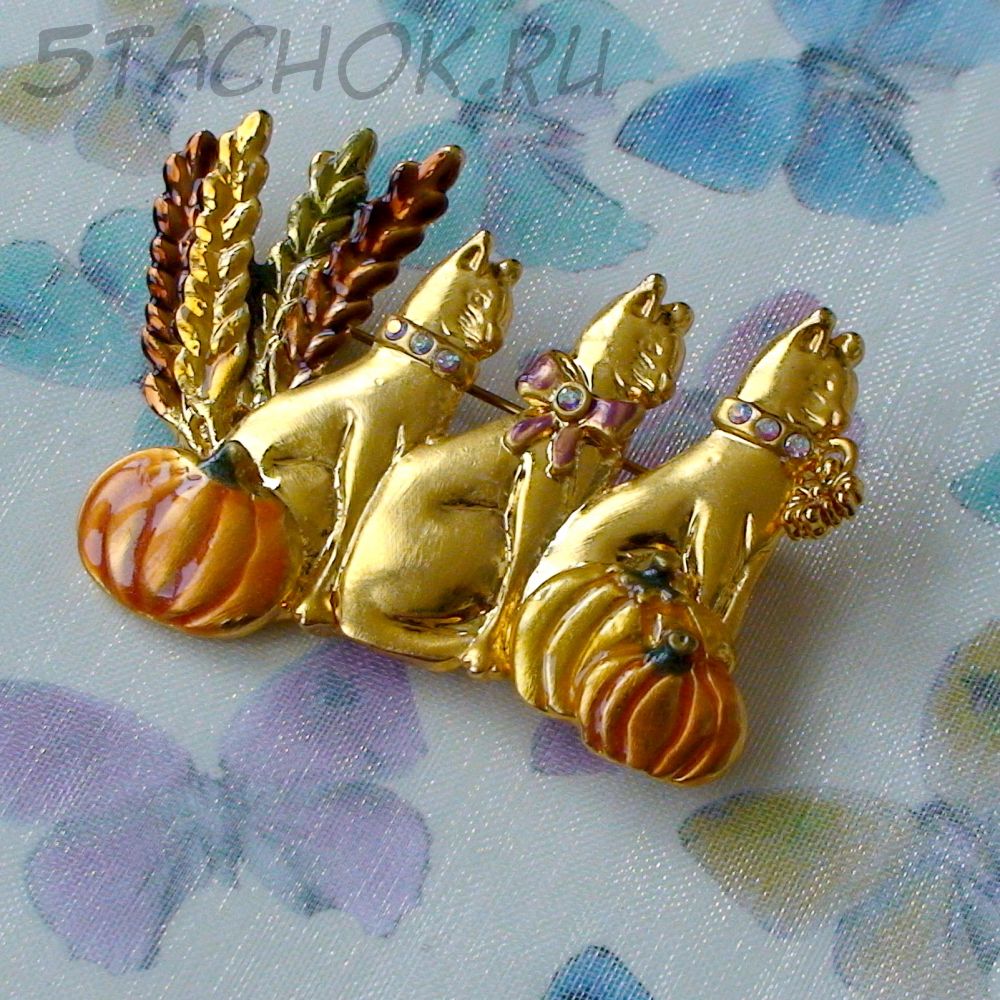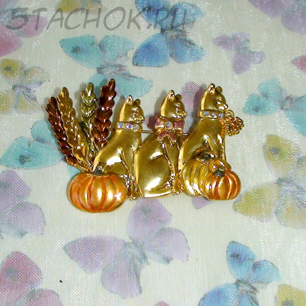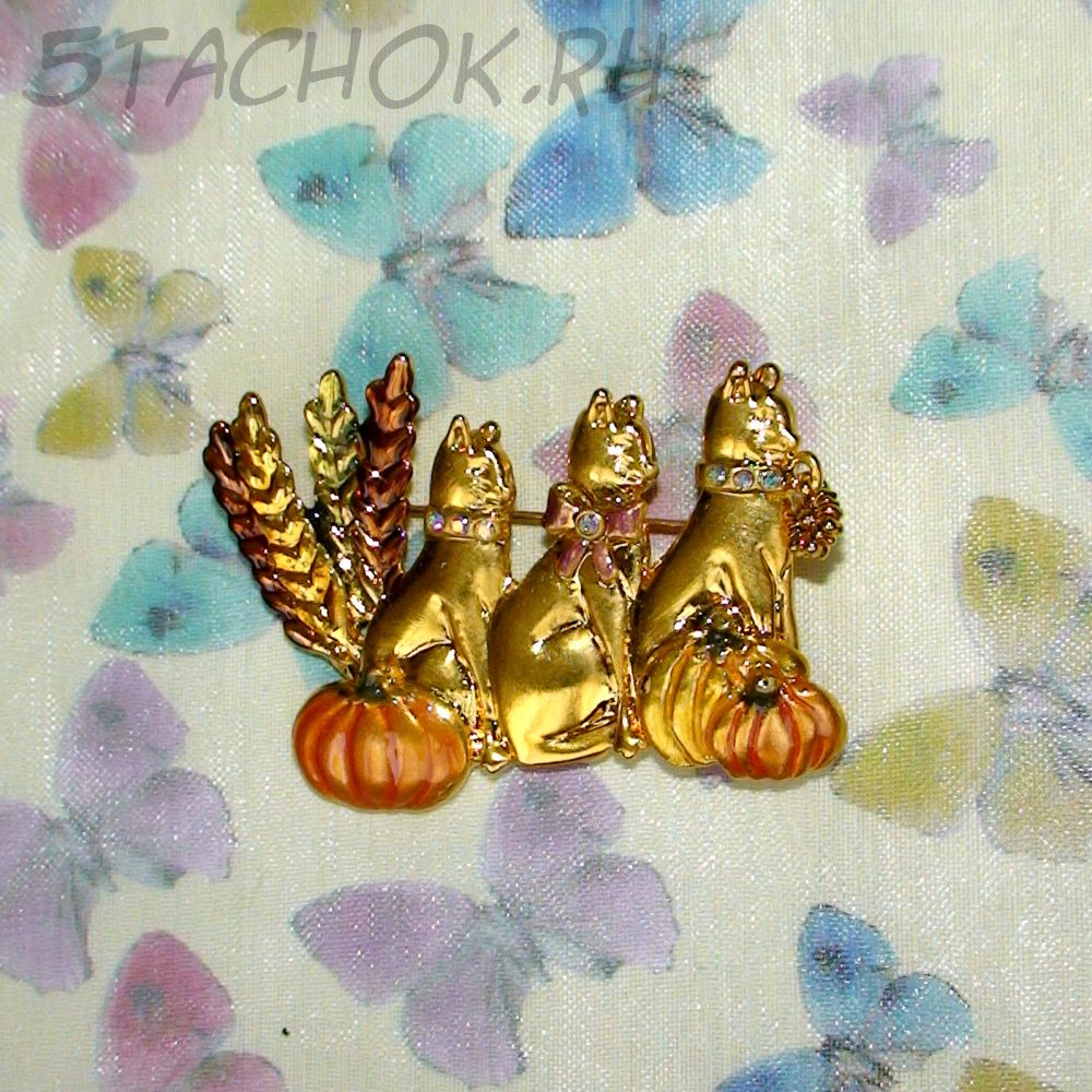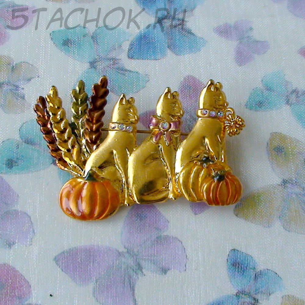 Брошь "Кошки и урожай" под золото, эмаль, стразы