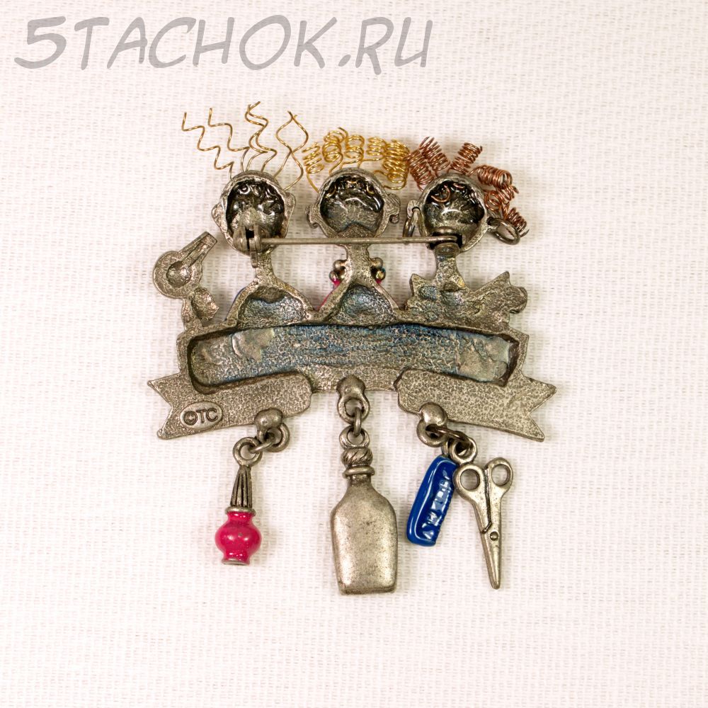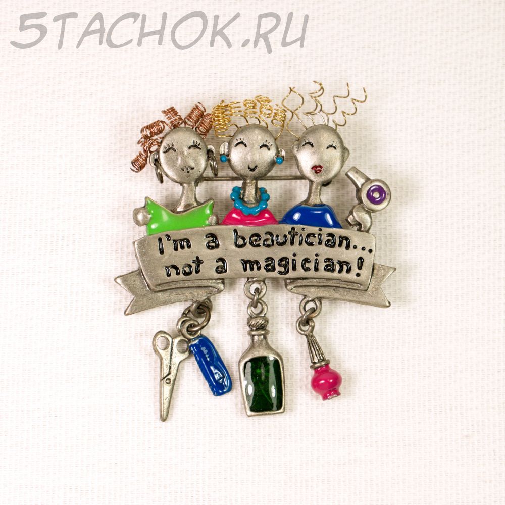 Забавная, оригинальная и редкая брошечка из пьютера. Волосы у девушек разных цветов из спиралек-проволочек. И им можно сделать разные прически. Надпись на брошке: "Я косметолог, я не маг". На брошке есть все, что требуется стилисту: ножницы, расческа, фен, лак для ногтей и шампунь. Прекрасный подарок стилисту, косметологу, парикмахеру, любой девушке или молодой женщине! Размер брошки без учета причесок 5,5*5,5см Винтаж 1980-х гг. Брошь в безупречном состоянии, изделие ранее не использовалось Производство TC (США) Маркирована
