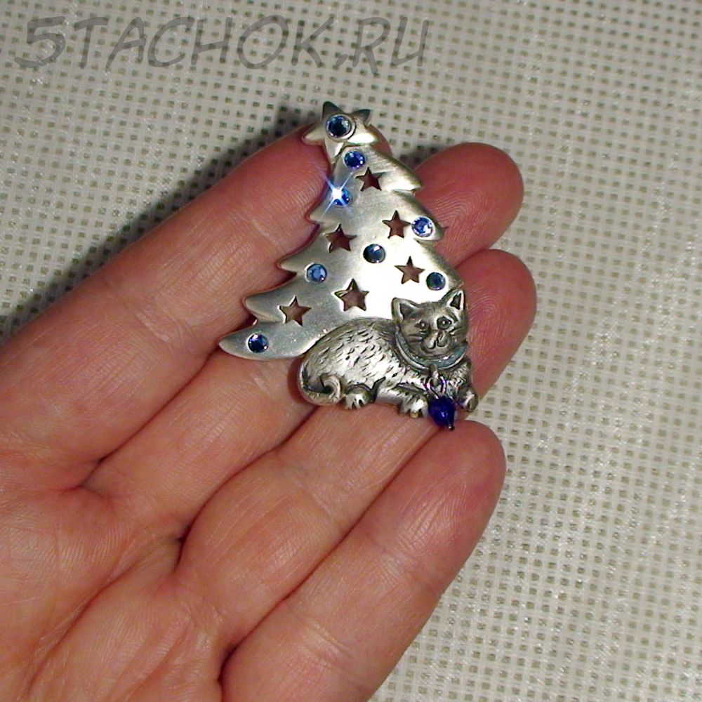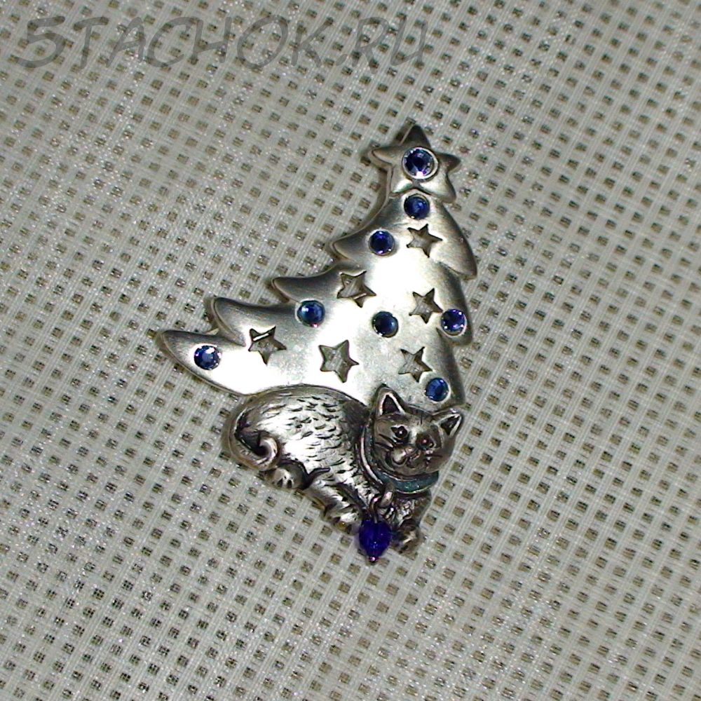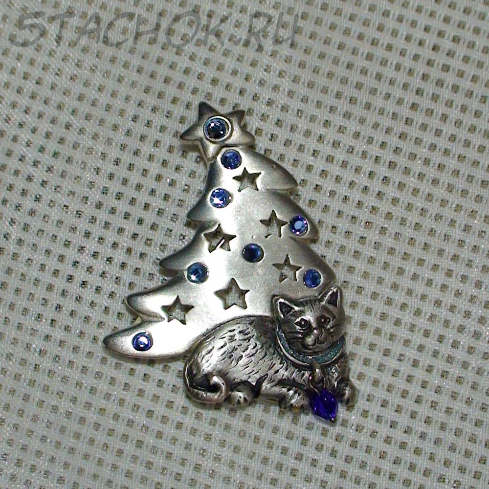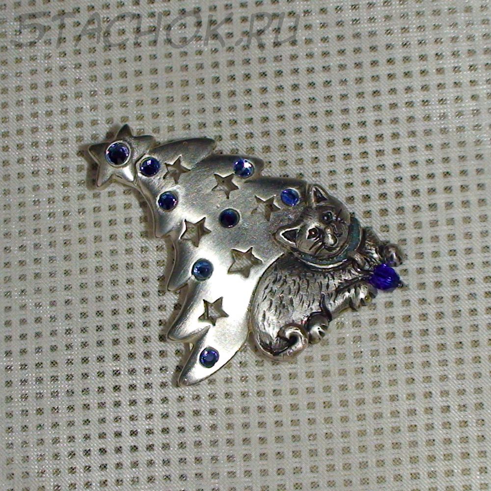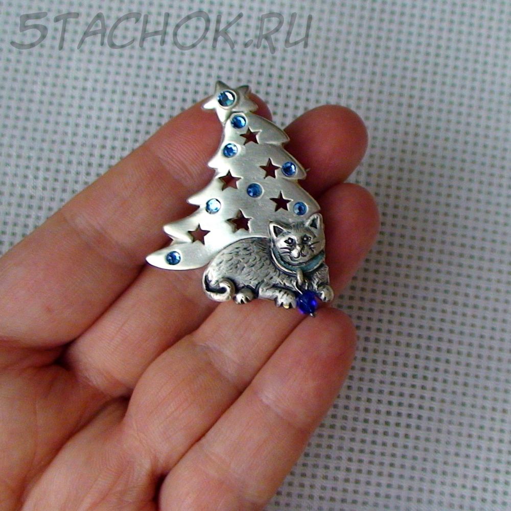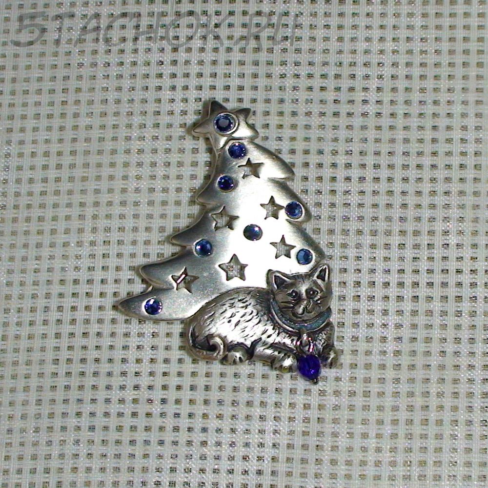 Брошь "Кот у Новогодней елочки" цвет серебра