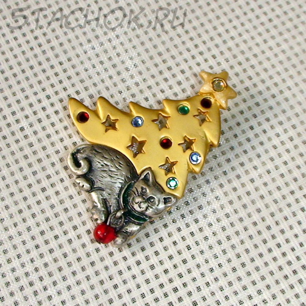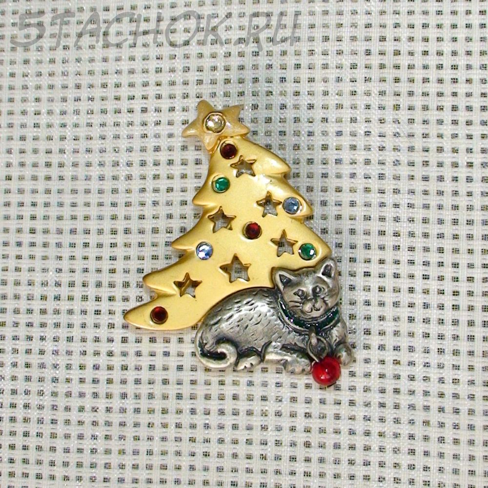 Брошь "Кот у Новогодней елочки" цвет серебра и золота