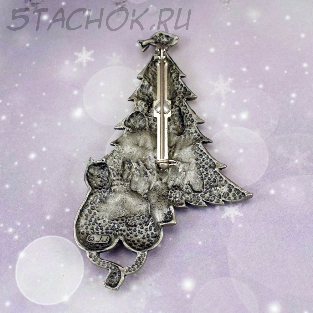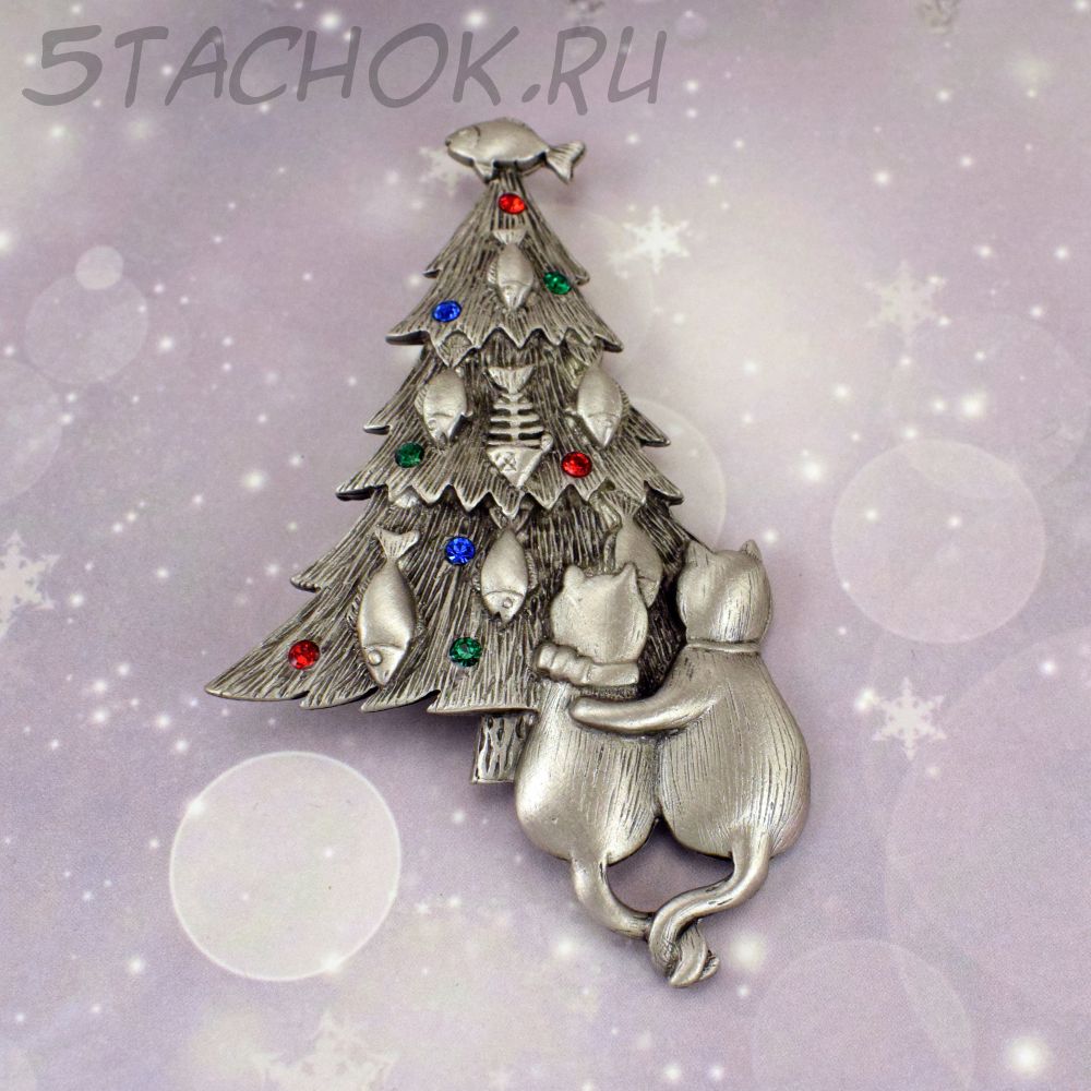 Брошь "Котики у елочки" цвет олова (JJ США)