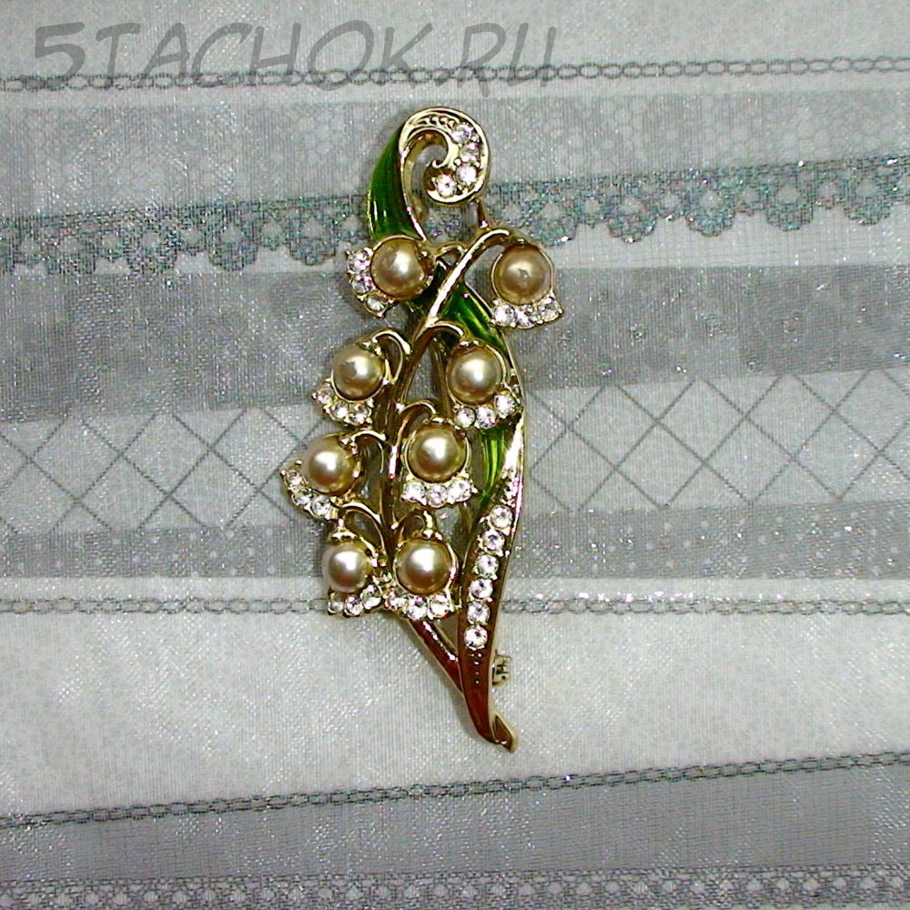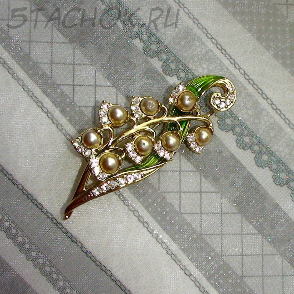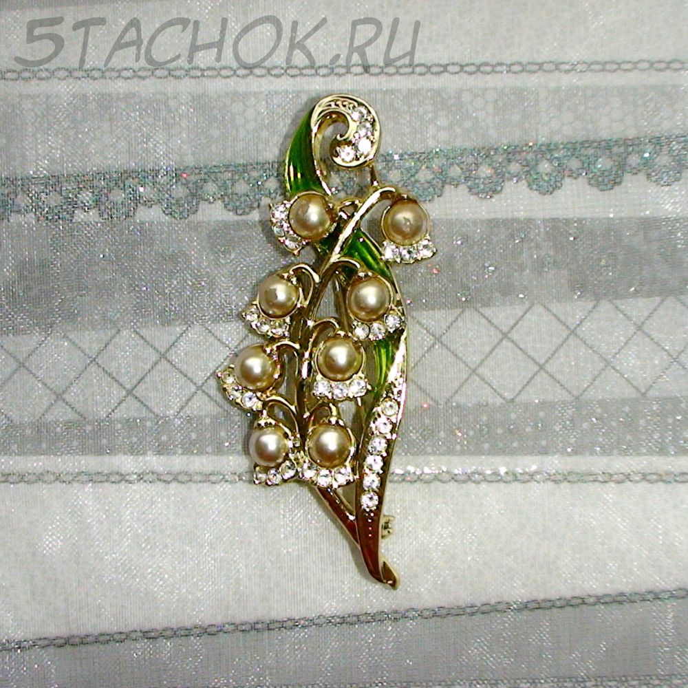 Брошь "Ландыши" под золото/эмаль/исск.жемч./сваровски