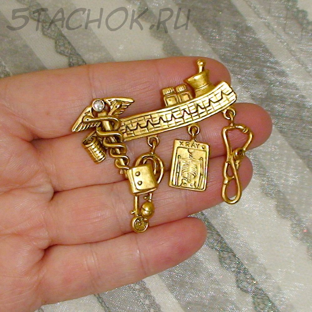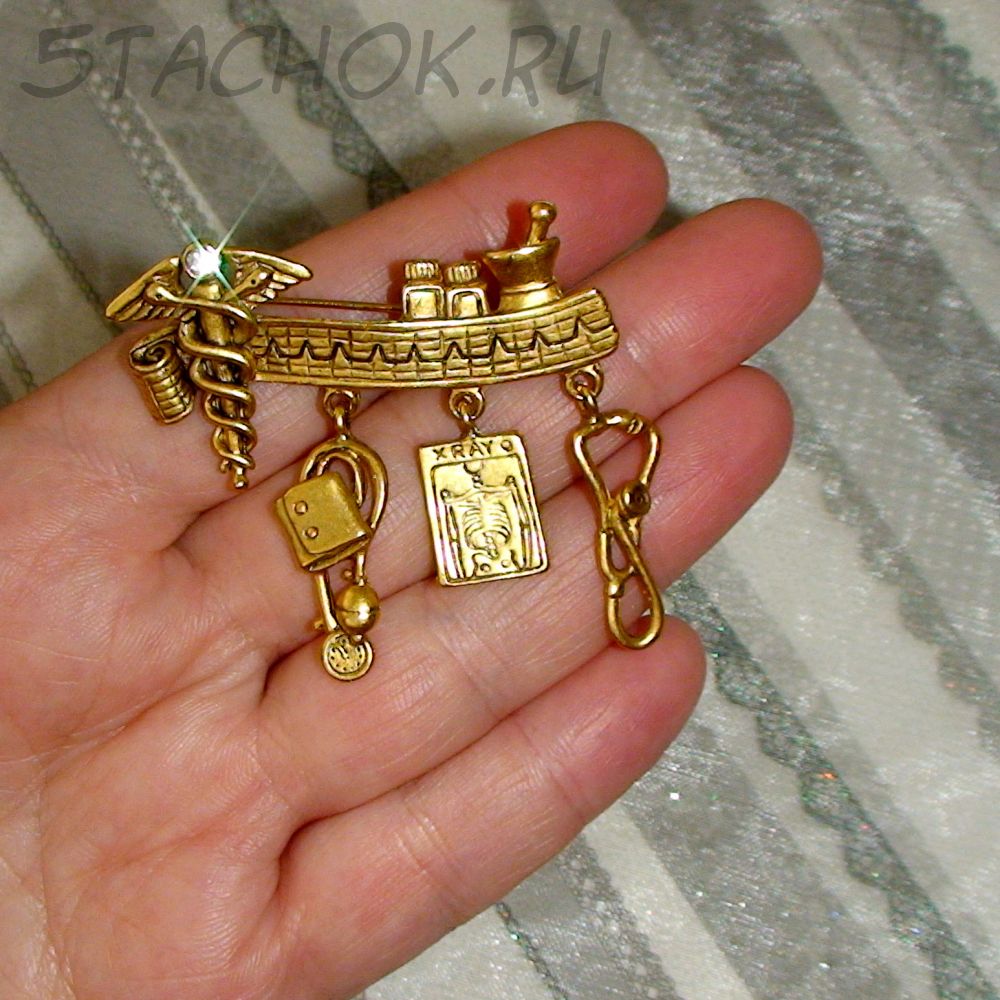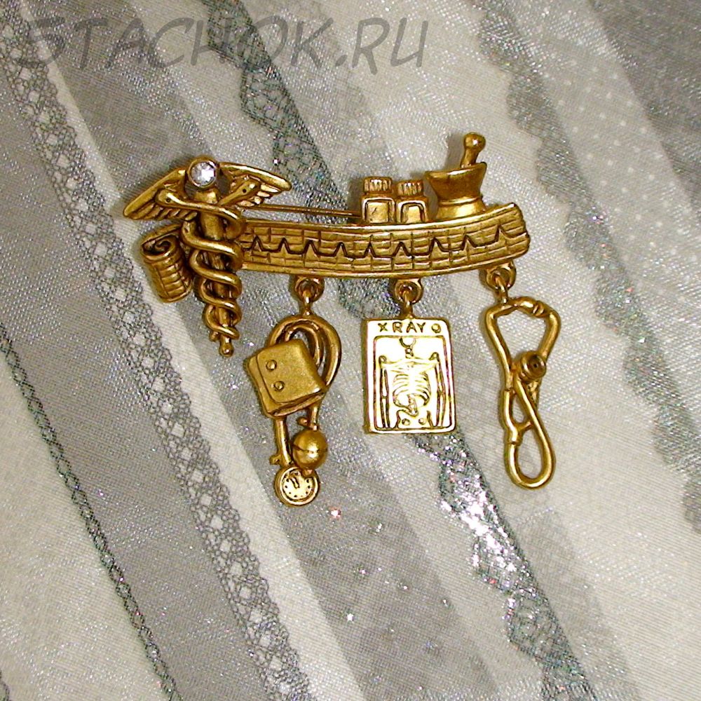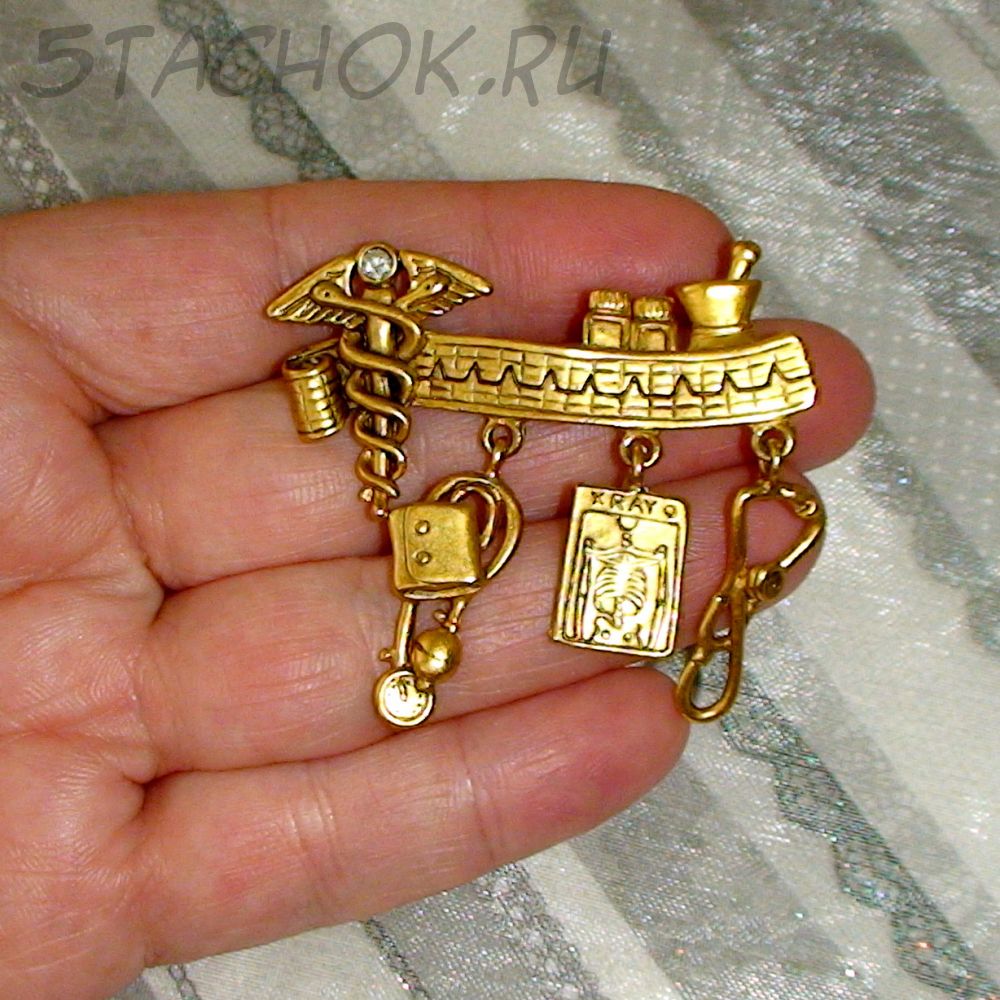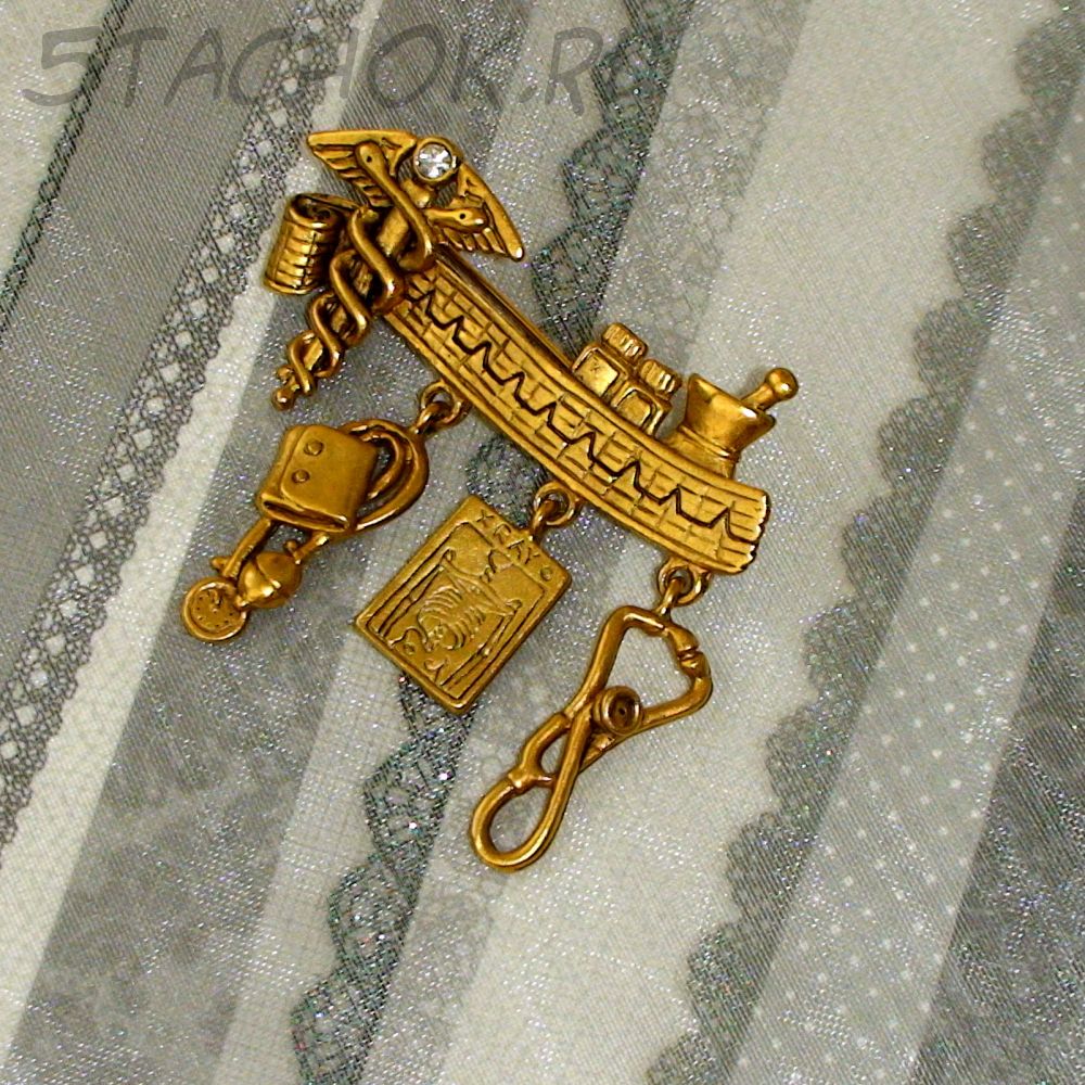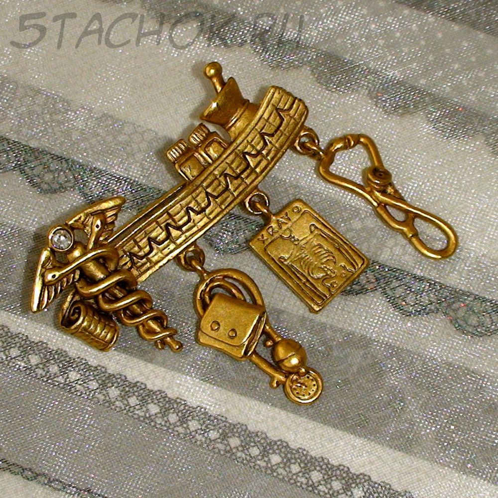 На броши изображены символ медицины "змея и жезл", в вершине которого расположен стразик, кардиограмма, на ней расположены баночки с лекарствами и ступка для измельчения и смешивания, снизу расположены подвижные элементы броши: тонометр, стетофонендоскоп, рентген-снимок человека.