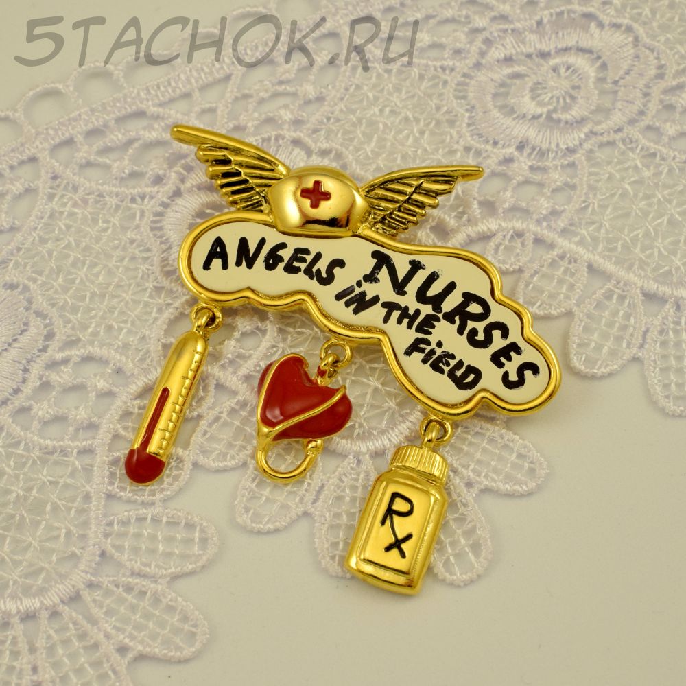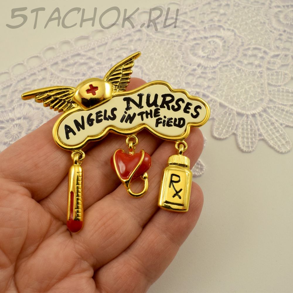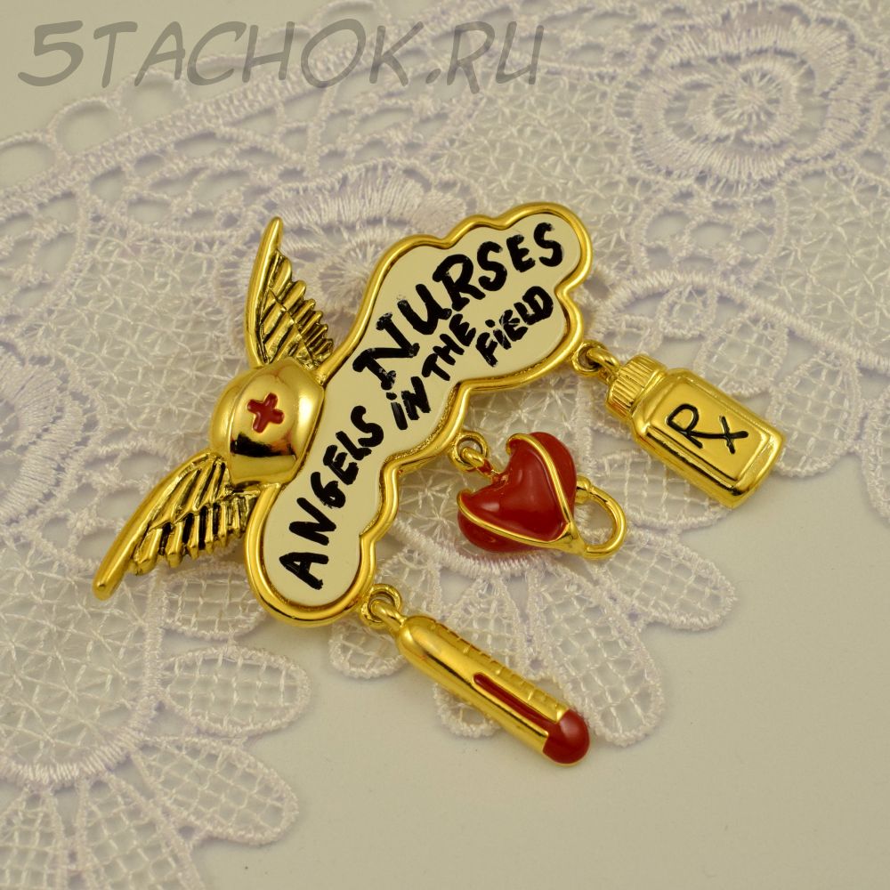 Выполнена под блестящее черненое золото с использованием блестящей эмали белого, красного и черного цветов. На брошке надпись: "Медсестры - ангелы на поприще".