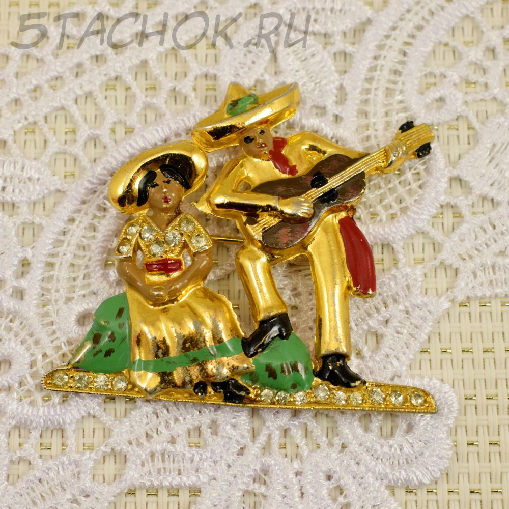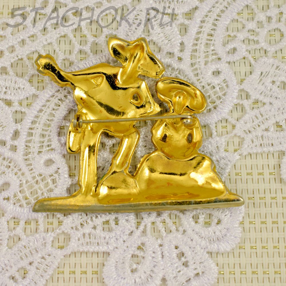 Редкая, красивая брошь. Выполнена в цвете золота с использованием разноцветной эмали и страз белого цвета.