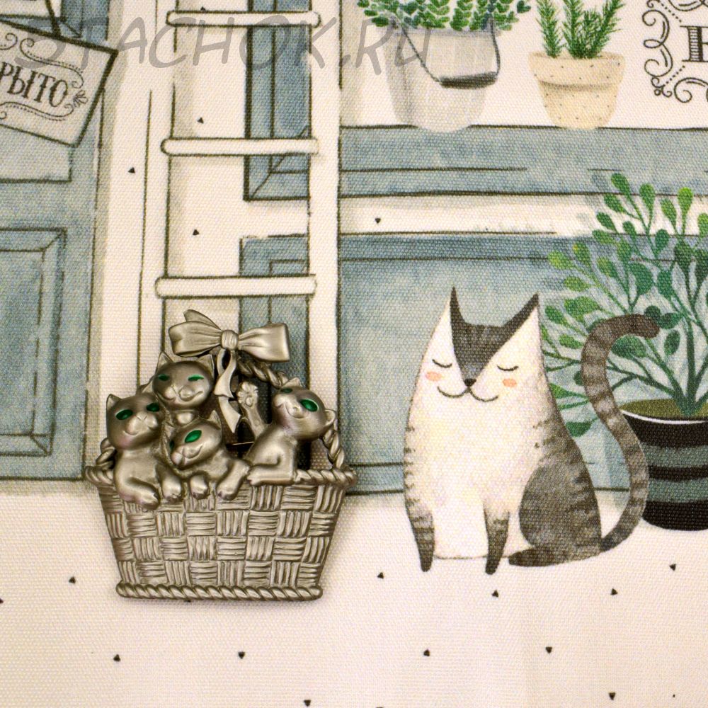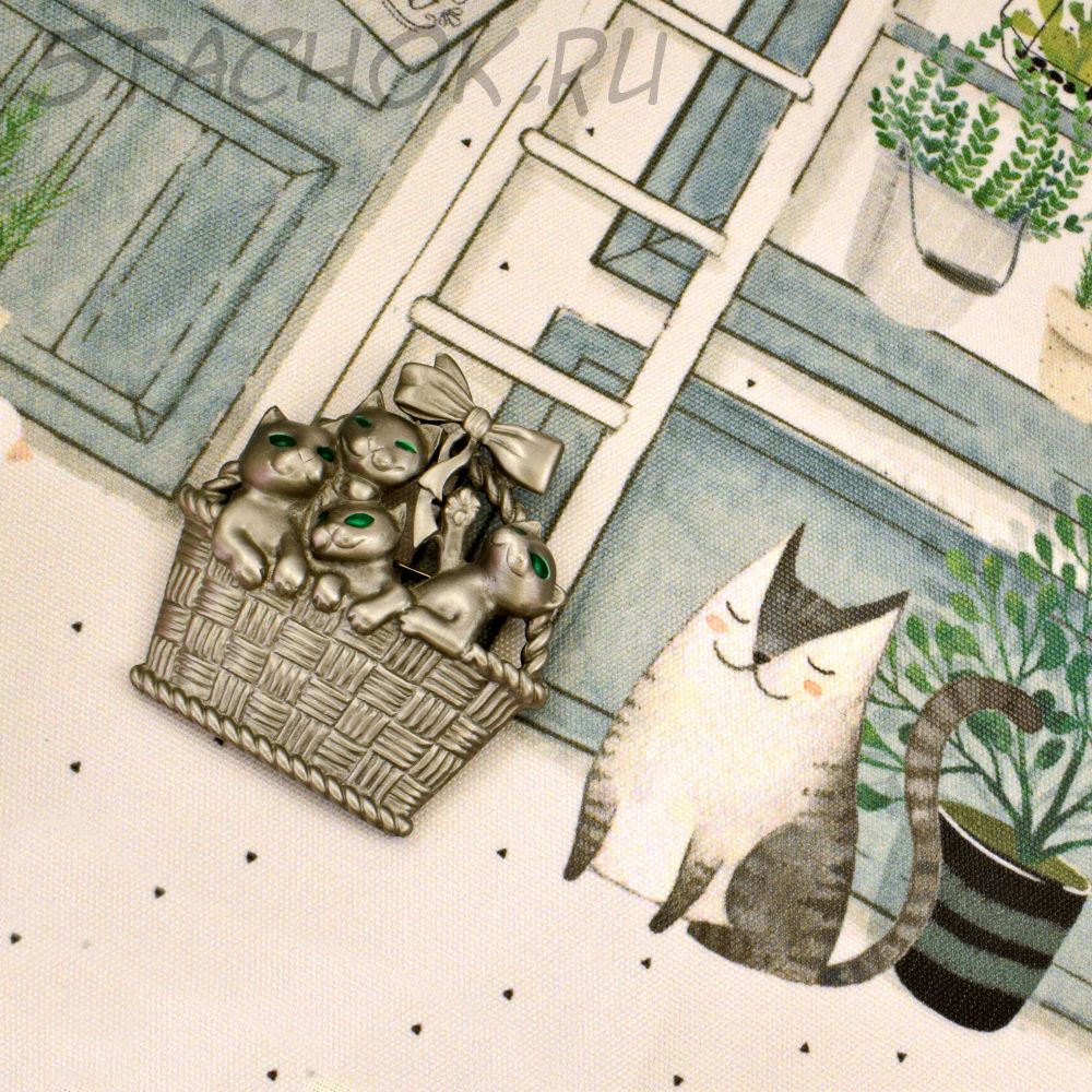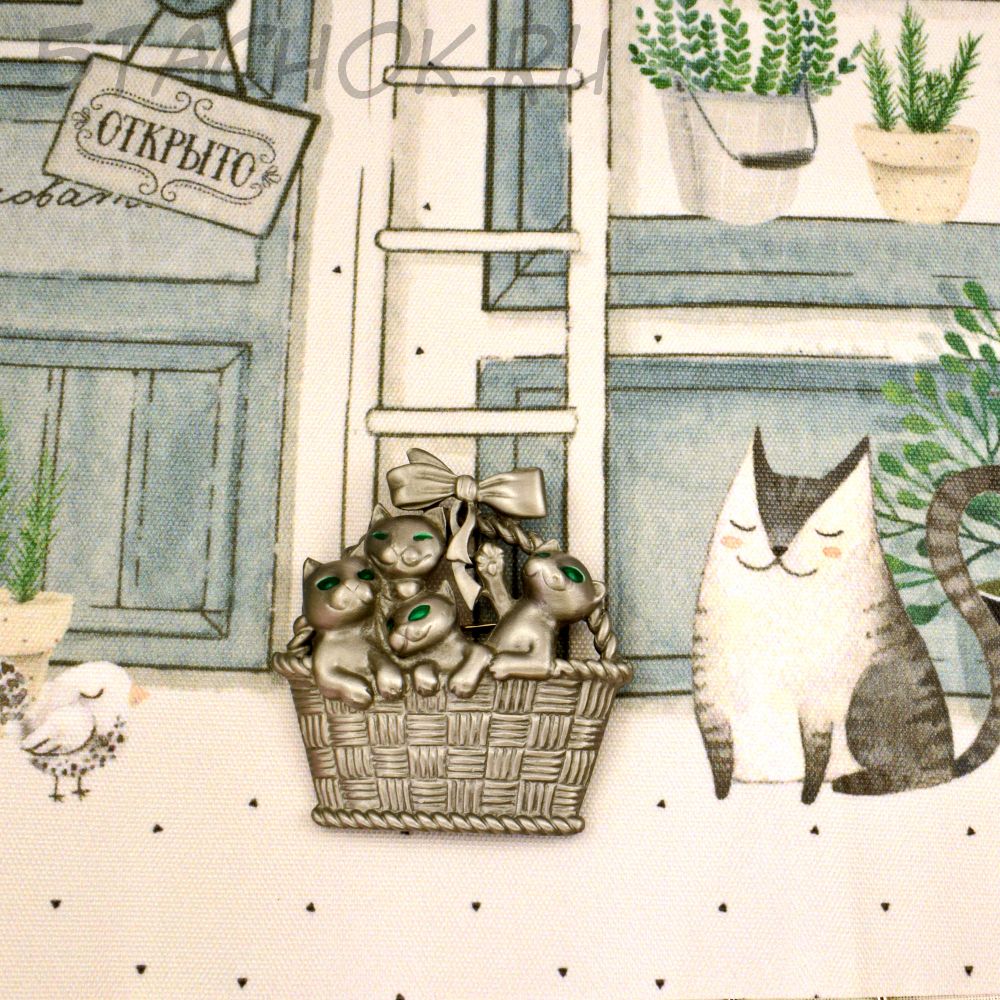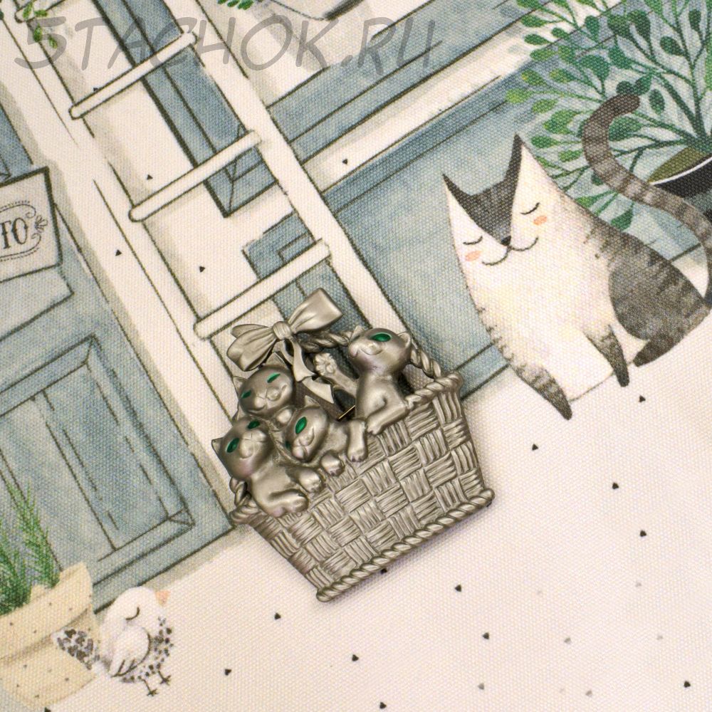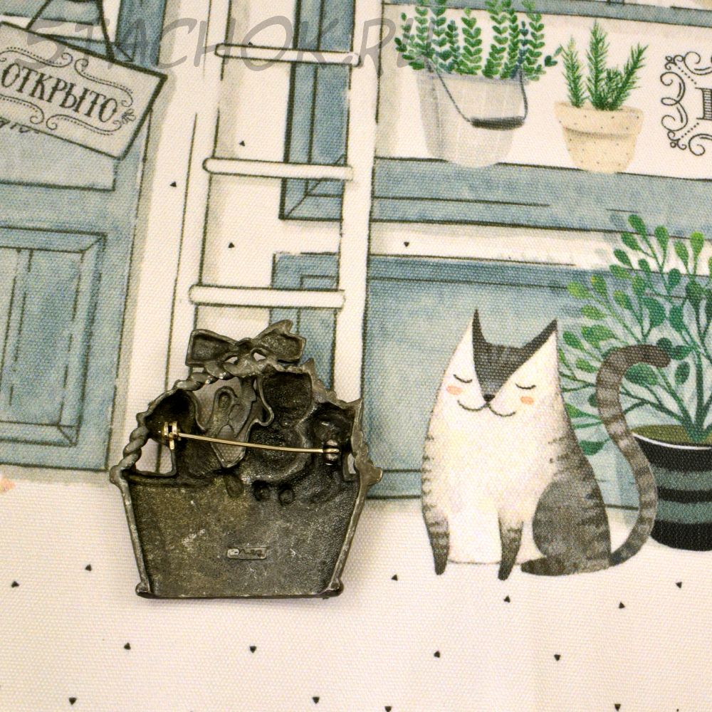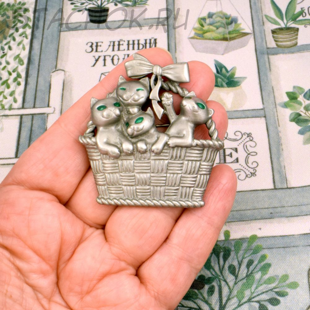 Брошь "Милые котята в корзинке" цвет олова (AJC США)