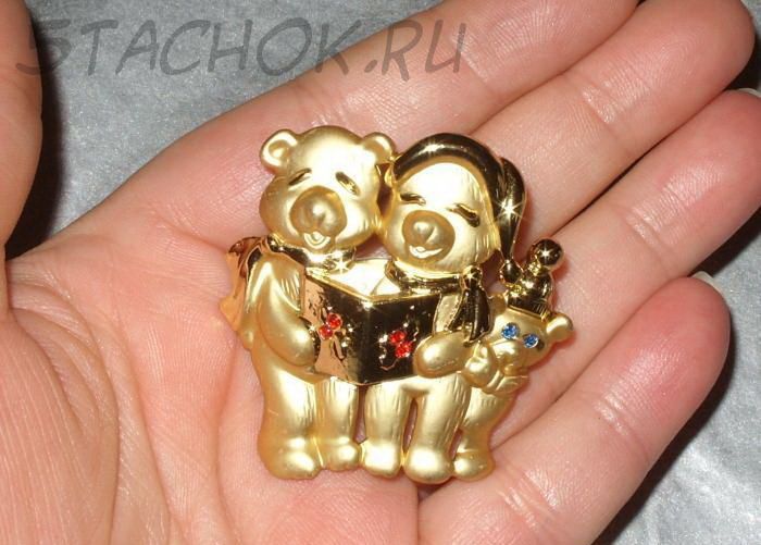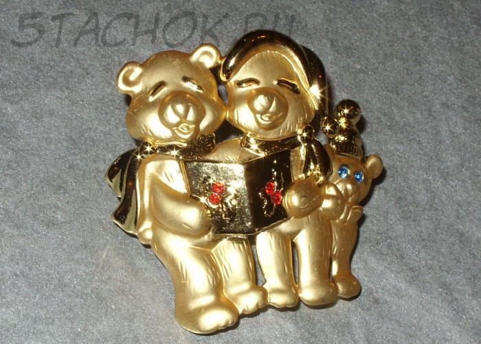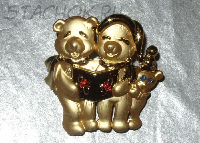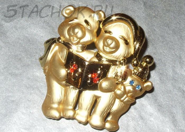 Брошь "Мишки поют псалмы на Рождество" под золото/стразы
