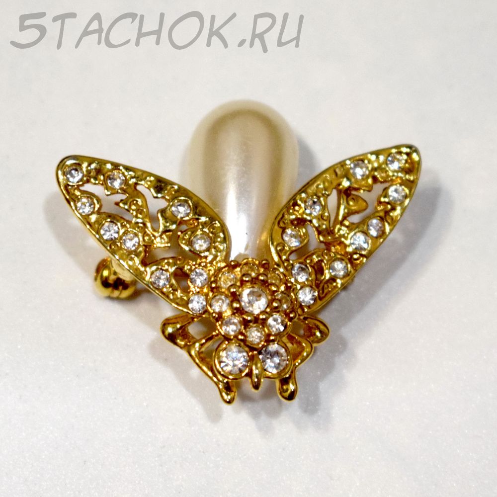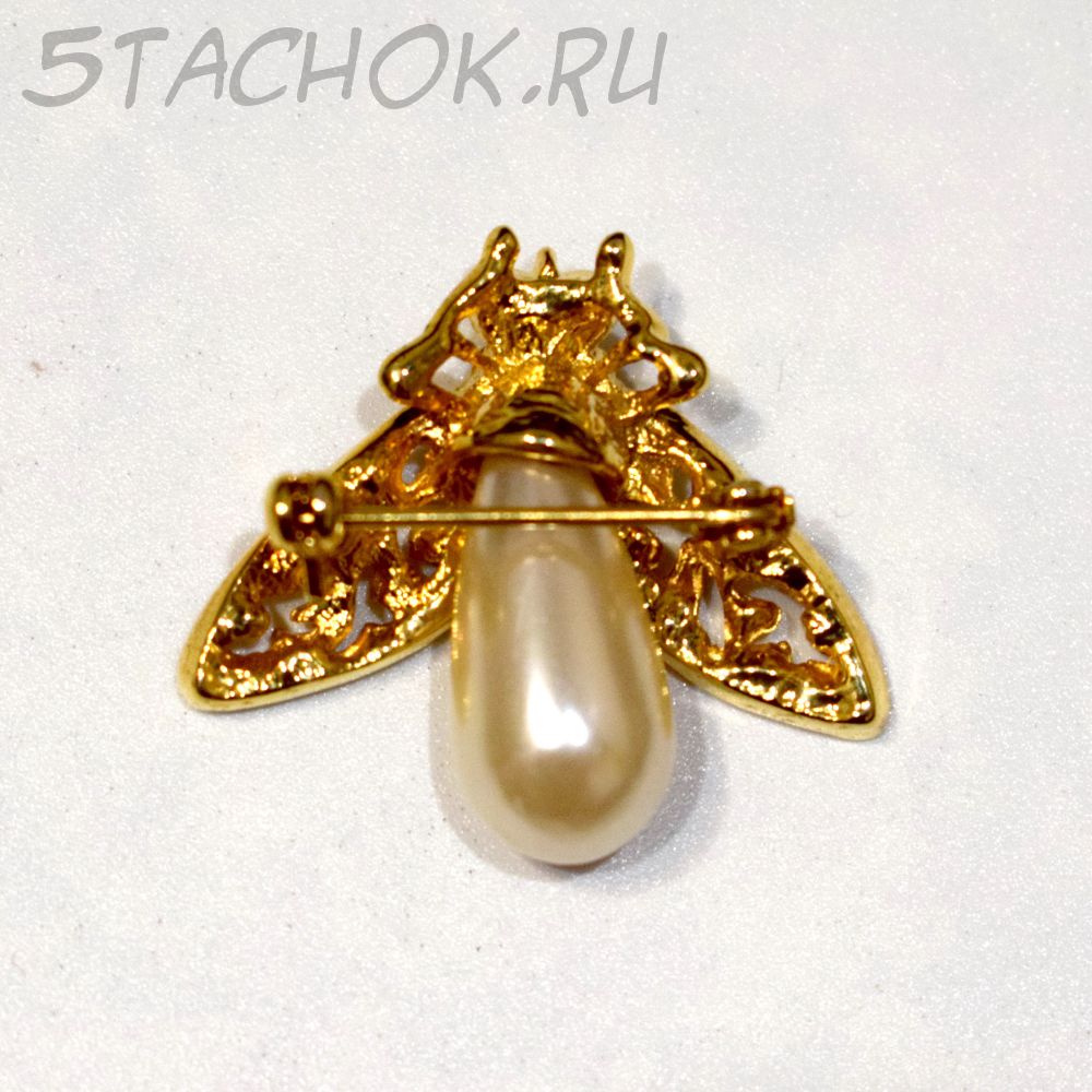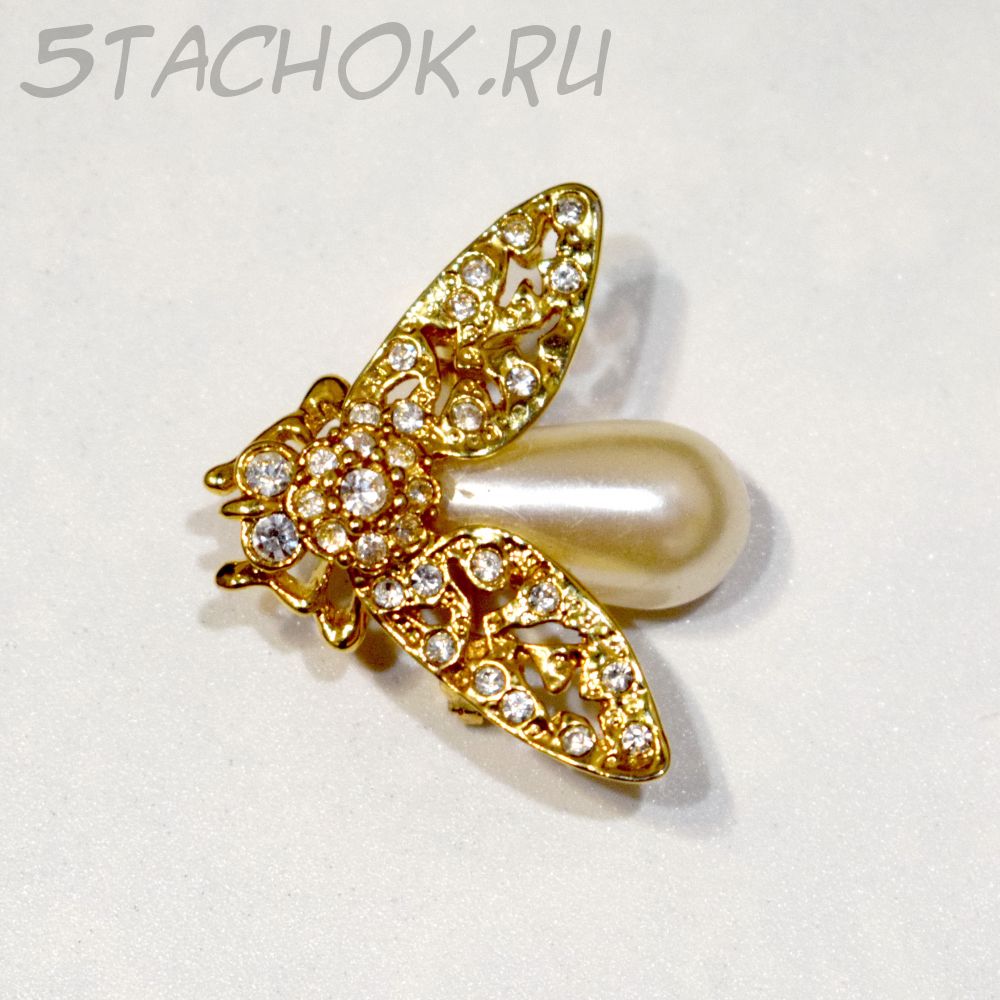 Нежная, оригинальная брошь. Выполнена в цвете блестящего золота с использованием камушка под искусственный жемчуг и австрийских кристаллов. Мушка ярко переливается при любом освещении.