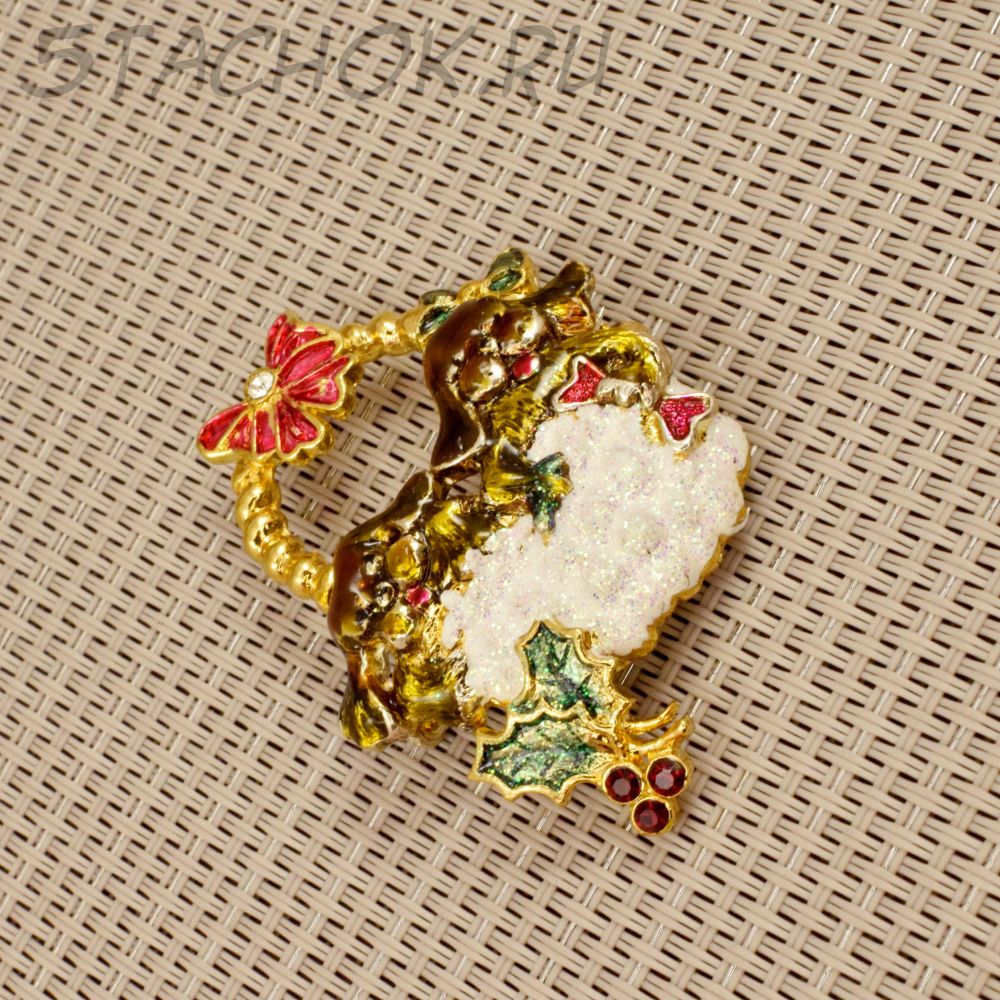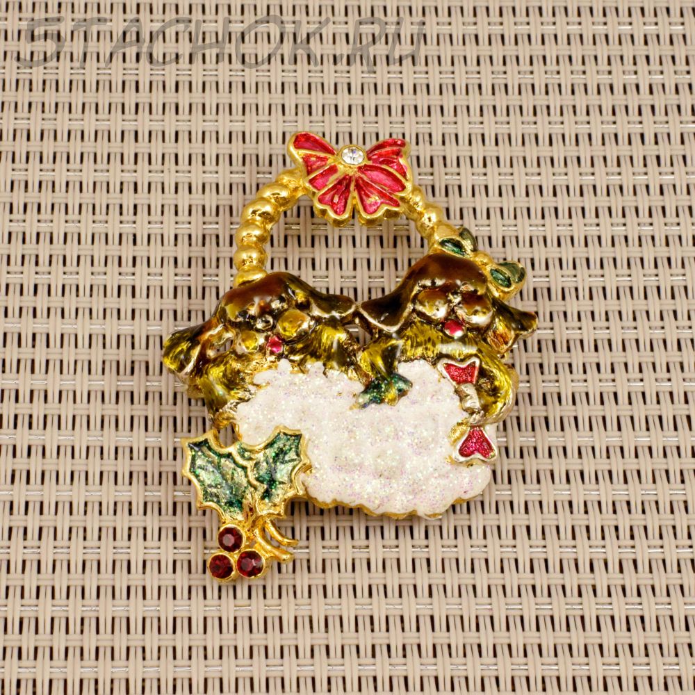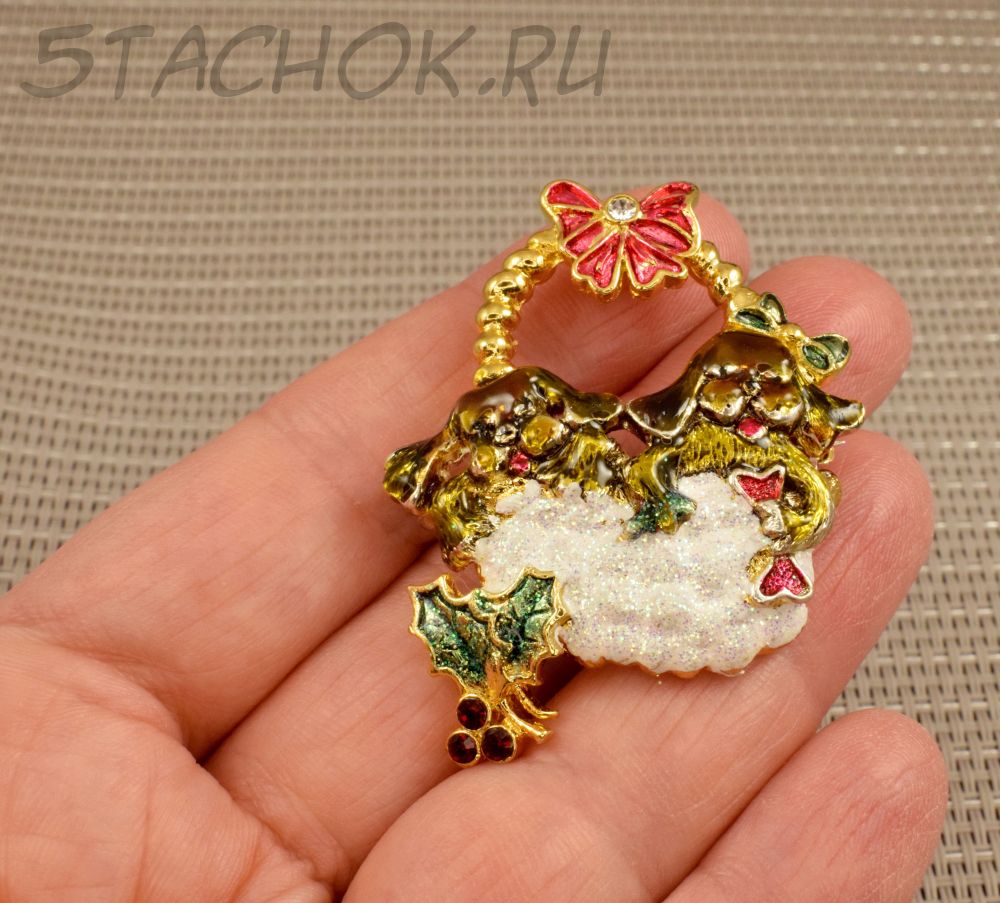 Брошь "Новогодние песики в подарочной корзинке" (США)
