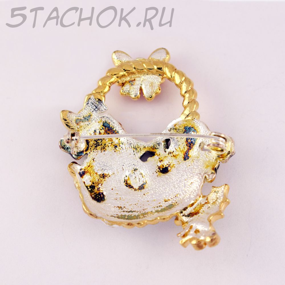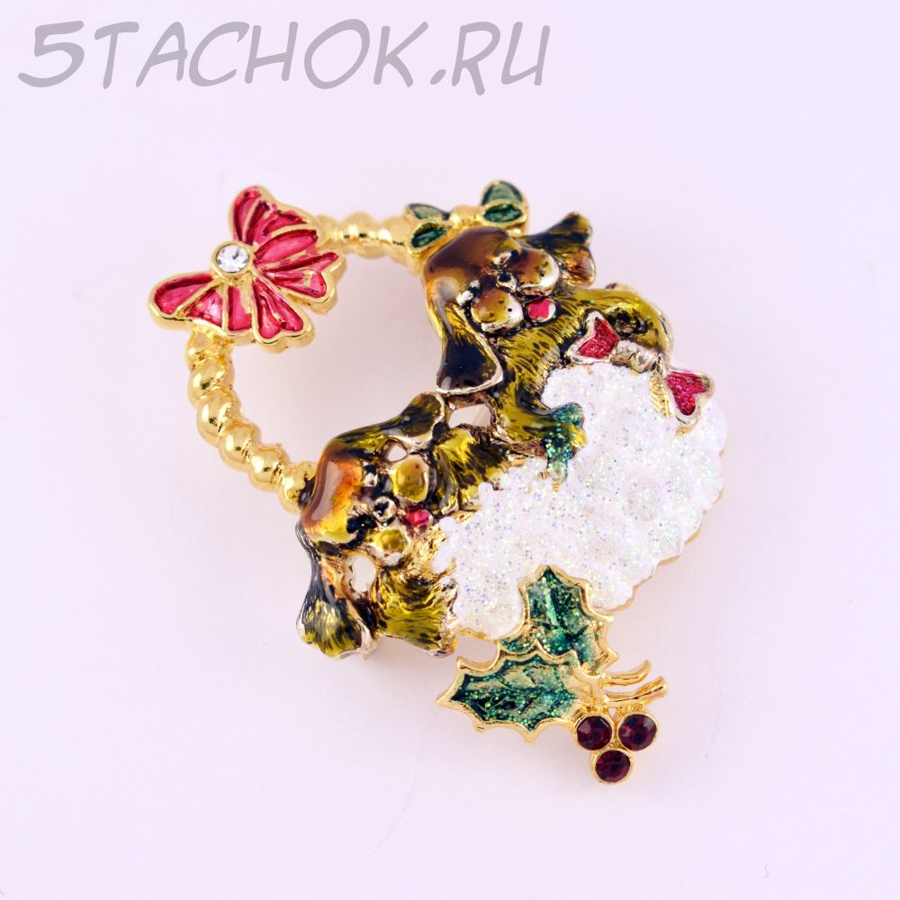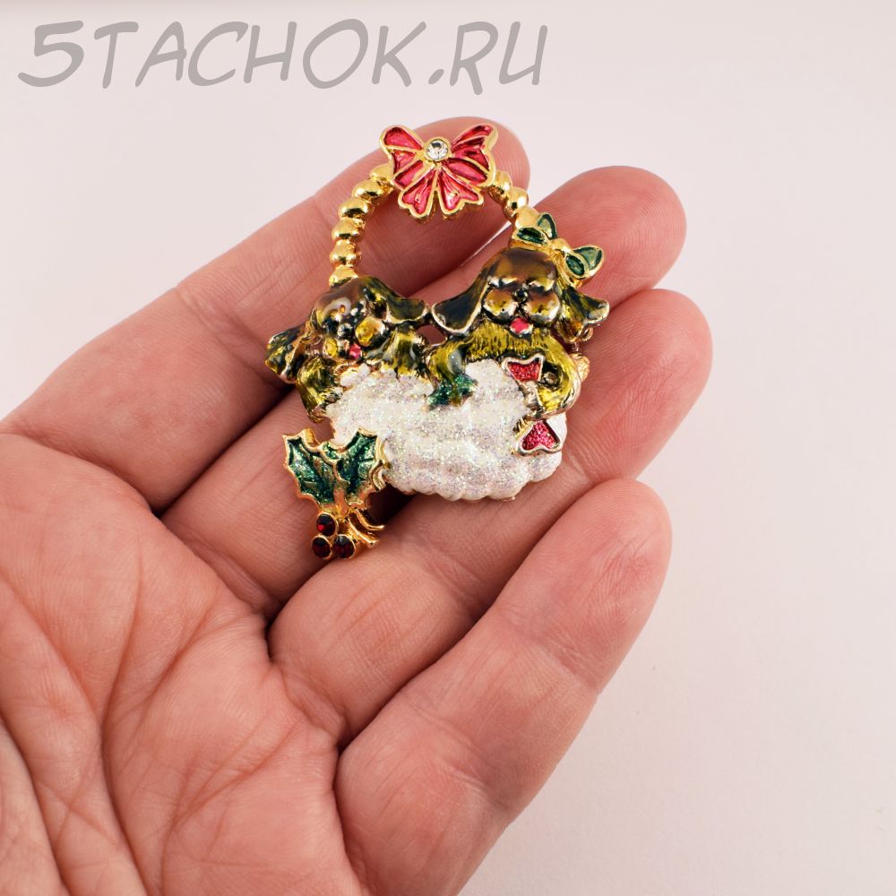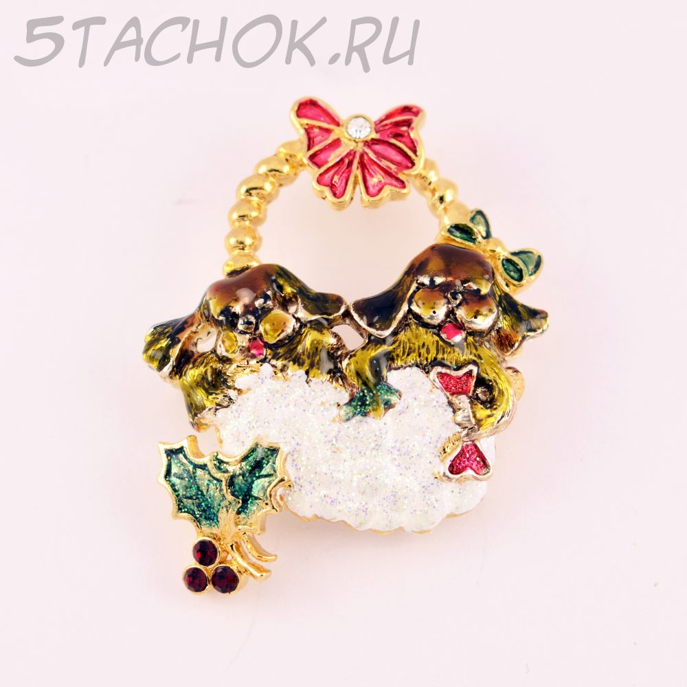 Брошь "Новогодние песики в подарочной корзинке" (США)