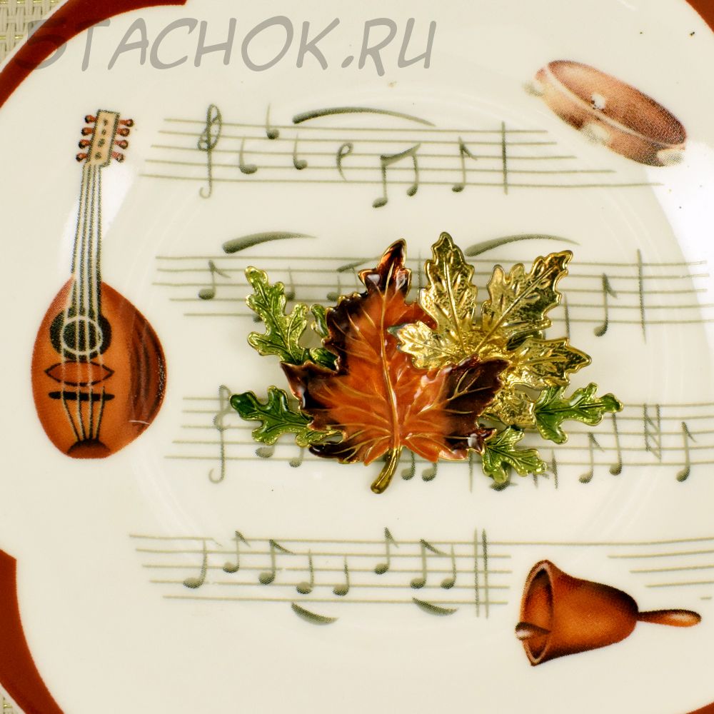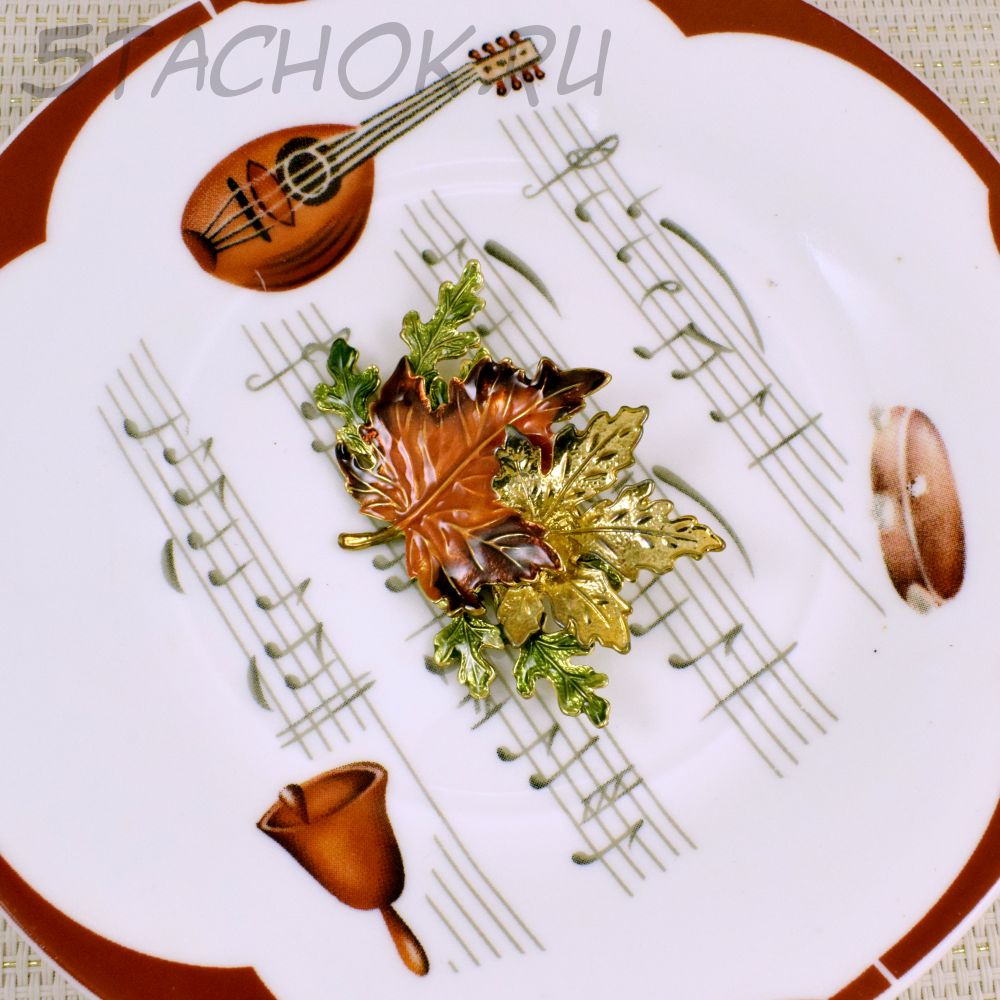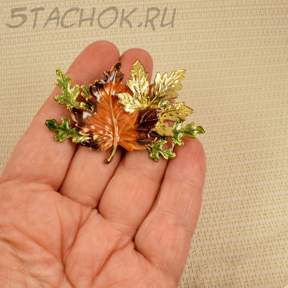 "Осенняя пора, очей очарование..." Выполнена брошь в цвете блестящего золота с использованием перламутровой эмали оранжевого, охристого и зеленого цветов. У листиков прорисованы жилки и фактура листочков.