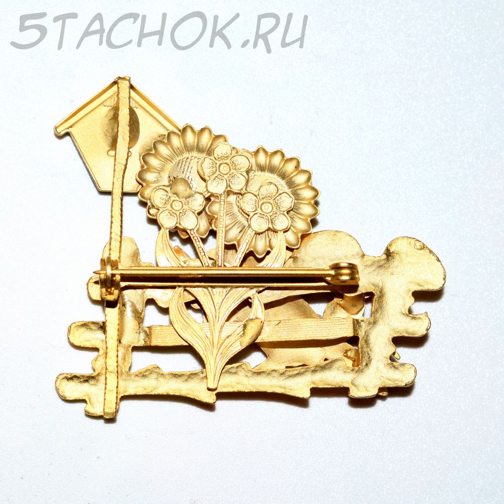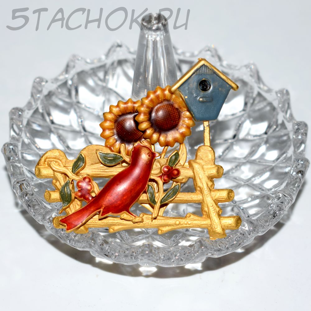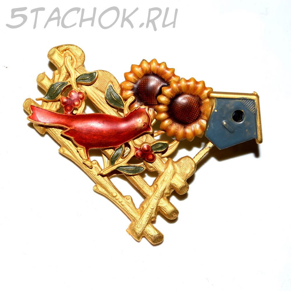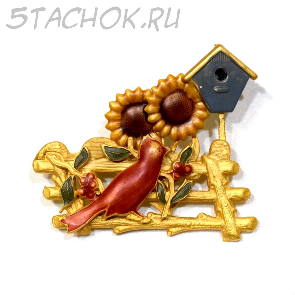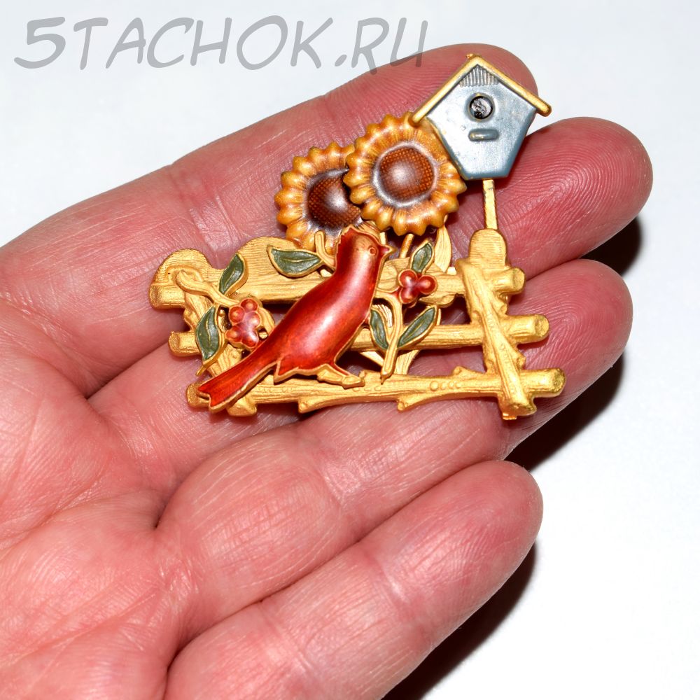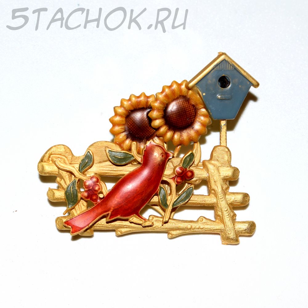 Брошь "Птичка кардинал, подсолнечник и скворечник" (США)
