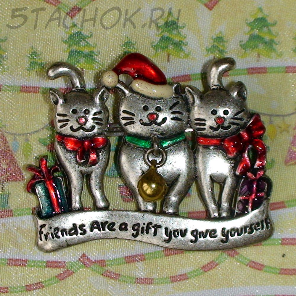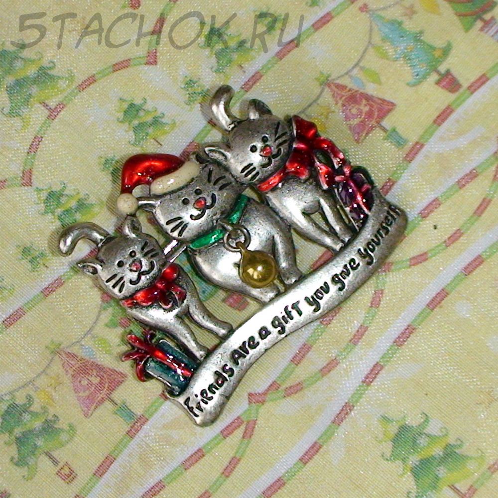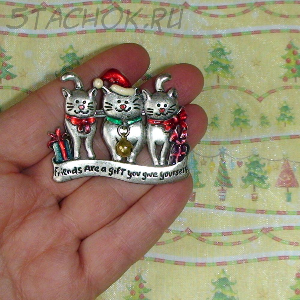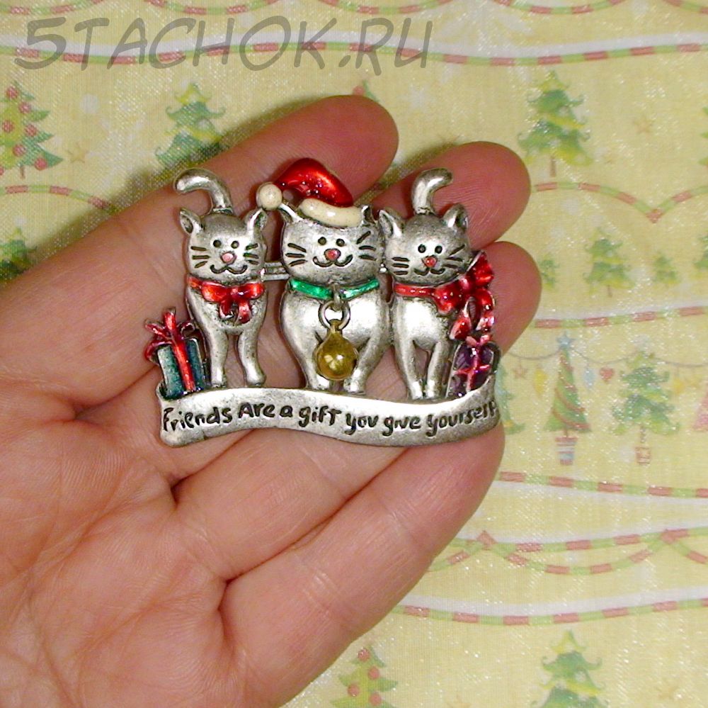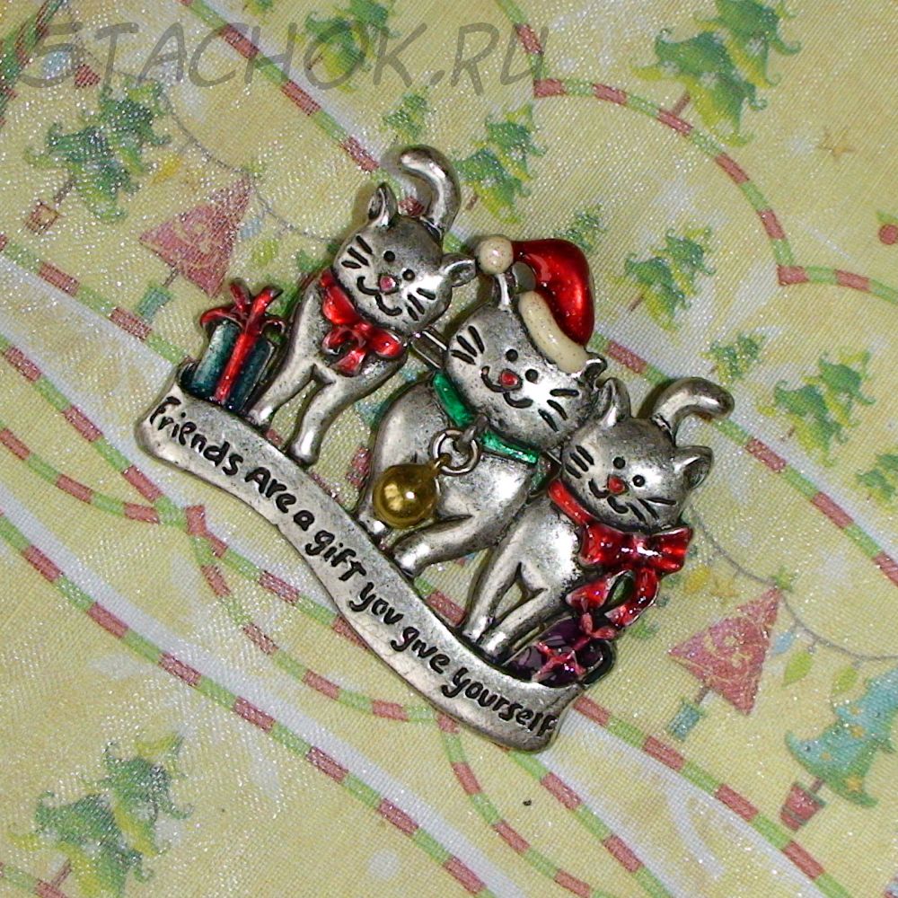 Брошь "Рождественские котики с подарками" под олово, эмаль