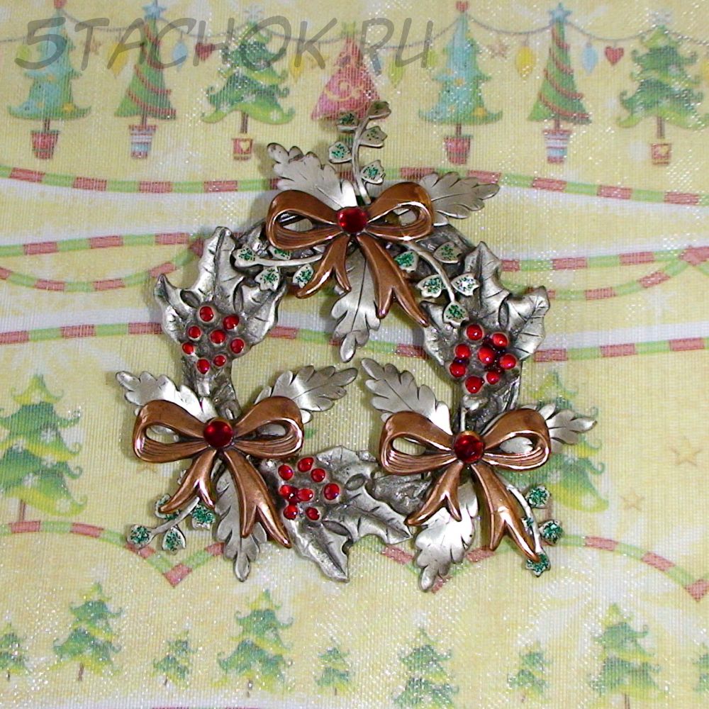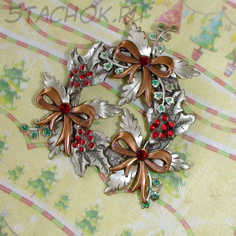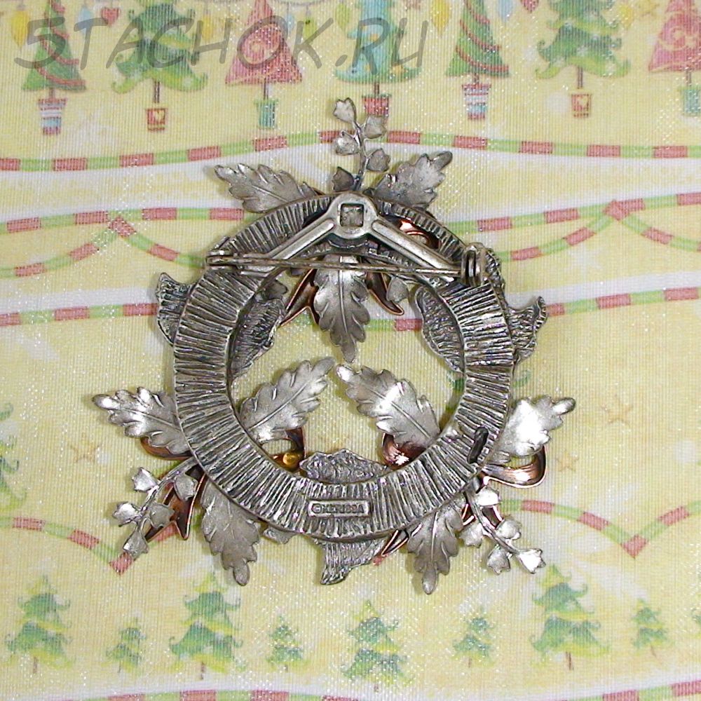 Брошь "Рождественский венок" под олово, медь, эмаль, стразы, блестки
