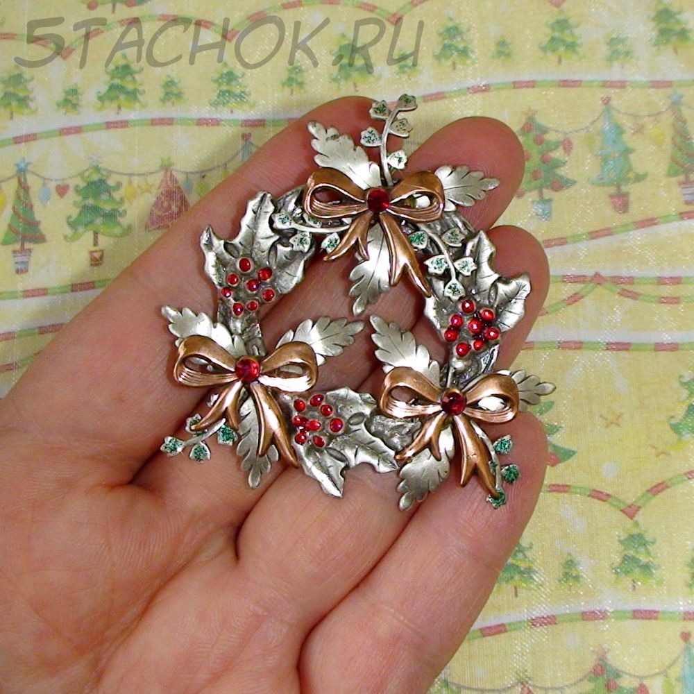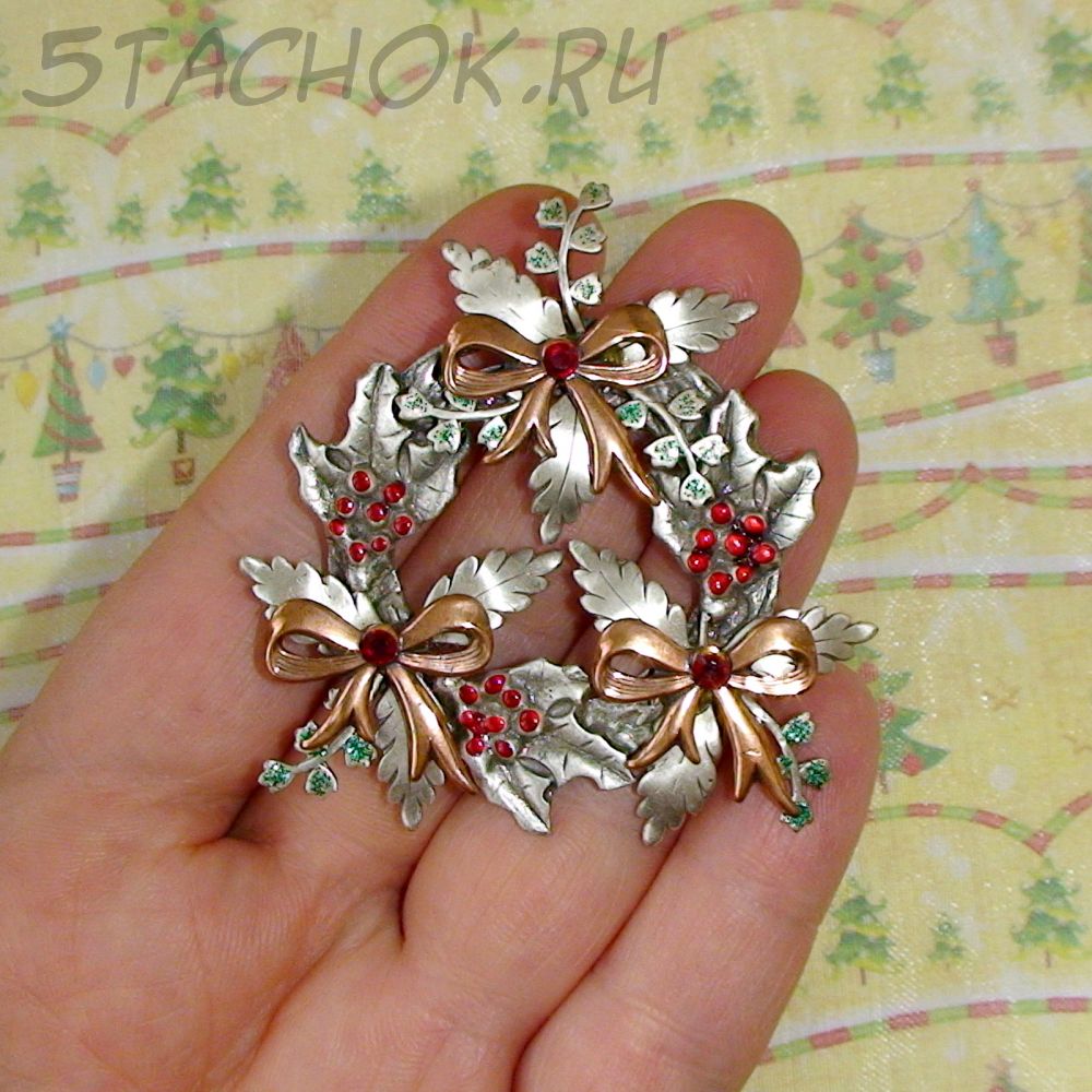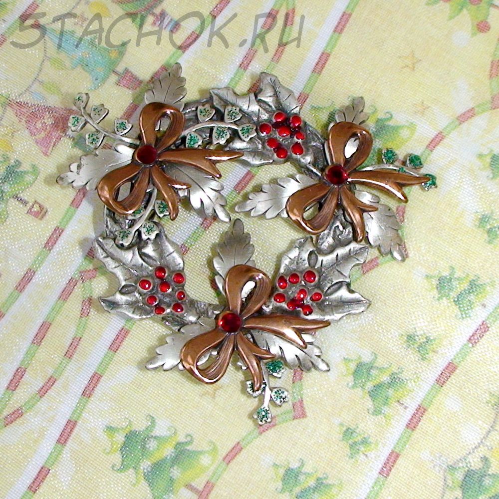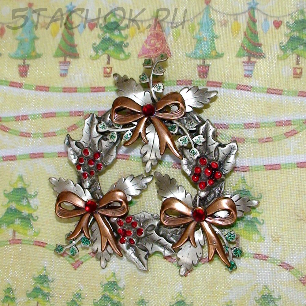 Брошь "Рождественский венок" под олово, медь, эмаль, стразы, блестки