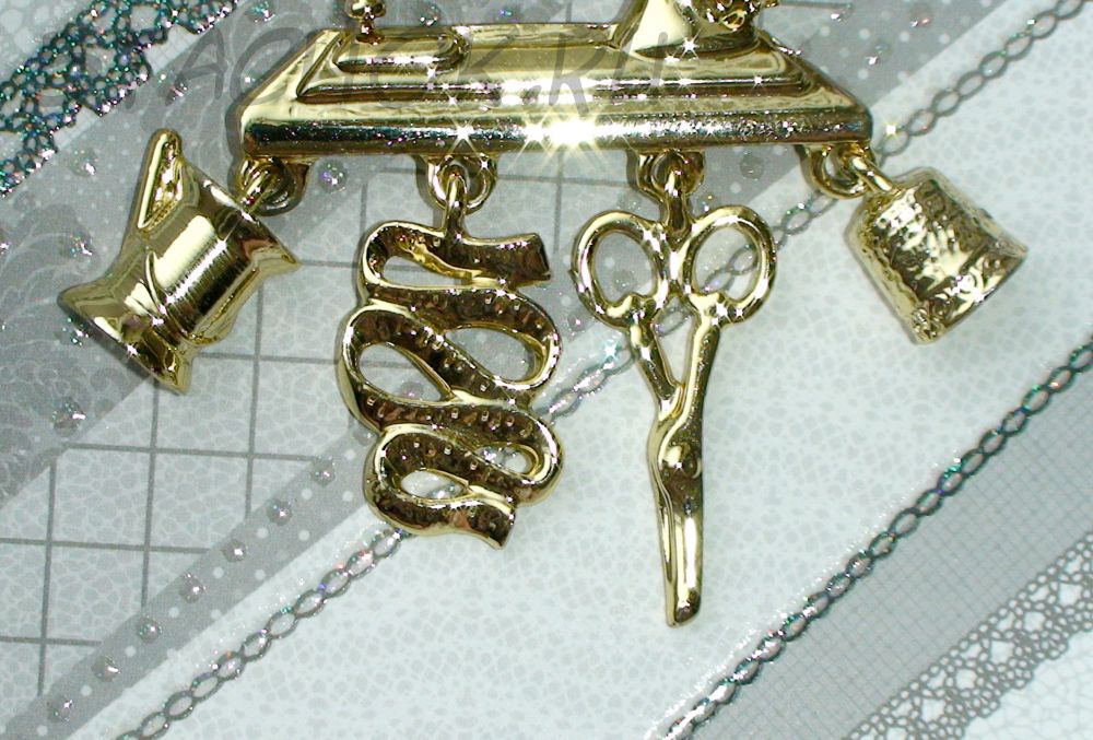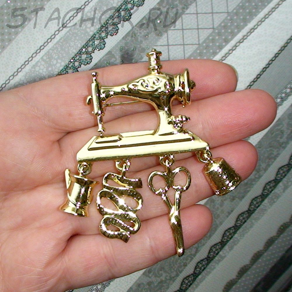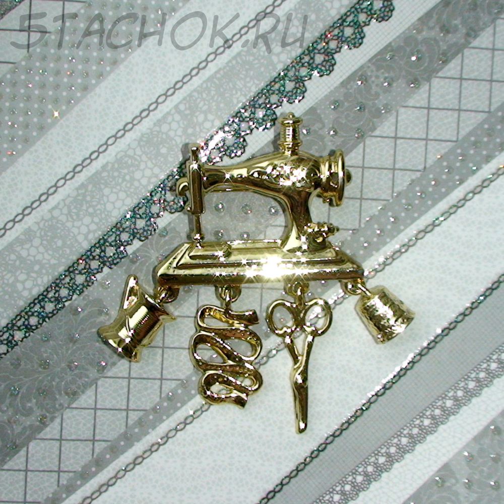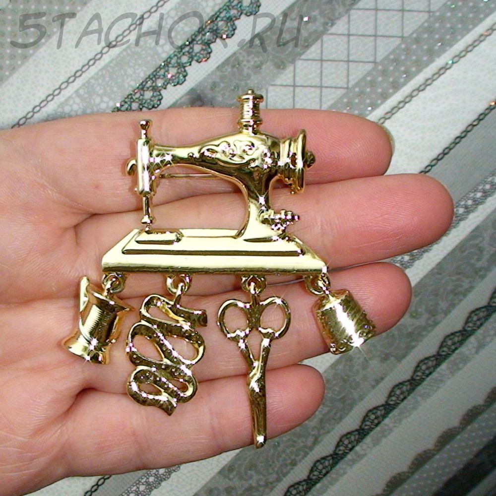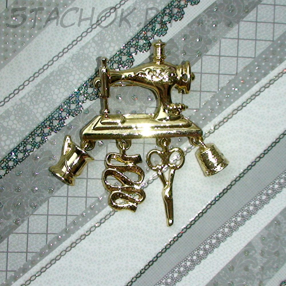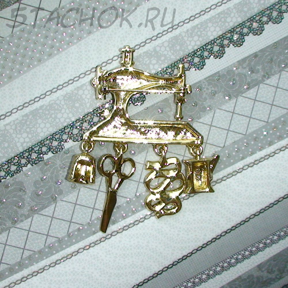 На машинке прорисованы детали. Инструменты, необходимые для портного : ножницы, шпулька с иголочкой, сантиметр и наперсток имеют подвижность относительно броши.