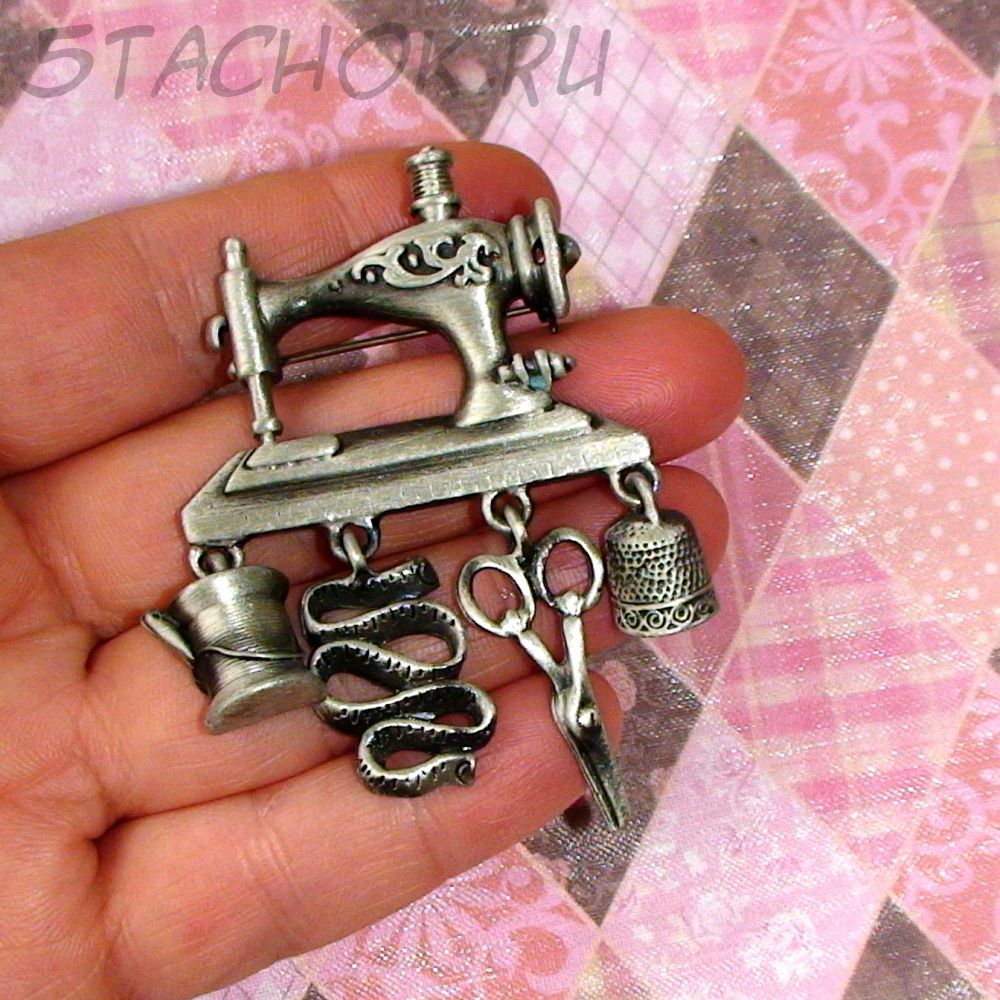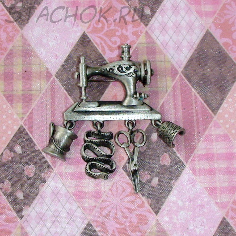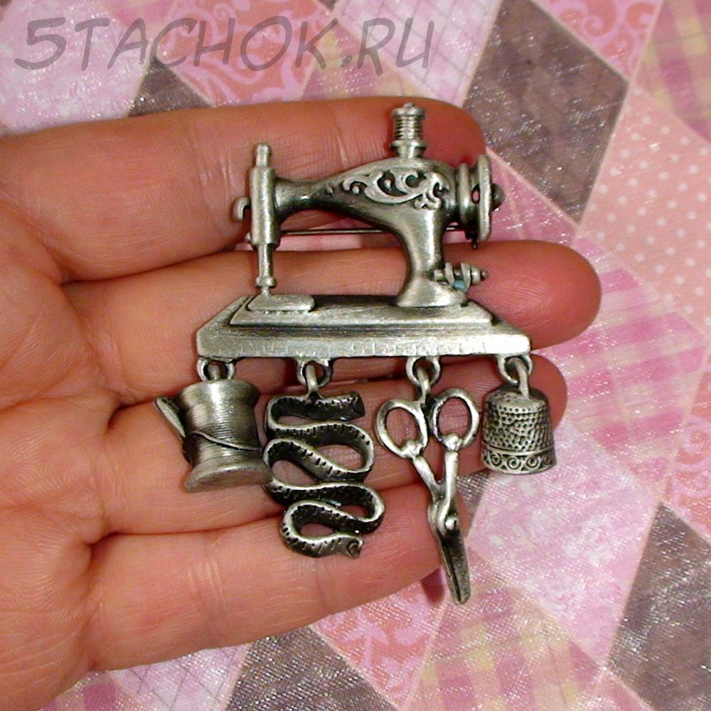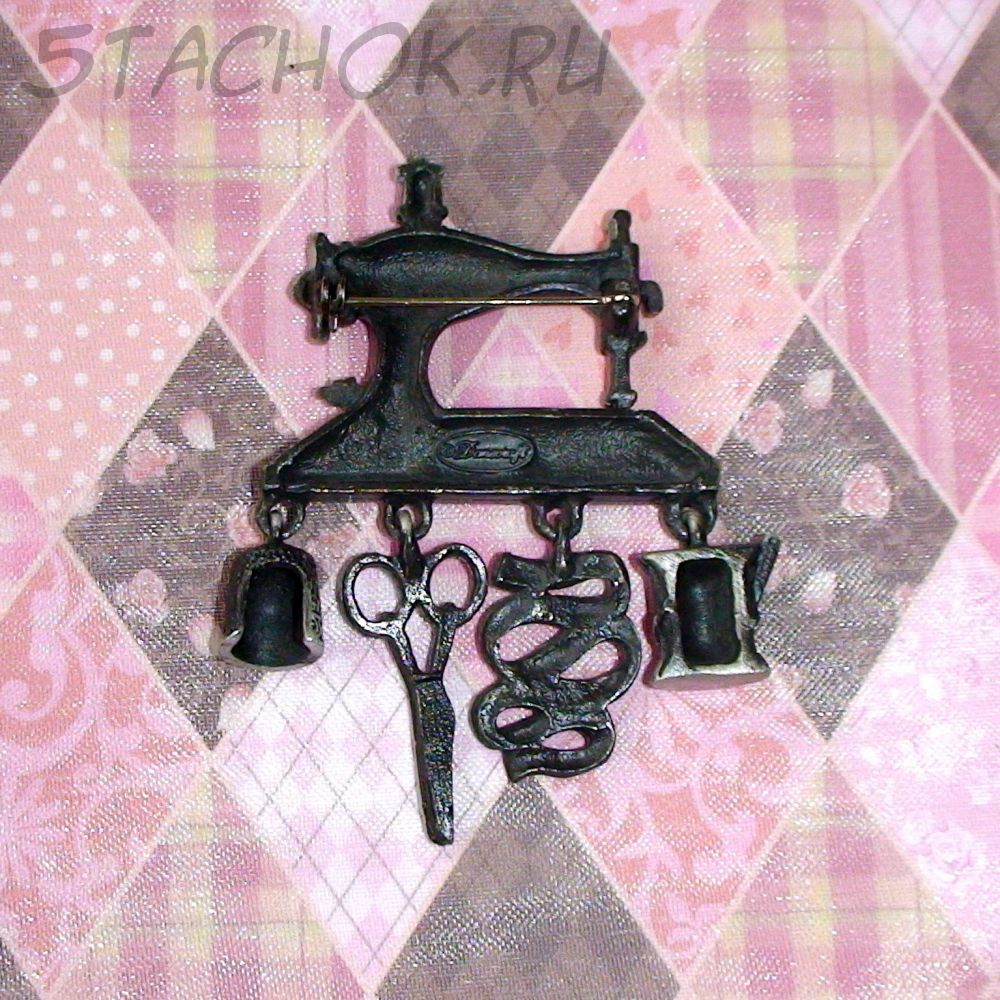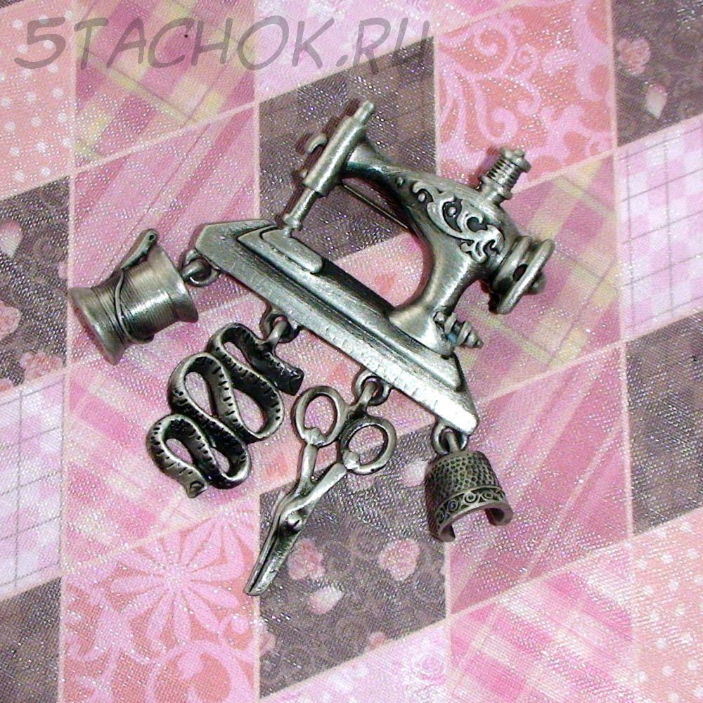 На машинке прорисованы детали. Инструменты, необходимые для портного : ножницы, шпулька с иголочкой, сантиметр и наперсток имеют подвижность относительно броши.