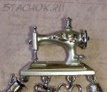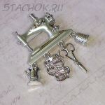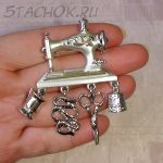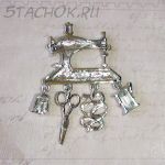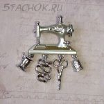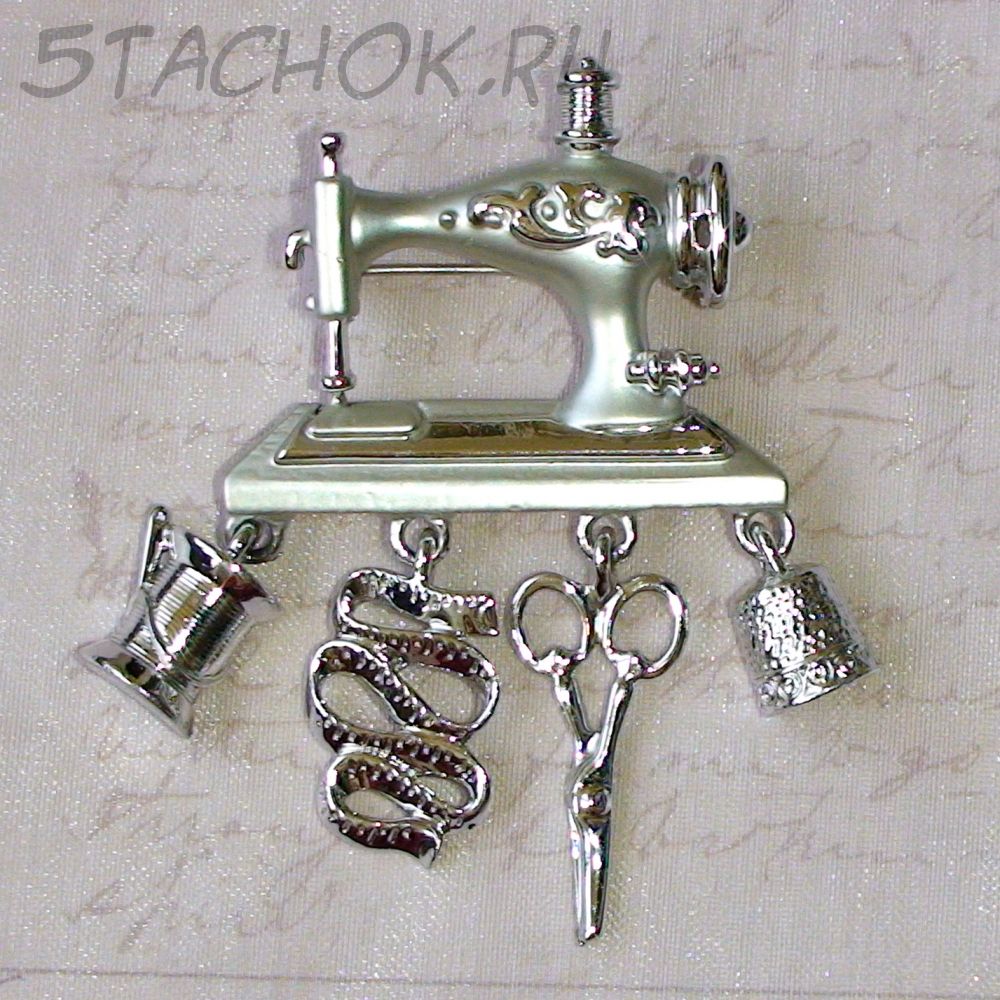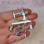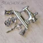 На машинке прорисованы детали. Инструменты, необходимые для портного : ножницы, шпулька с иголочкой, сантиметр и наперсток имеют подвижность относительно броши.