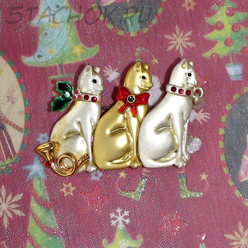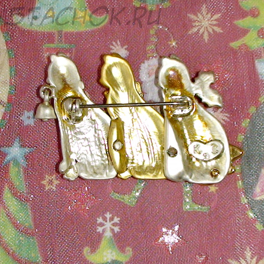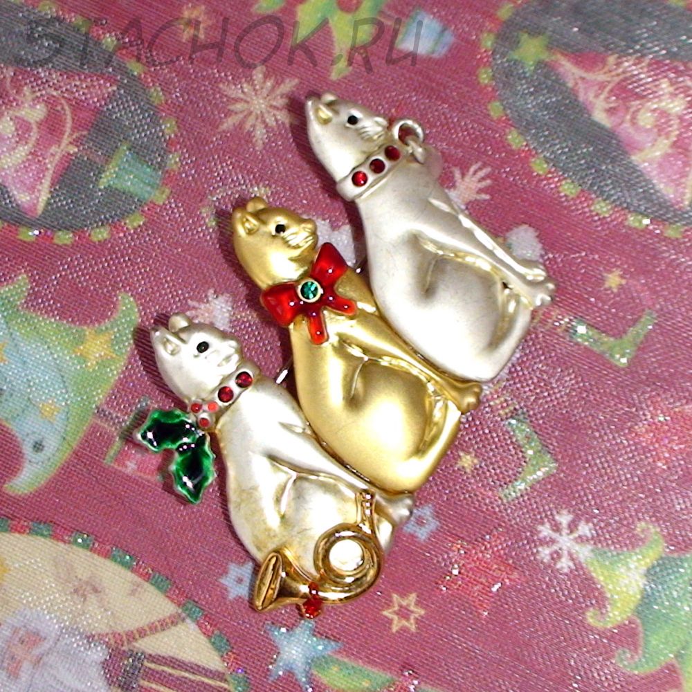 Брошь "Три новогодних котика" под золото, серебро, эмаль, стразы