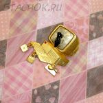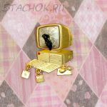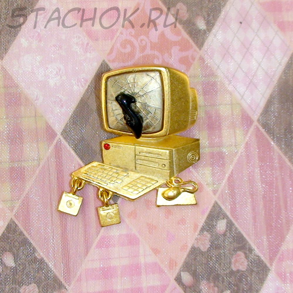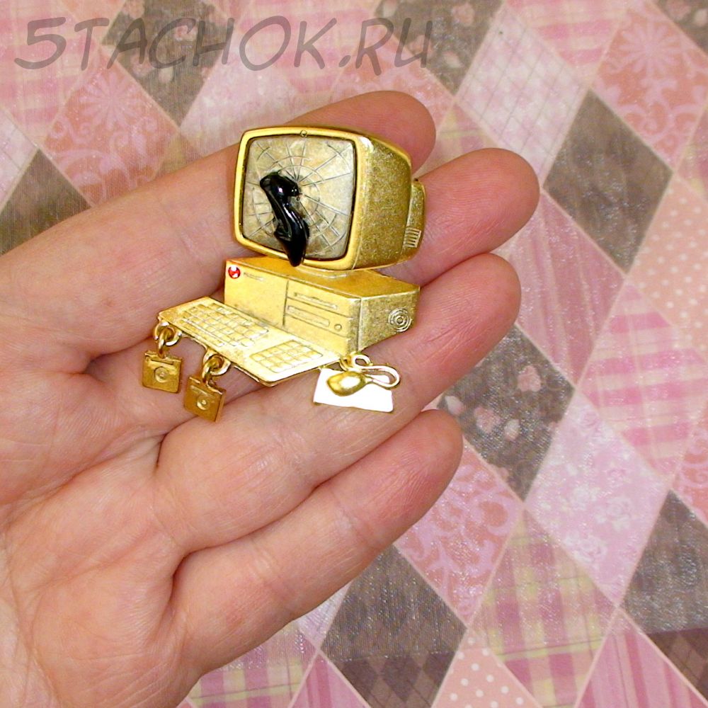 Раритетный компьютер 1980-х годов со старыми дисководами, дискетами. Кнопка питания на системном блоке сделана из красного стразика. Все детали компьютера и периферия четко прорисованы.