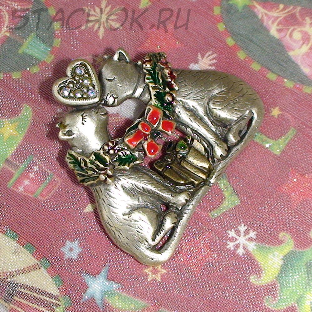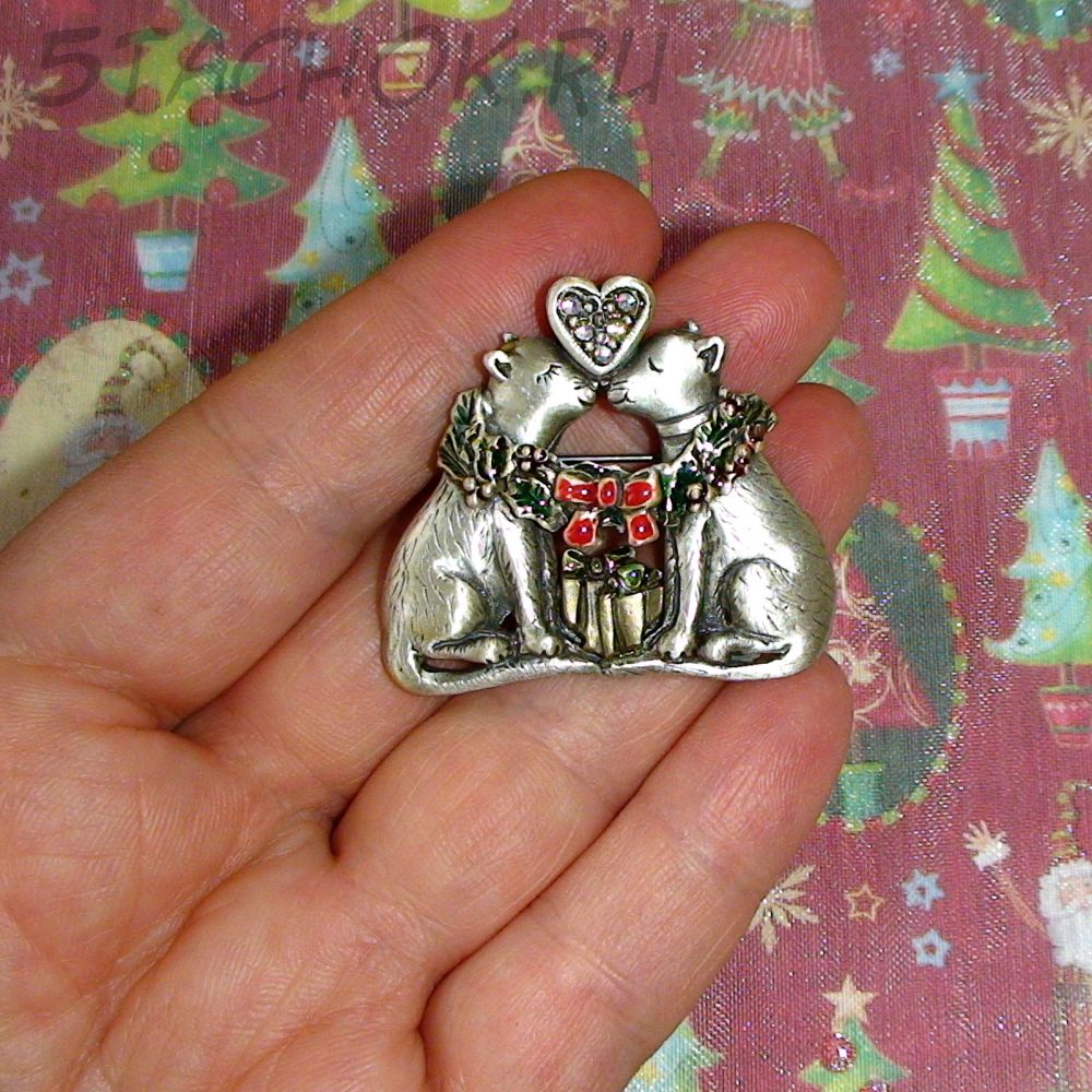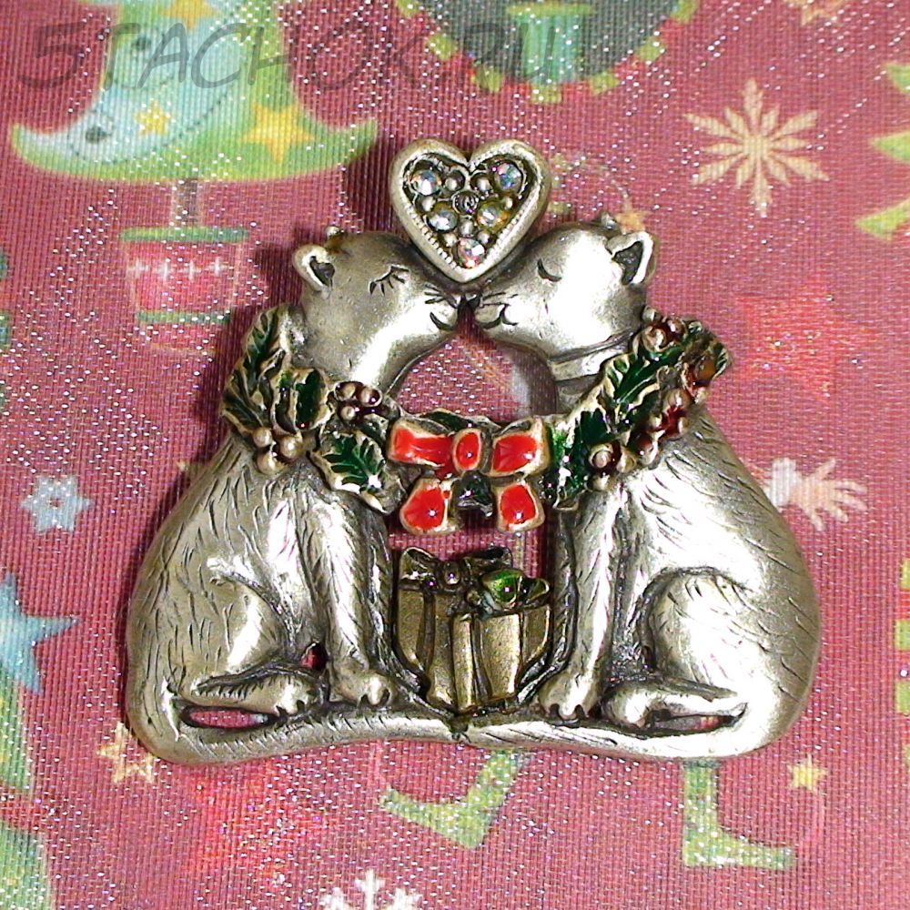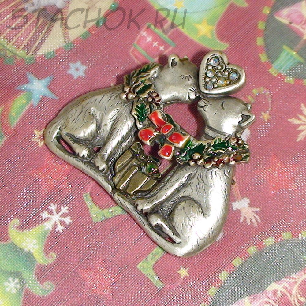 Брошь "Влюбленные котики на Новый год" под олово, эмаль, стразы