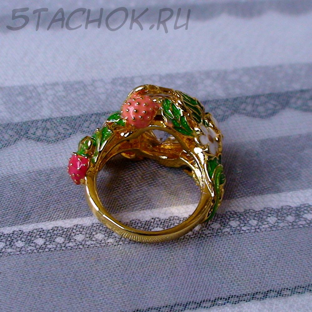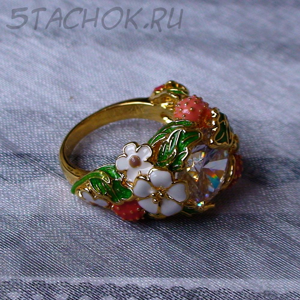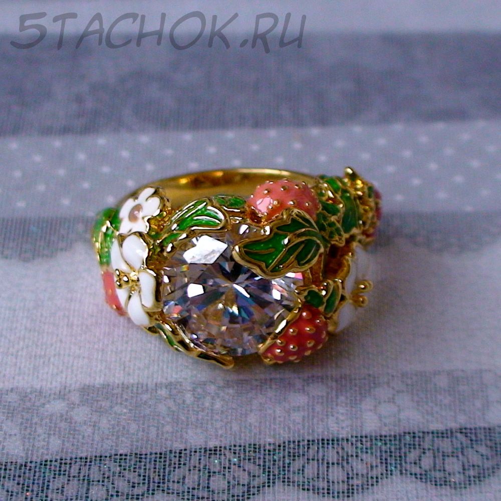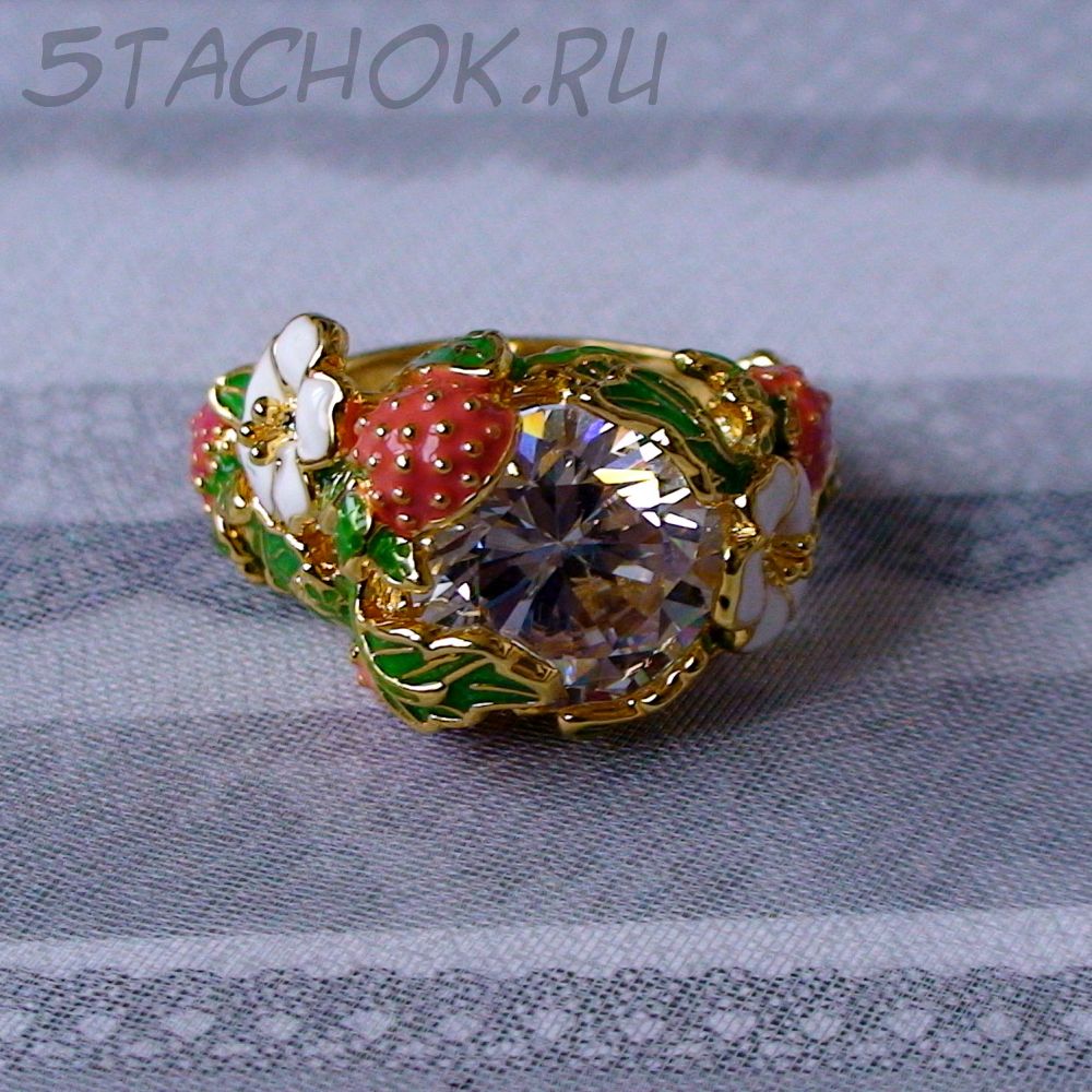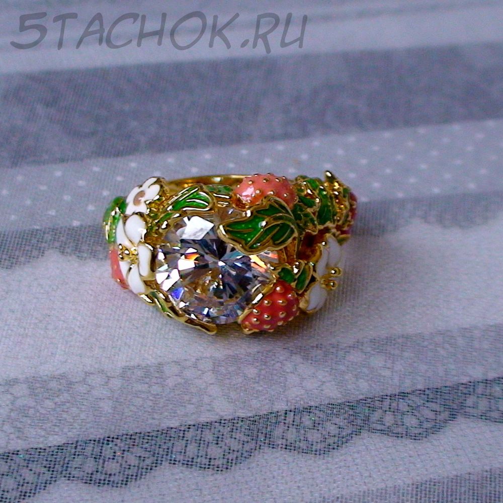 Кольцо "Земляничка" под золото, хрусталь, эмаль