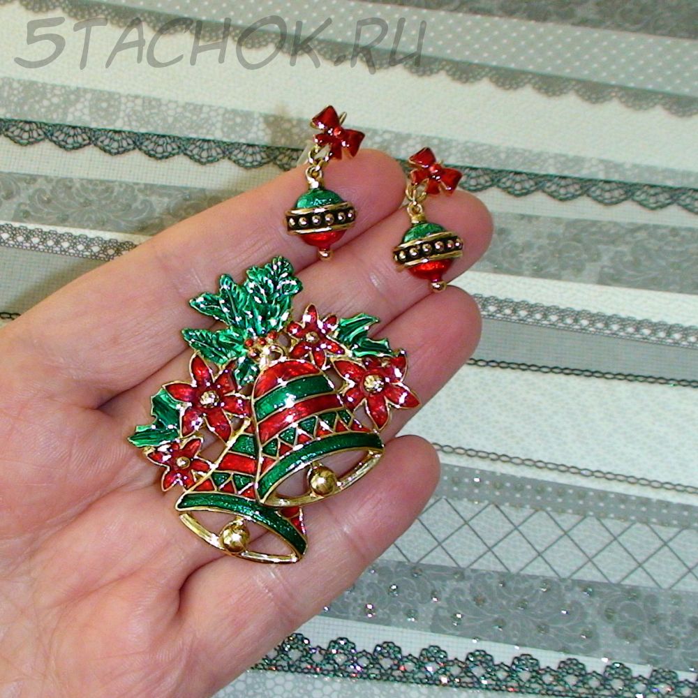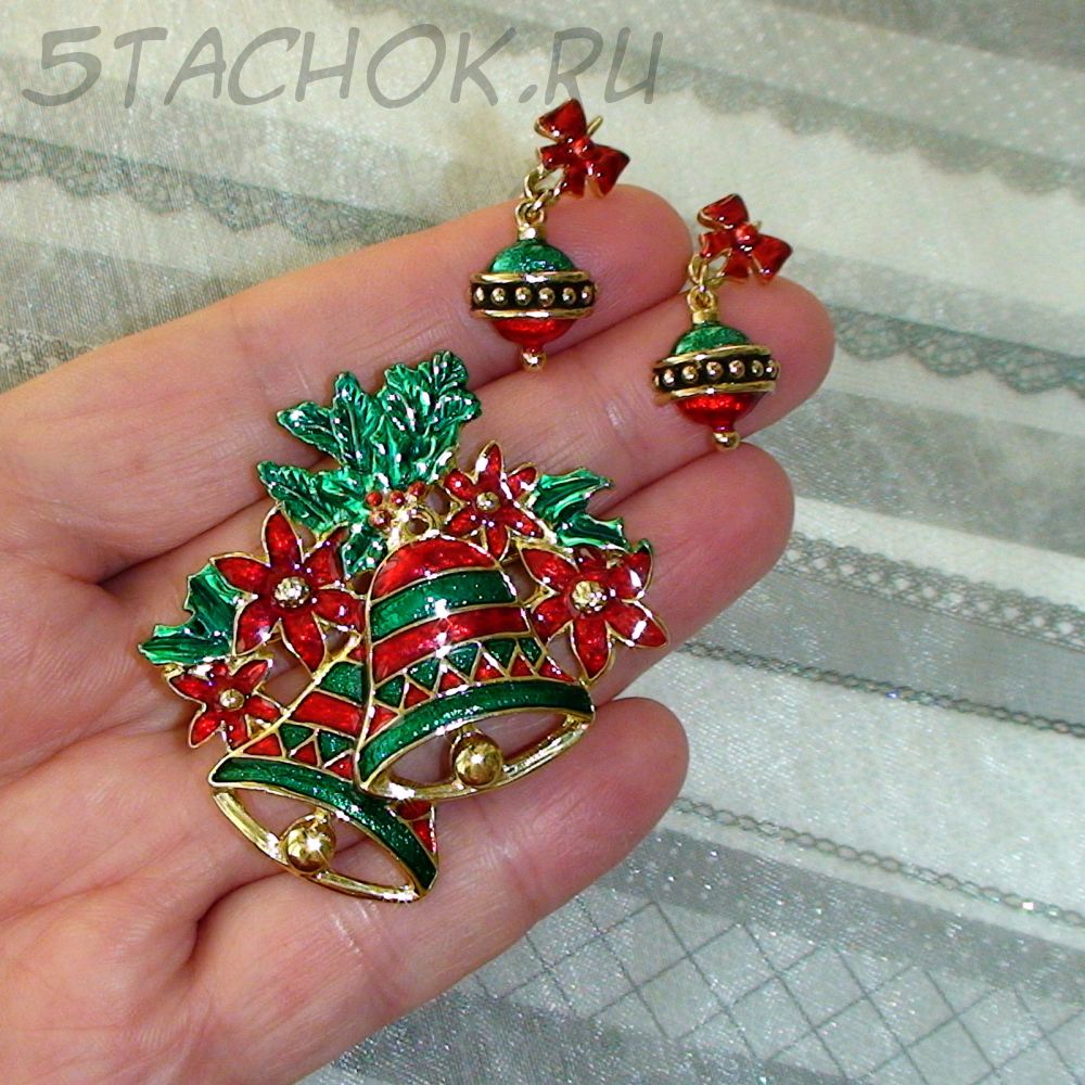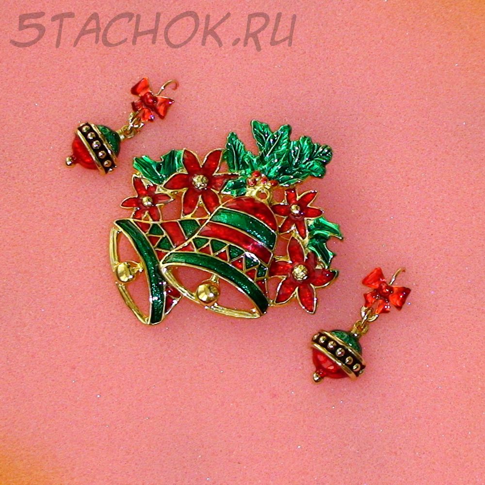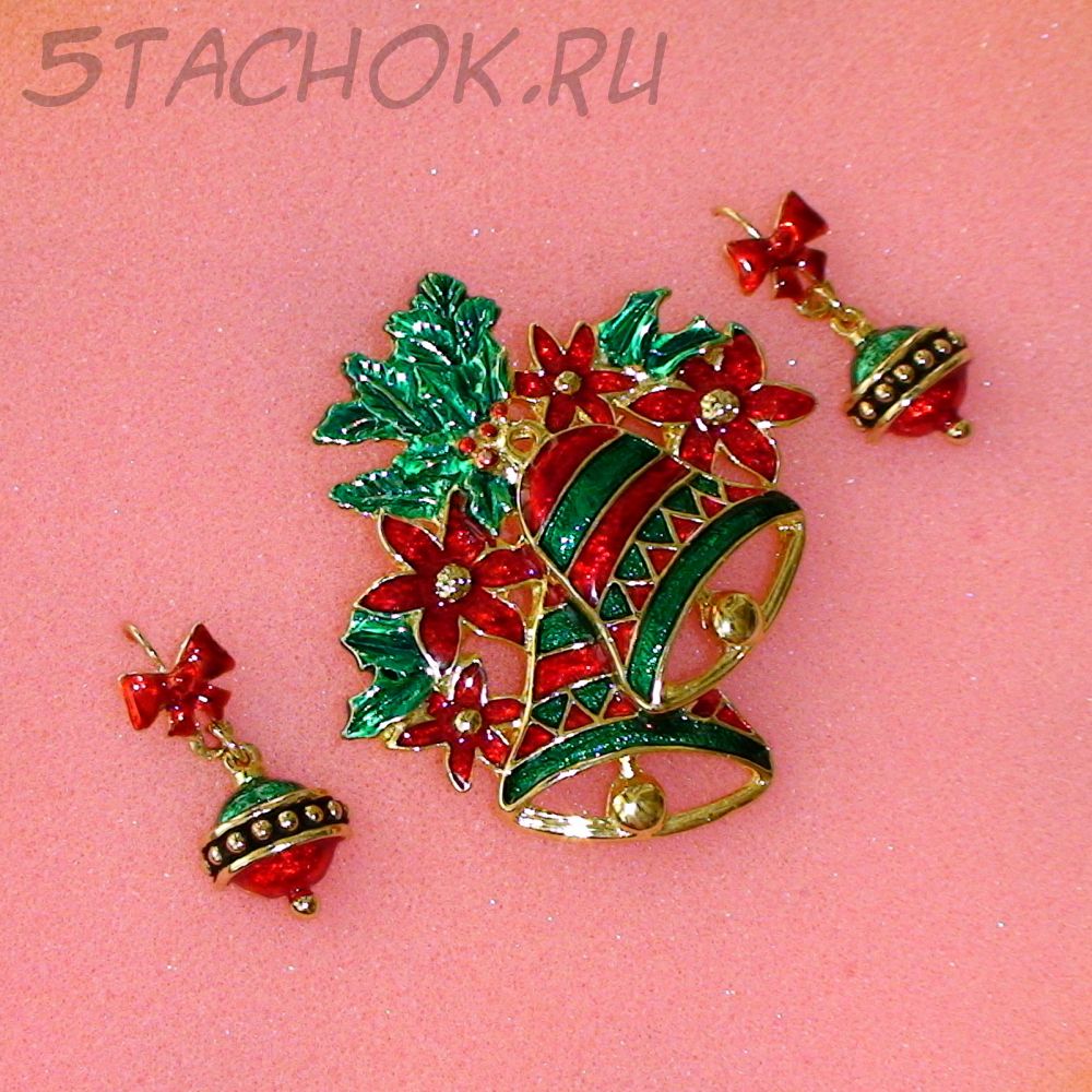 Комплект брошь и серьги "Новый год" под золото/эмаль