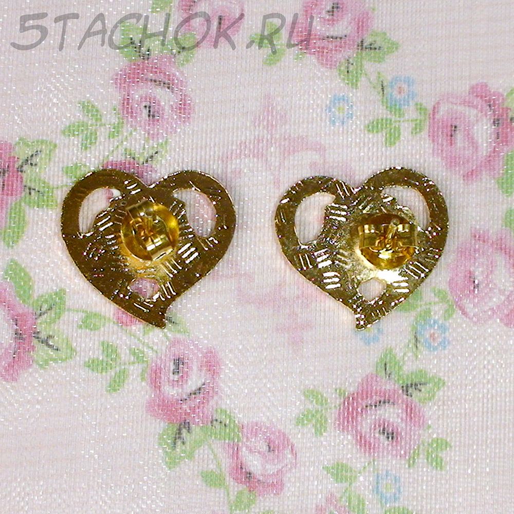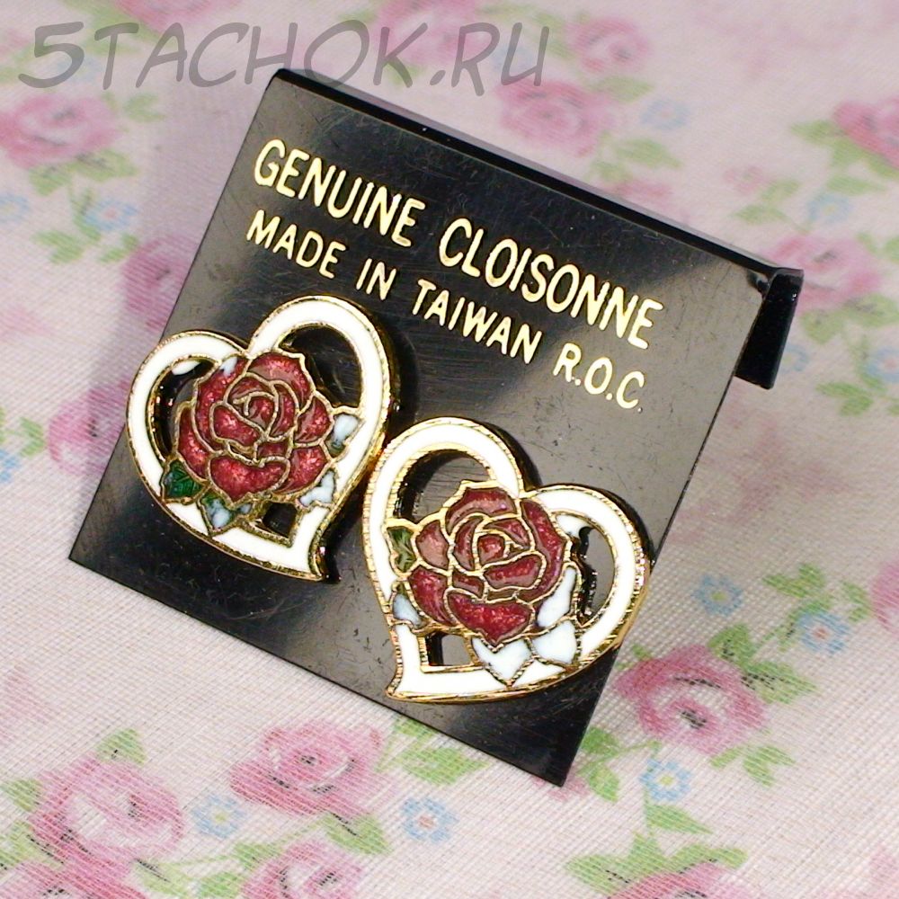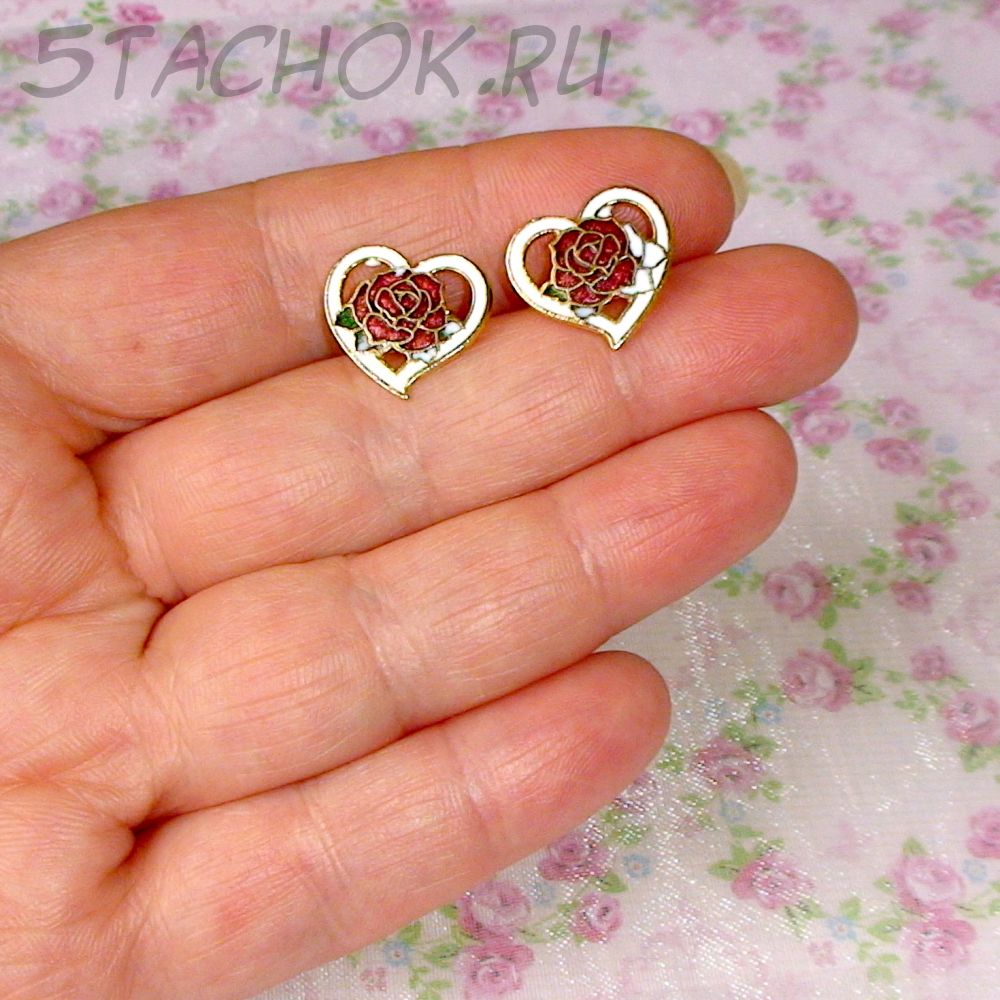 Серьги-гвоздики "Розочки-сердечки" под золото/клуазоне