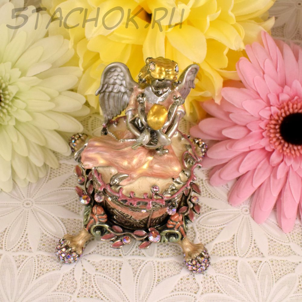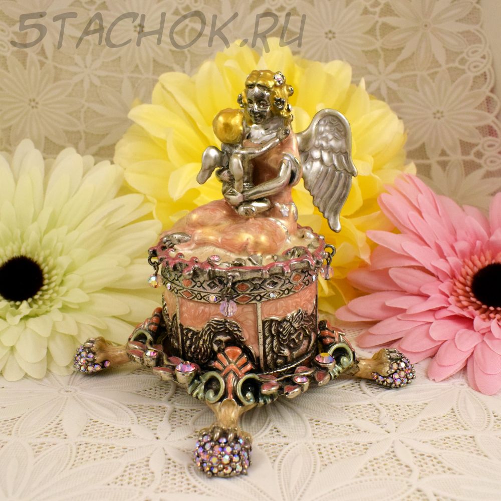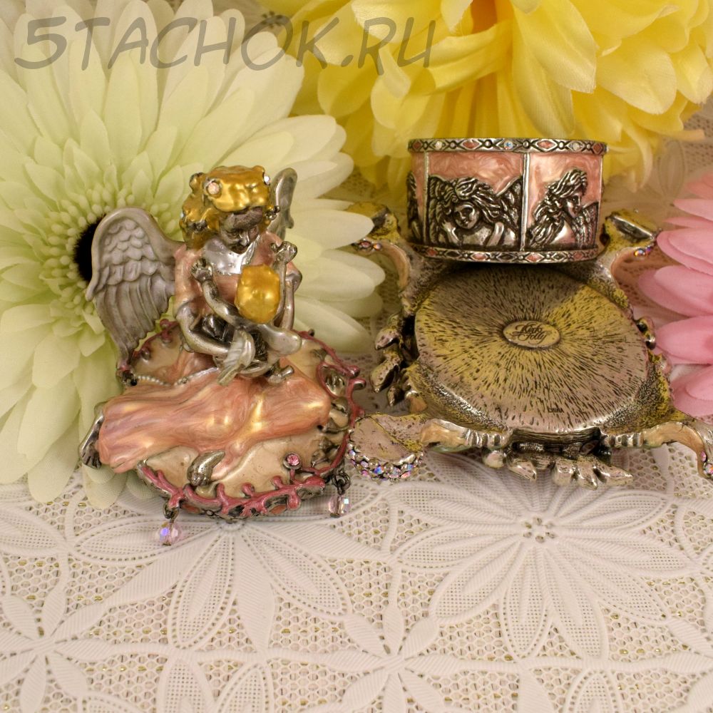 Фирменные стразы-хамелеоны от Kirks Folly завораживают своим сиянием при любом освещении. Перламутровая эмаль нежных пастельных тонов. Шкатулка состоит из трех частей: основание, шкатулка и крышечка. На шкатулке изображены херувимы. Прорисованы все мельчайшие детали ангелов.