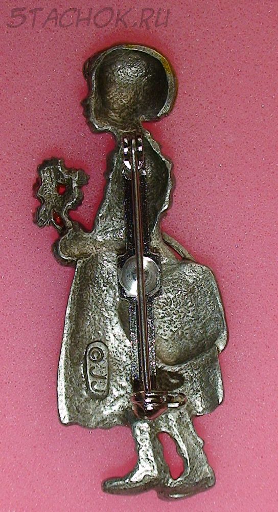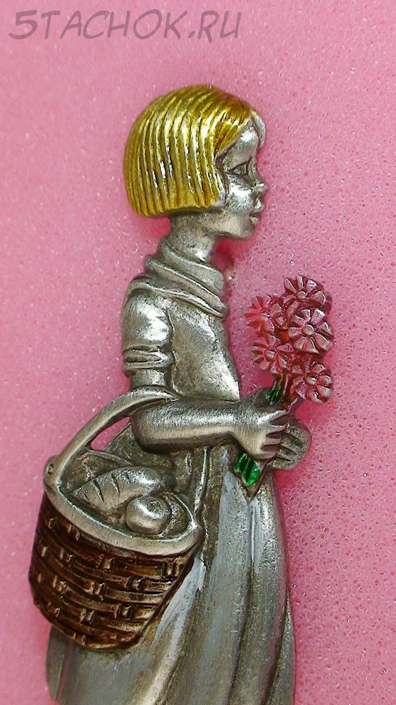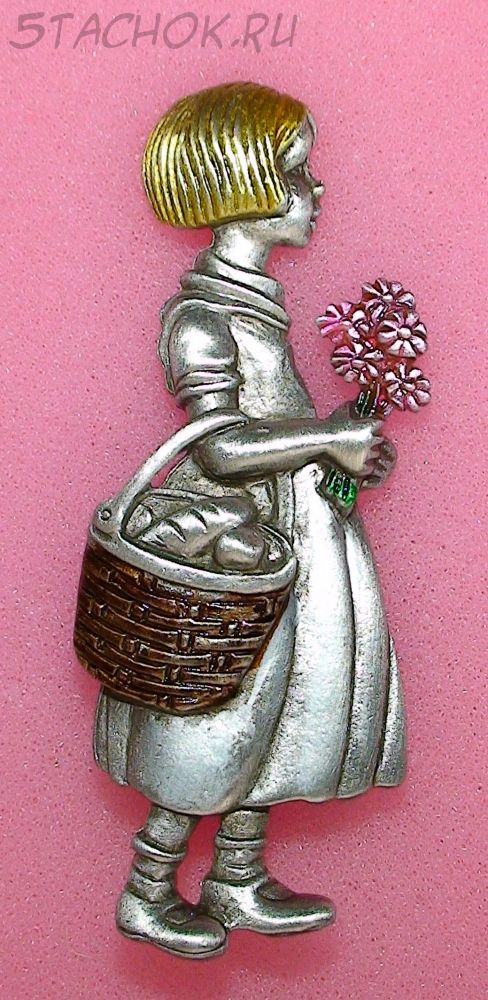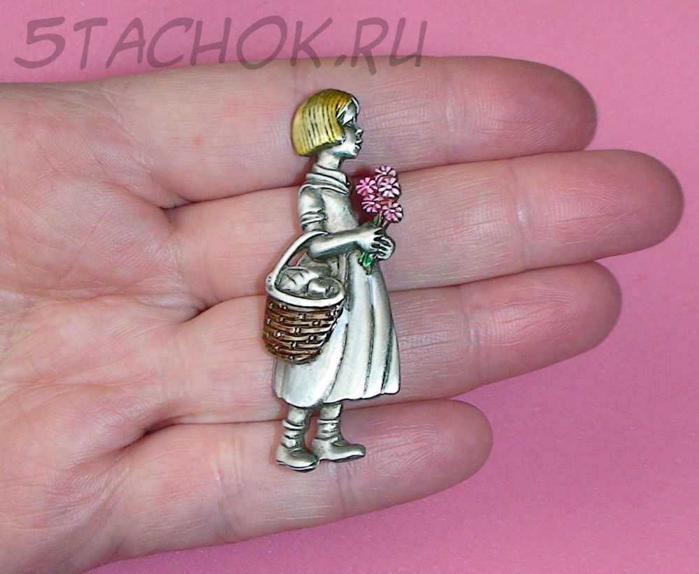 Брошь "Девочка с цветком и корзинкой" под олово, ювелирная эмаль