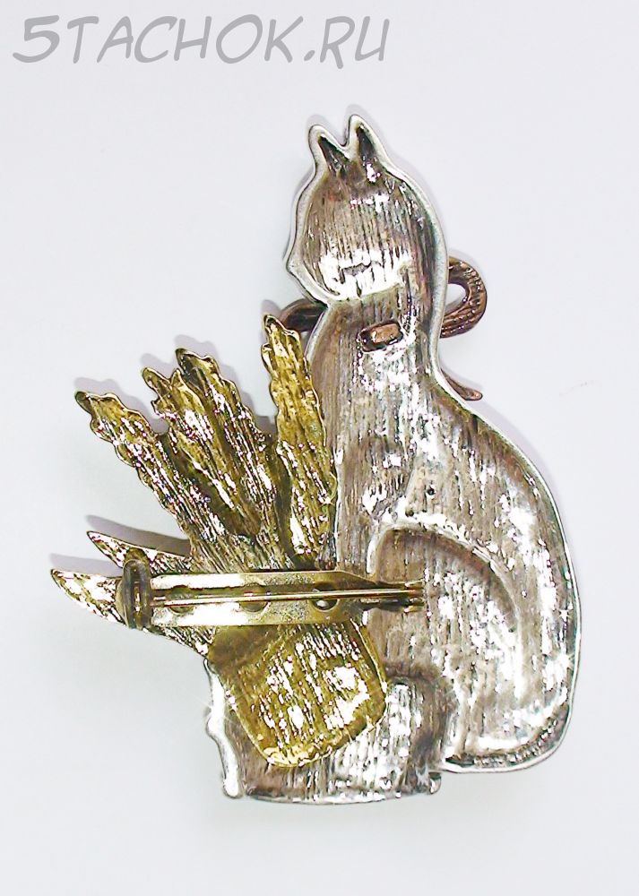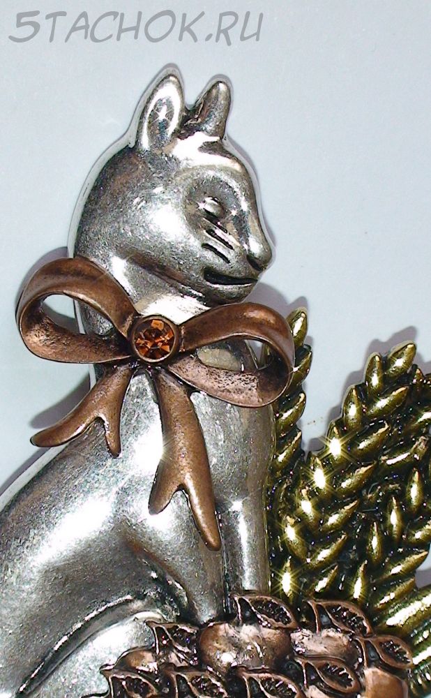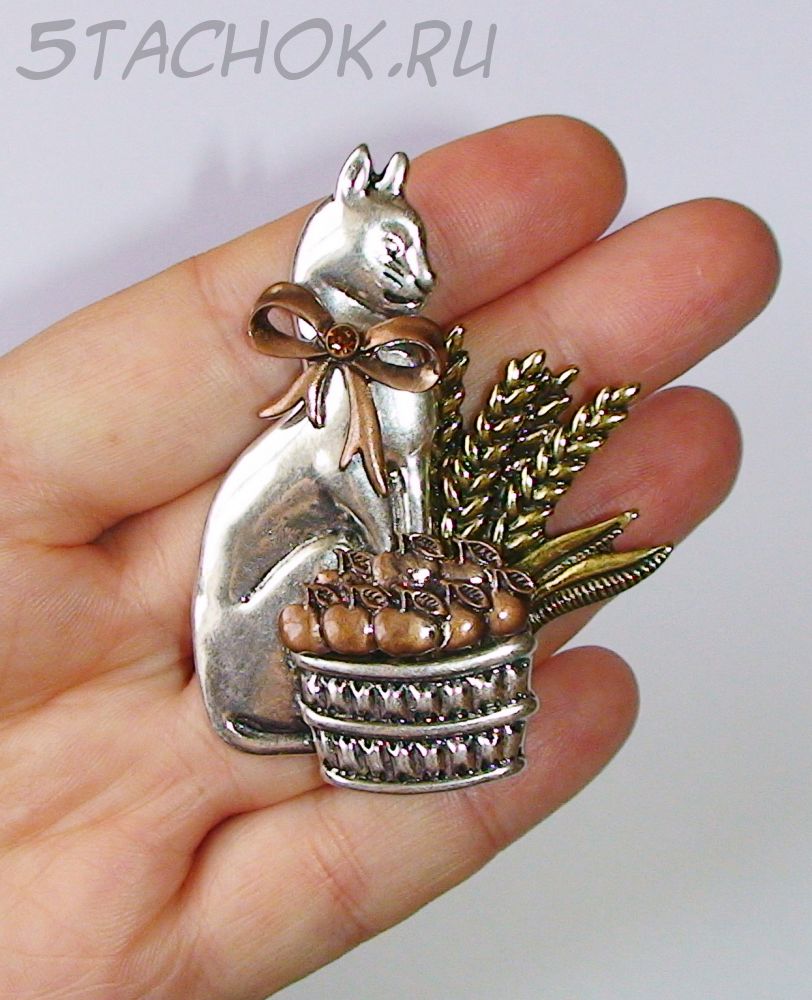 Кошечка и корзинка выполнены в материале под блестящее серебро, бантик и яблоки - под блестящую медь, а колоски под блестящую бронзу. На бантике кошечки ярко переливается камушек!