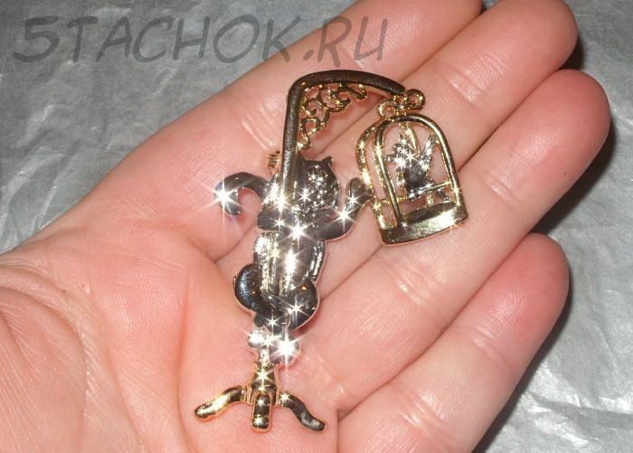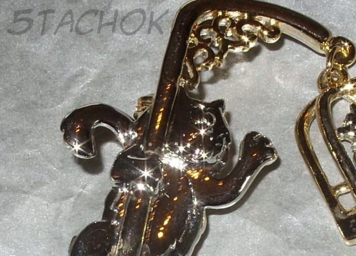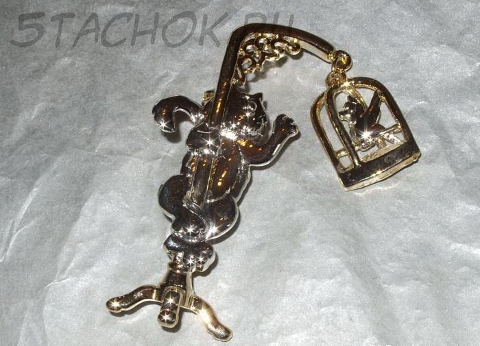 Брошь "Кот и попугай в клетке" под серебро и золото