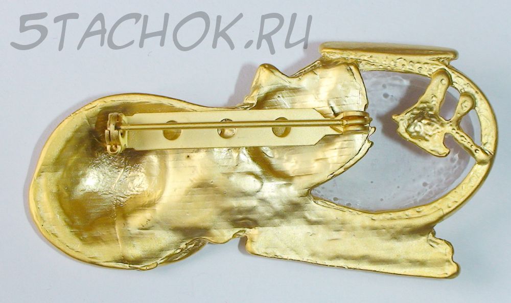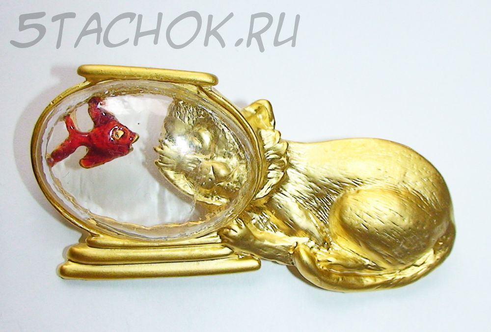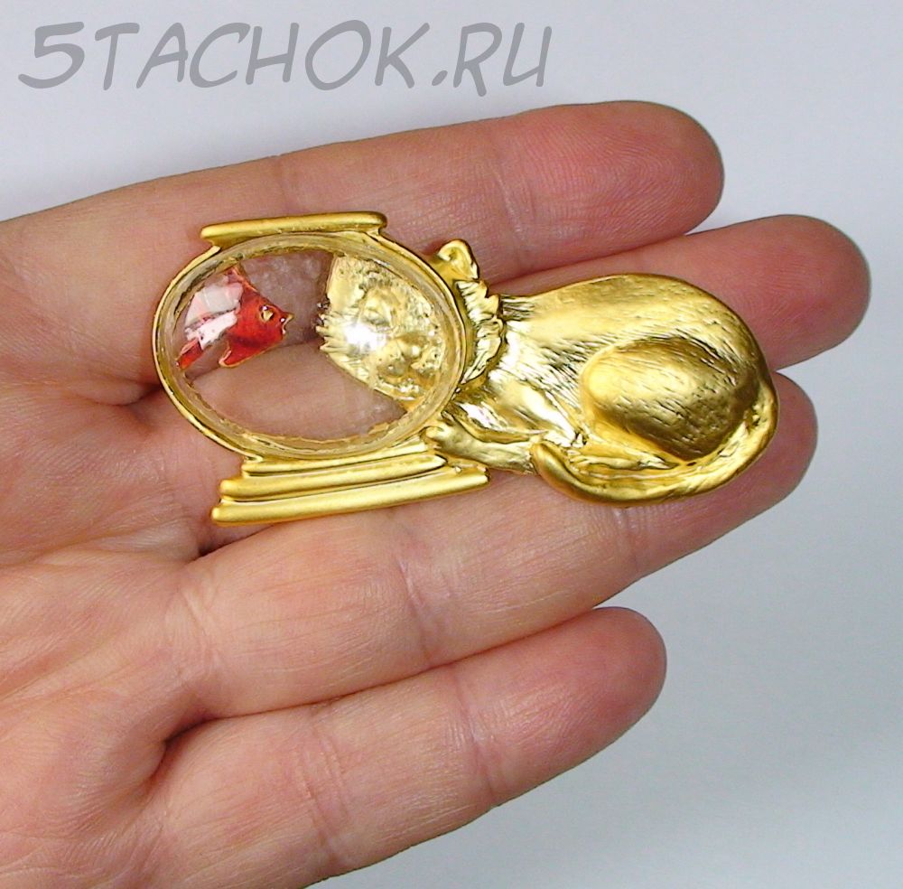 Брошь "Котик гипнотизирует рыбку " под золото/эмаль/оргстекло