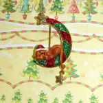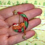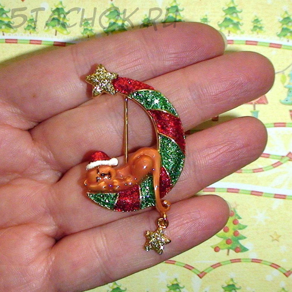 Котик в новогоднем колпаке заснул на полумесяце. Котик выполнен в перламутровой эмали карамельного цвета. Луна, звездочки и колпачек покрыты яркими разноцветными блестками. Звездочка имеет подвижность относительно полумесяца.