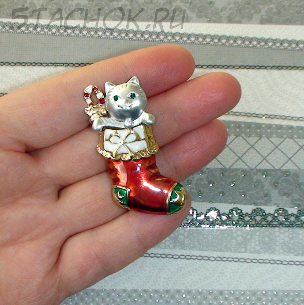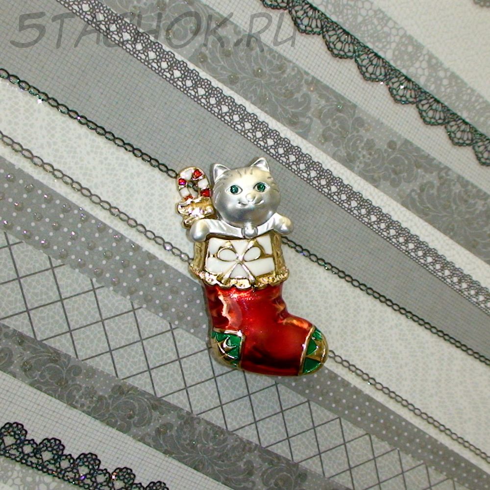Брошь "Новогодний подарочек - котик" под золото/серебро/эмаль/стразы