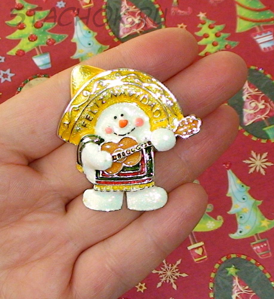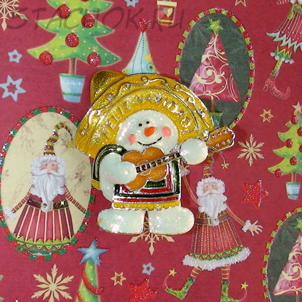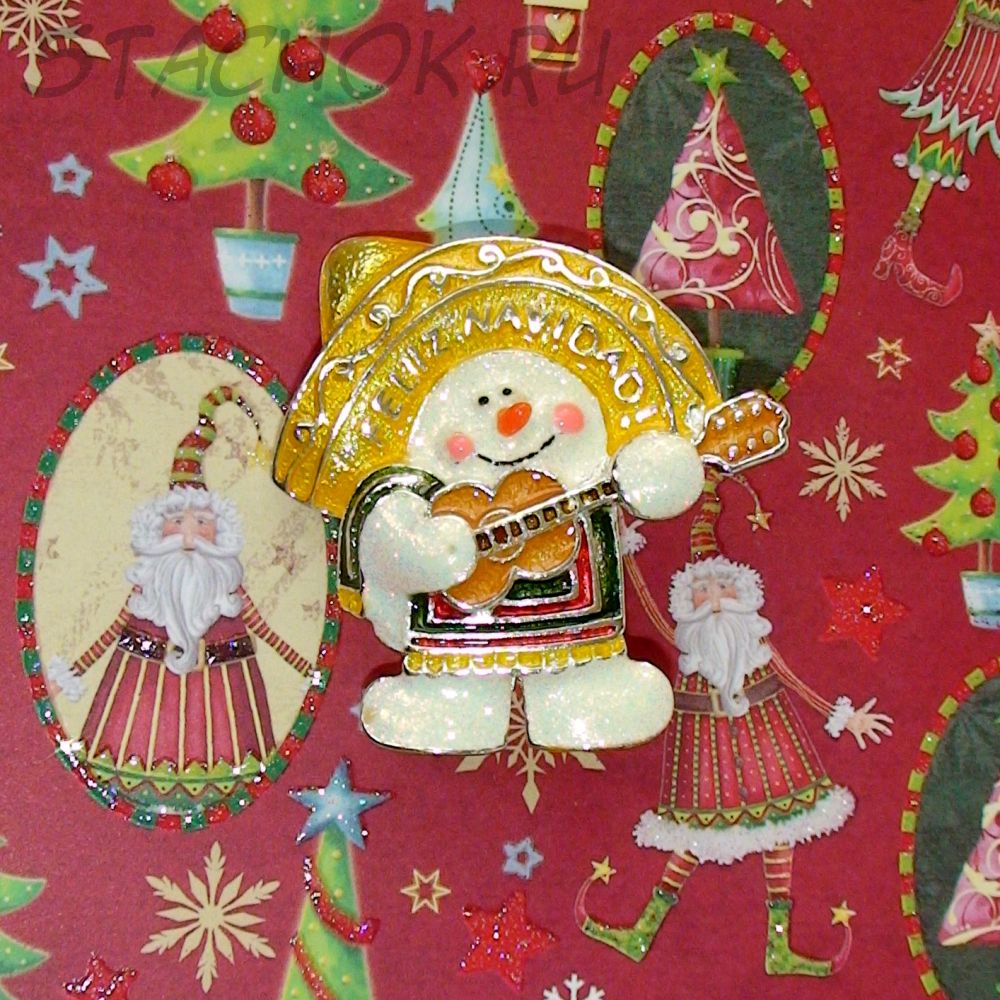 Брошь "Рождественский Снеговик с гитарой" под серебро, эмаль