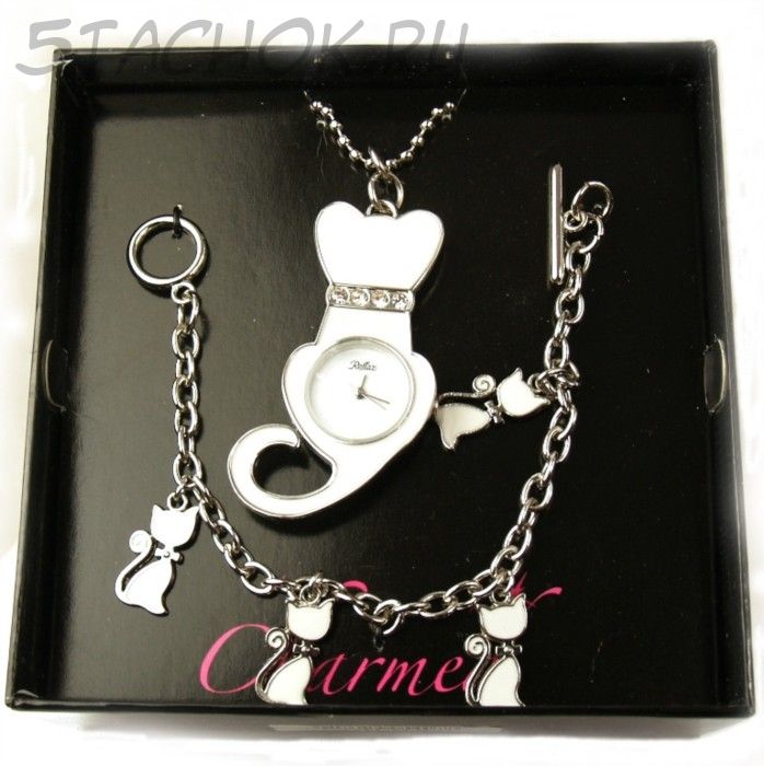 Нежный набор часиков в виде кулона и браслет с котятами. Подойдет как женщине любого возраста, так и молодой девушке. Выполнены в белом, розовом и черном цветах
